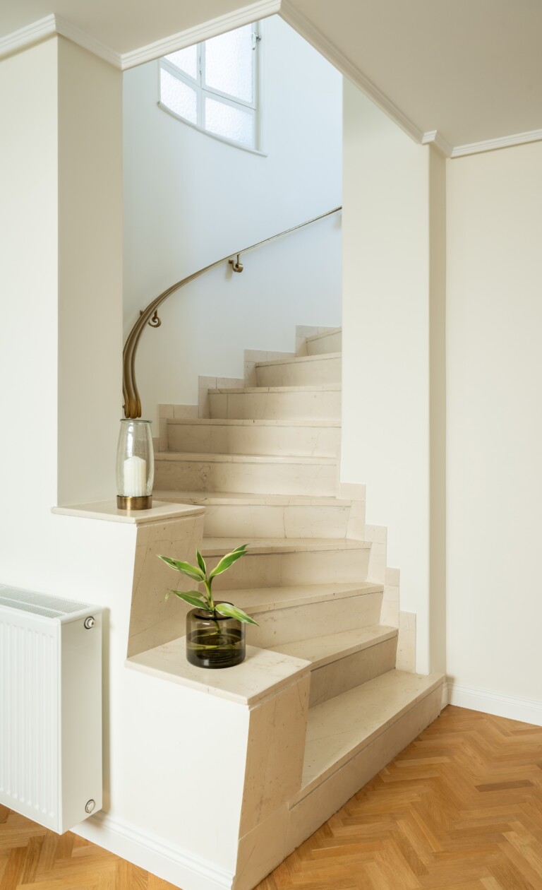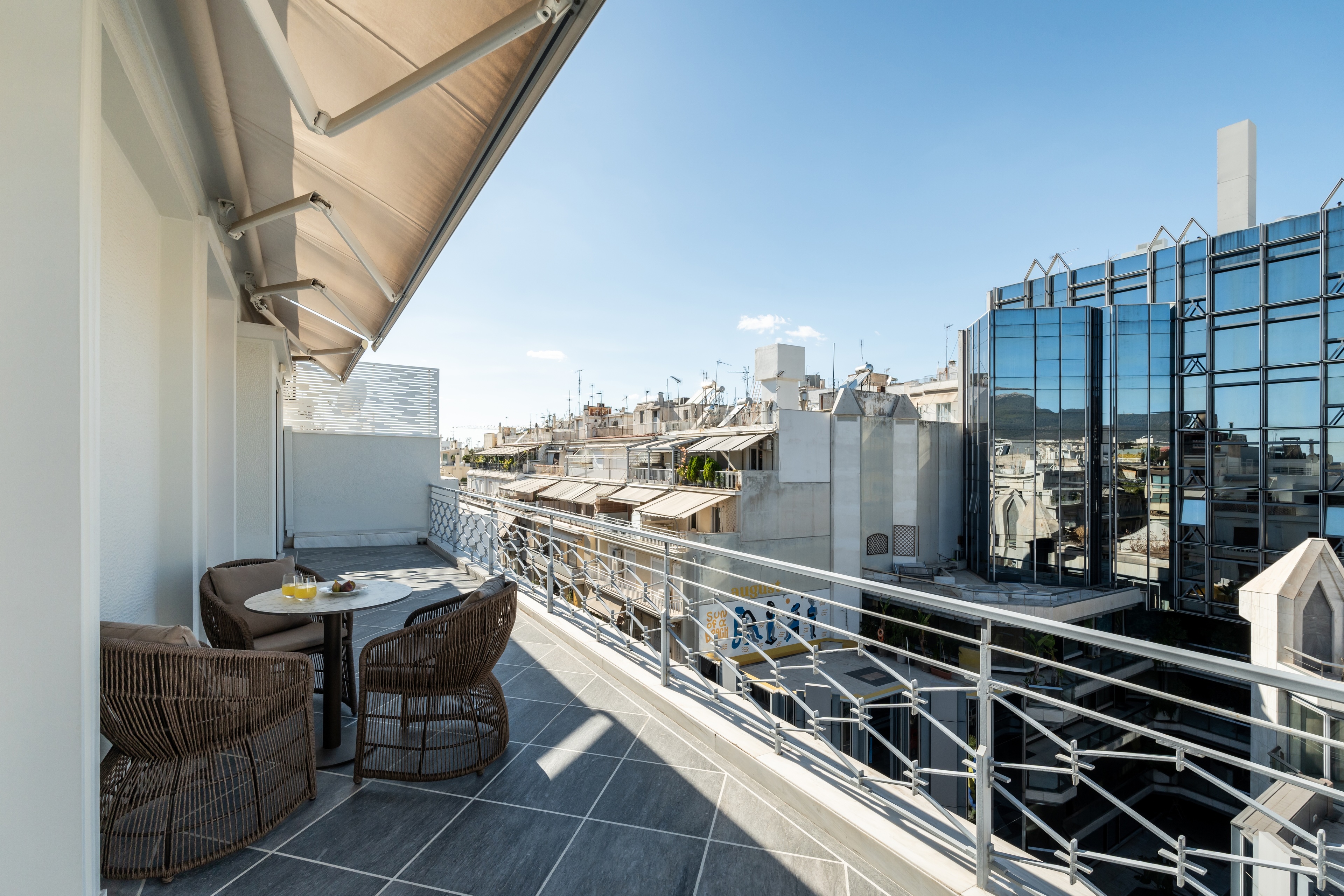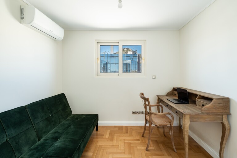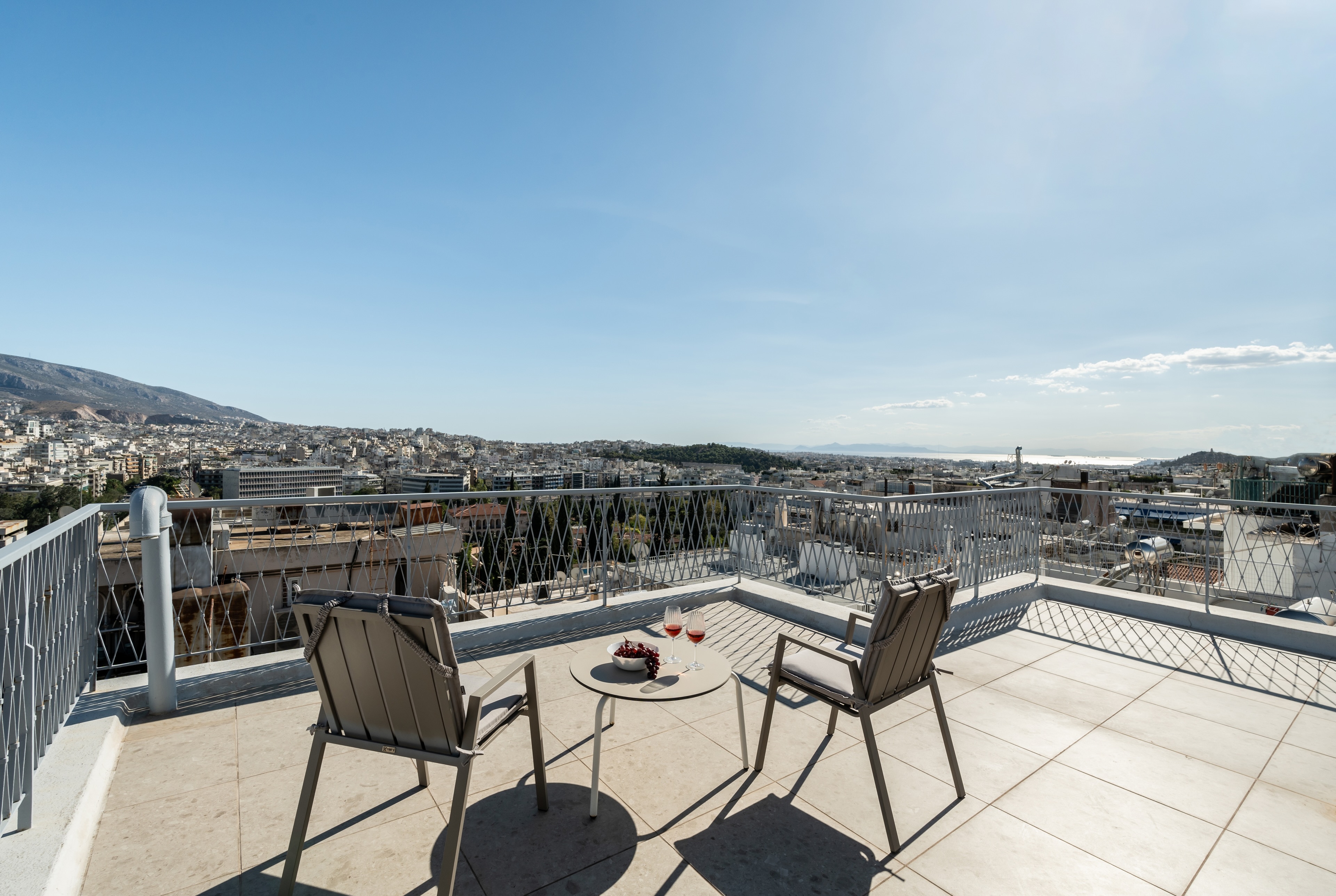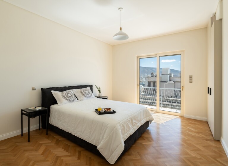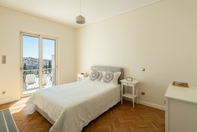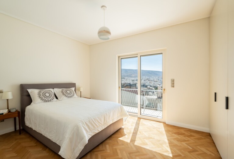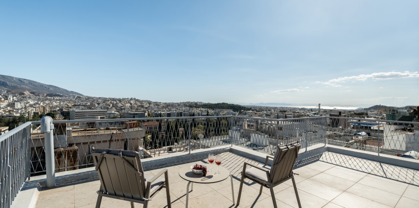 Το ανώτερο επίπεδο, στο οποίο οδηγεί μια μαρμάρινη σκάλα, παρέχει έναν ευέλικτο χώρο με δικό του μπάνιο, που μπορεί να χρησιμοποιηθεί ως γραφείο, σουίτα επισκεπτών ή πρόσθετο υπνοδωμάτιο. Αυτό το επίπεδο επεκτείνεται σε μια γενναιόδωρη ιδιωτική βεράντα στην ταράτσα, με πανοραμική θέα στην πόλη και παρέχοντας έναν εξαιρετικό χώρο για χαλάρωση, φαγητό ή διασκέδαση κάτω από τον αθηναϊκό ουρανό.