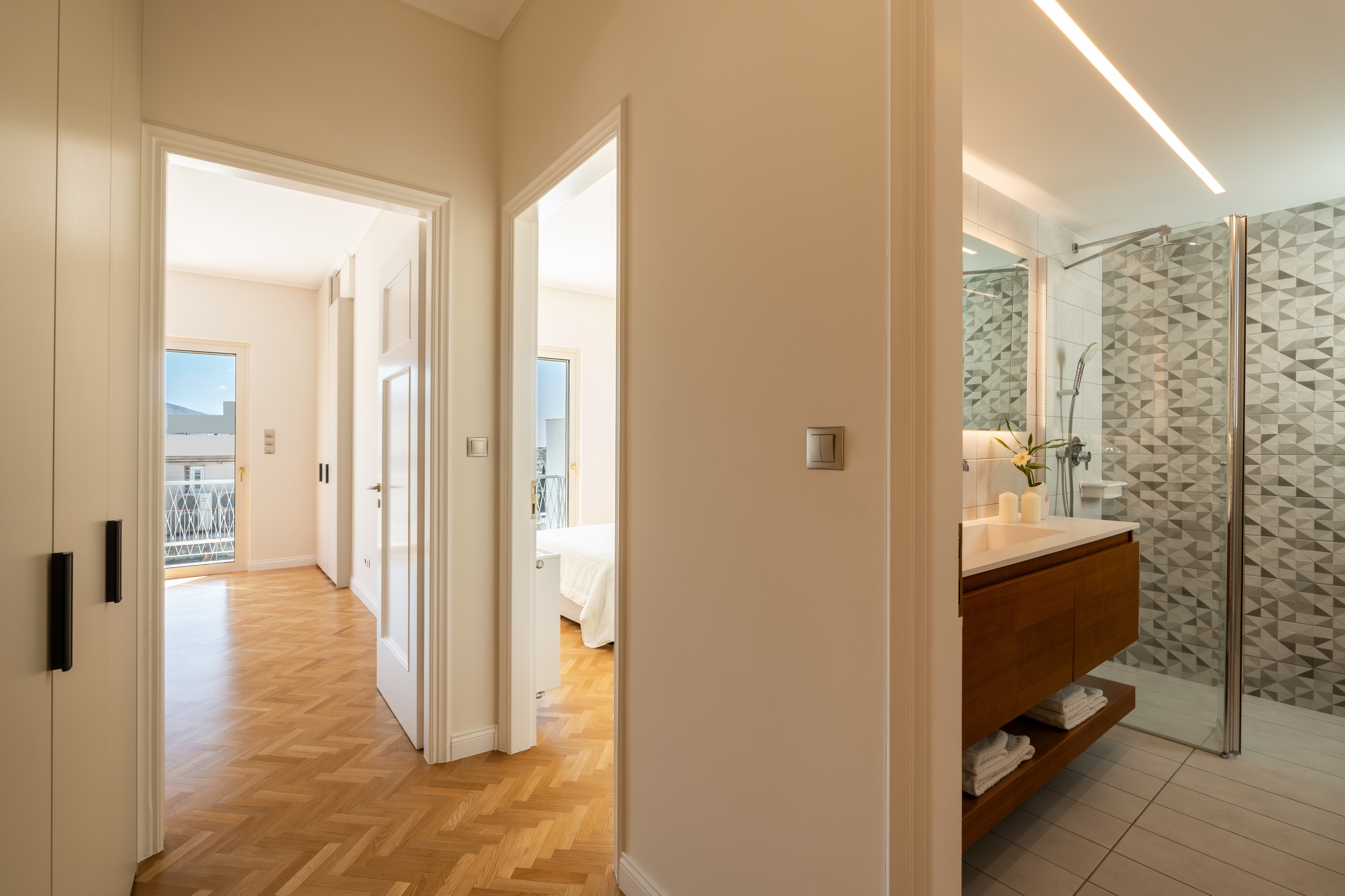 Το κύριο επίπεδο περιλαμβάνει επίσης ένα όμορφα διακοσμημένο ιδιωτικό υπνοδωμάτιο με ιδιωτικό μπαλκόνι - ιδανικό σκηνικό για τον πρωινό καφέ με θέα στην πόλη - καθώς και δύο επιπλέον υπνοδωμάτια, ένα καλά εξοπλισμένο μπάνιο και ένα μπάνιο επισκεπτών.