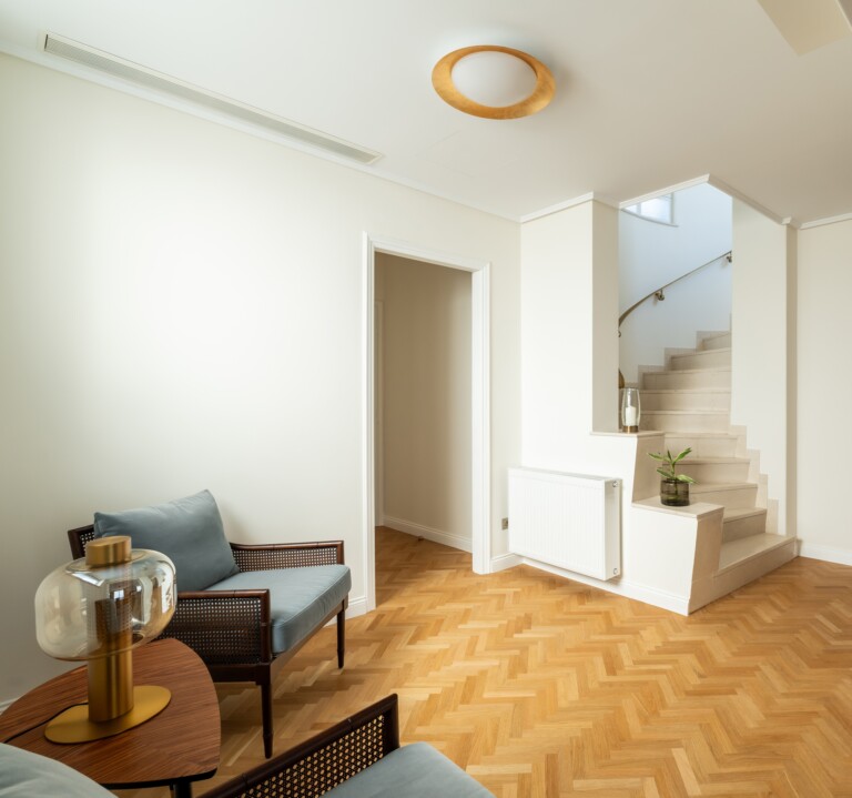 Στον 6ο όροφο ενός καλοδιατηρημένου κτιρίου, αυτό το διαμέρισμα δύο επιπέδων διαθέτει ιδιωτική βεράντα στην ταράτσα, συνδυάζοντας την εσωτερική κομψότητα με την εξωτερική γαλήνη. Το φωτεινό κύριο επίπεδο προσφέρει ένα ευάερο καθιστικό με ξύλινες πινελιές και φυσικό φως, που καταλήγει σε μια πλήρως εξοπλισμένη μοντέρνα κουζίνα σχεδιασμένη για άνεση και διασκέδαση.