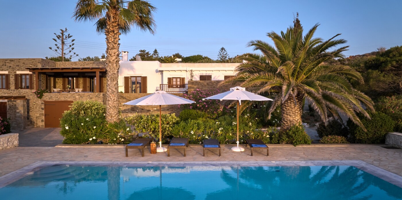 Το μπροστινό μέρος της βίλας διαθέτει μια δελεαστική πισίνα, που σας καλεί να χαλαρώσετε και να απολαύσετε χαλαρές βουτιές κατά τη διάρκεια της ημέρας. Οι όμορφες βεράντες προσφέρουν το τέλειο σκηνικό για μεγάλα καλοκαιρινά βράδια, τρώγοντας στο ύπαιθρο κάτω από τους μαγευτικούς φοίνικες.