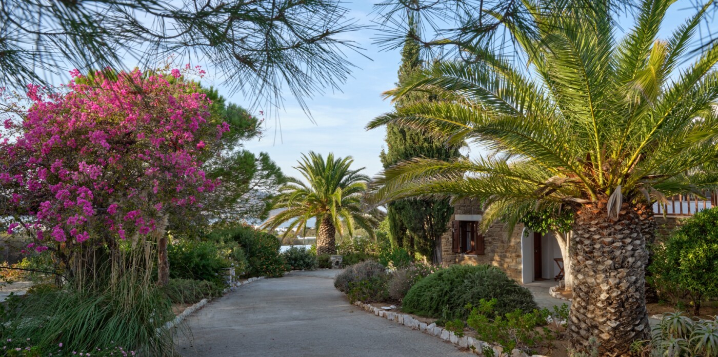 Απομονωμένη και ιδιωτική, η Palmelia βρίσκεται μέσα σε καταπράσινους κήπους, προσφέροντας εκπληκτική θέα τόσο στη θάλασσα όσο και στα βουνά.
