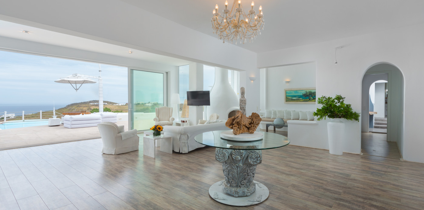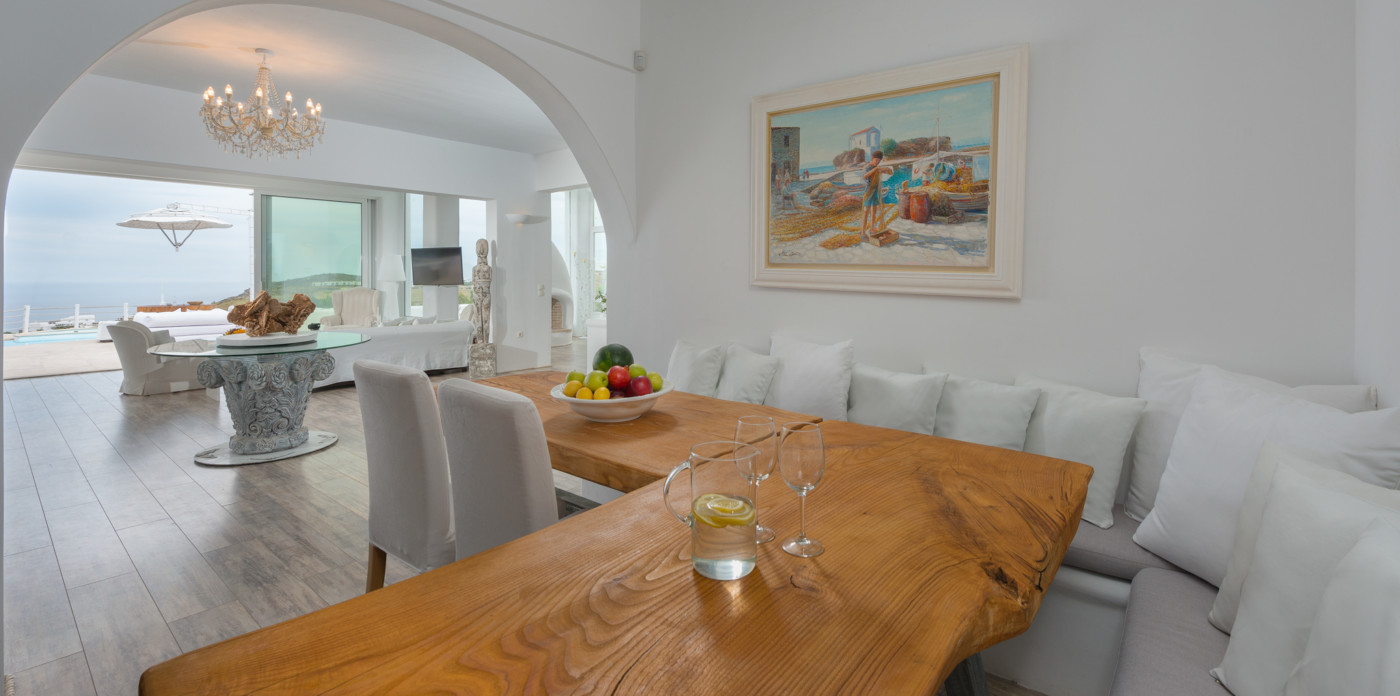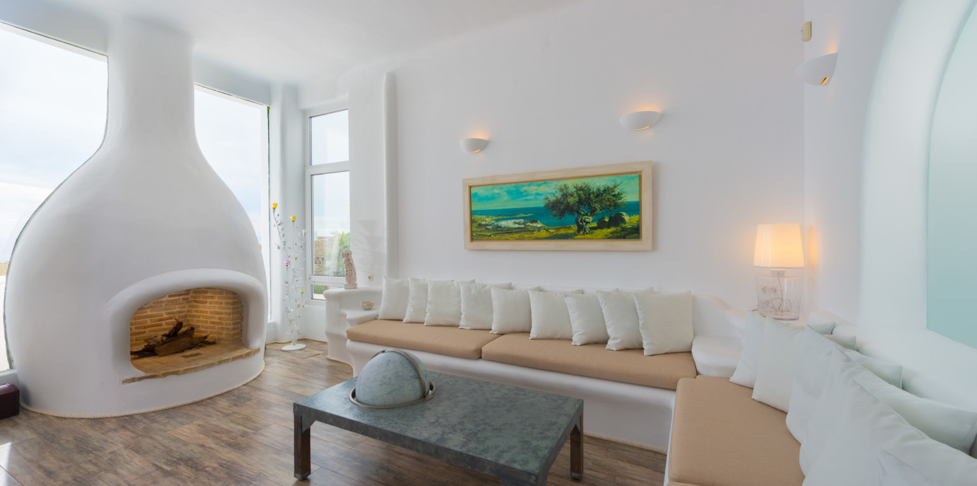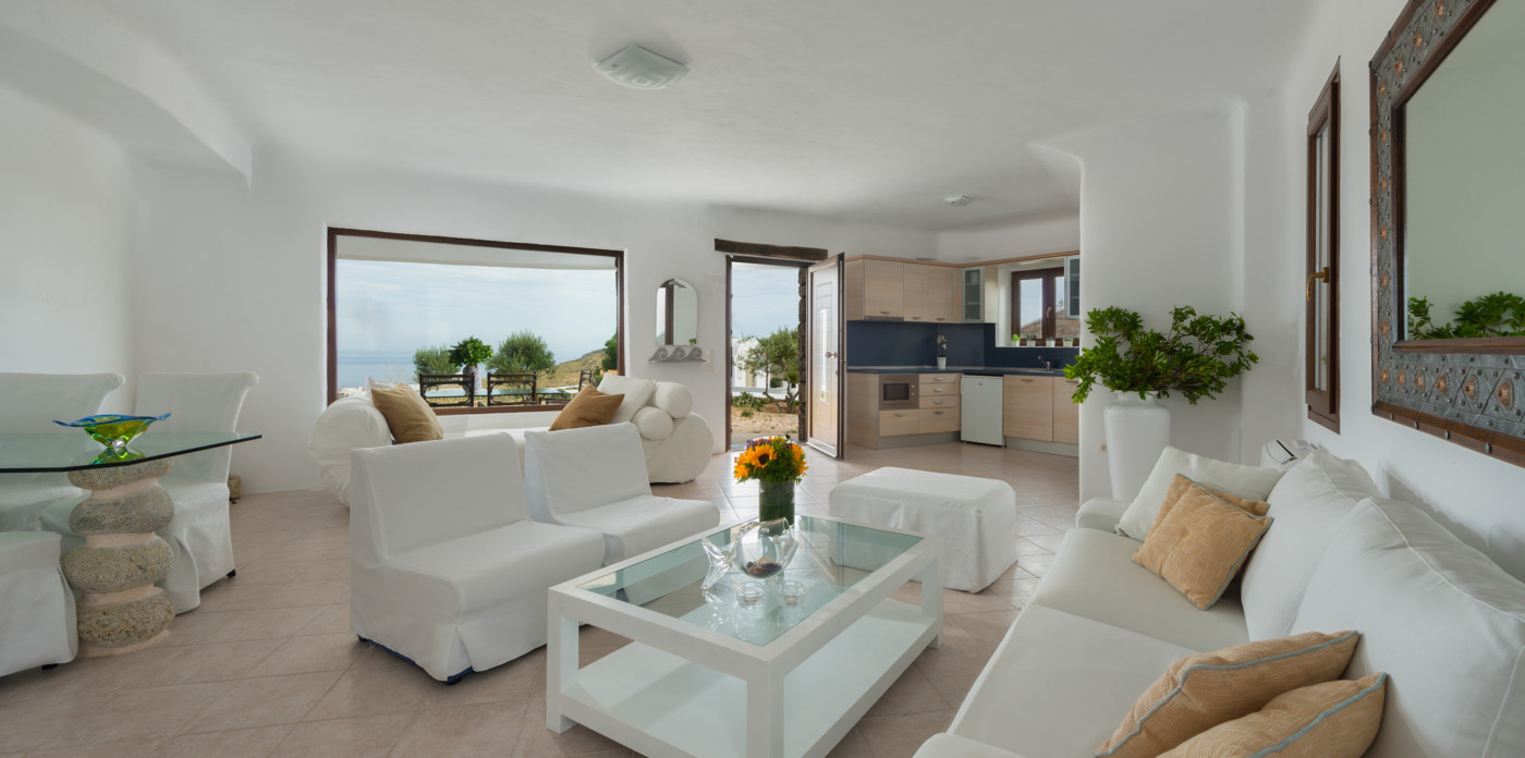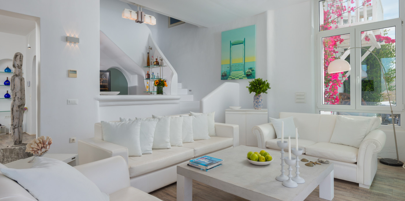 Το μονοχρωματικό λευκό χρώμα στο Aegean Jewel δημιουργεί μια ήρεμη, εκλεπτυσμένη ατμόσφαιρα που ζωντανεύει από την υφή. Στο σαλόνι, το οποίο ανοίγει στη βεράντα μέσω δύο συρόμενων πορτών και προσφέρει εξαιρετική θέα, υπάρχουν δύο παραδοσιακά γλυπτά της Μυκόνου που ζωντανεύουν το παρελθόν.