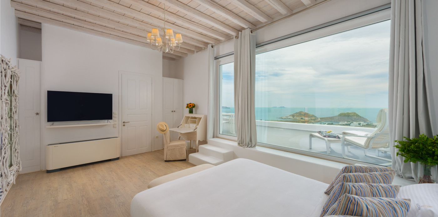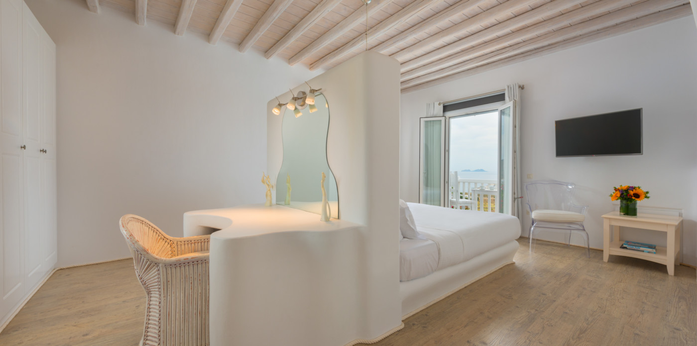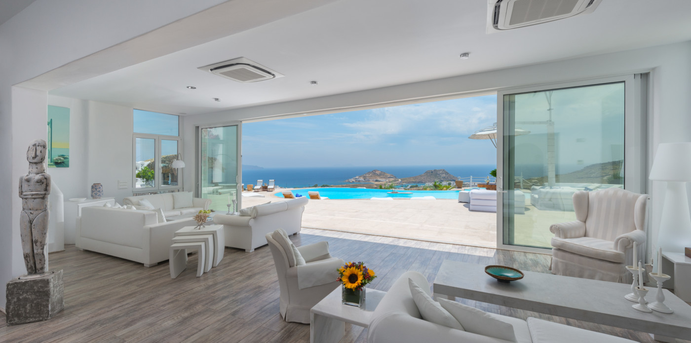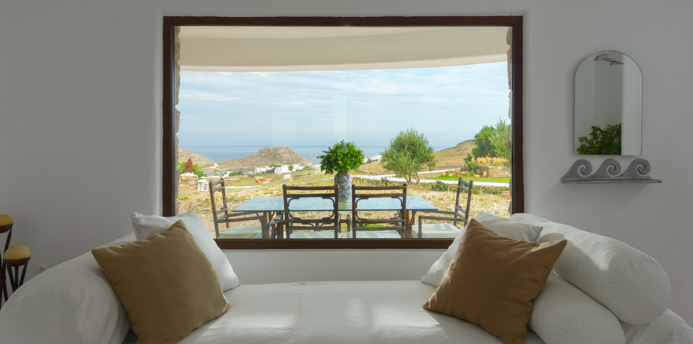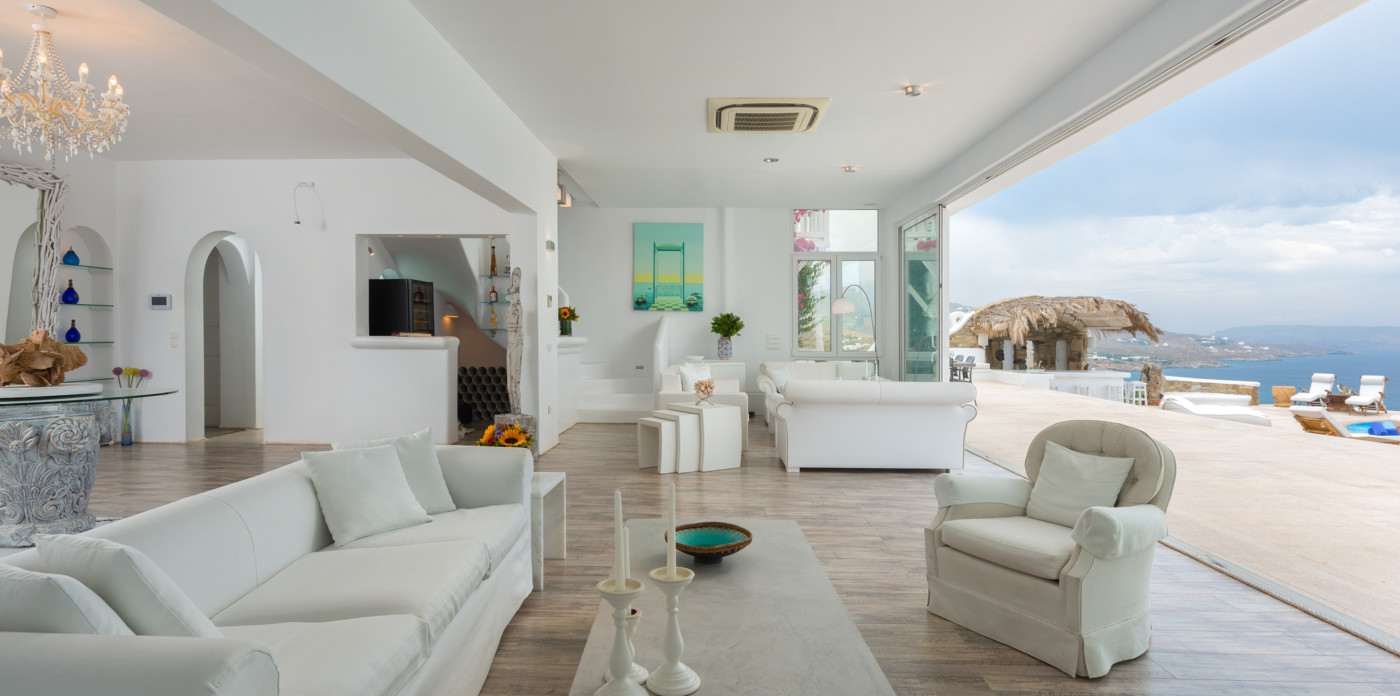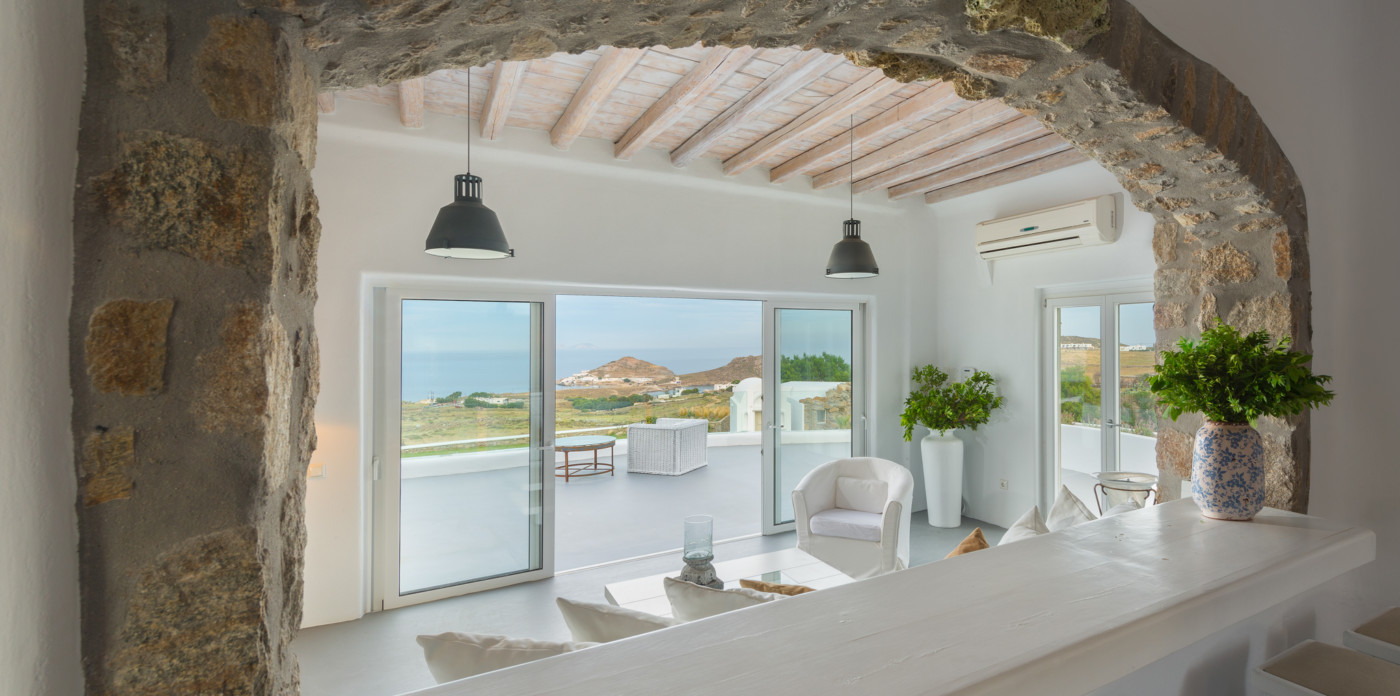 Το μονοχρωματικό λευκό χρώμα στο Aegean Jewel δημιουργεί μια ήρεμη, εκλεπτυσμένη ατμόσφαιρα που ζωντανεύει από την υφή. Στο σαλόνι, το οποίο ανοίγει στη βεράντα μέσω δύο συρόμενων πορτών και προσφέρει εξαιρετική θέα, υπάρχουν δύο παραδοσιακά γλυπτά της Μυκόνου που ζωντανεύουν το παρελθόν.