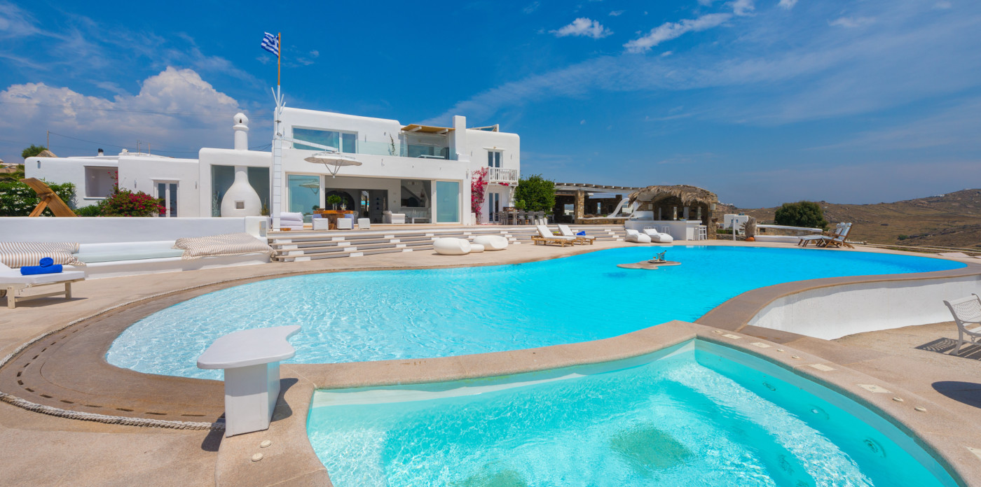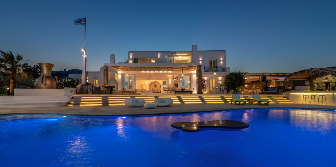 Γαλήνια ατμόσφαιρα, εκπληκτική θέα και δύο από τις πιο κοσμοπολίτικες παραλίες της Μυκόνου: θα τα βρείτε όλα στο Aegean Jewel. Όπως υποδηλώνει και το όνομά του, το αρχοντικό μοιάζει με παράδεισο. Βρίσκεται σε ένα οικόπεδο 7000τ.μ. ανάμεσα στο Καλό Λιβάδι & τον Καλαφάτη και αποτελείται από 3 παρακείμενα κτίρια των 1500τ.μ.