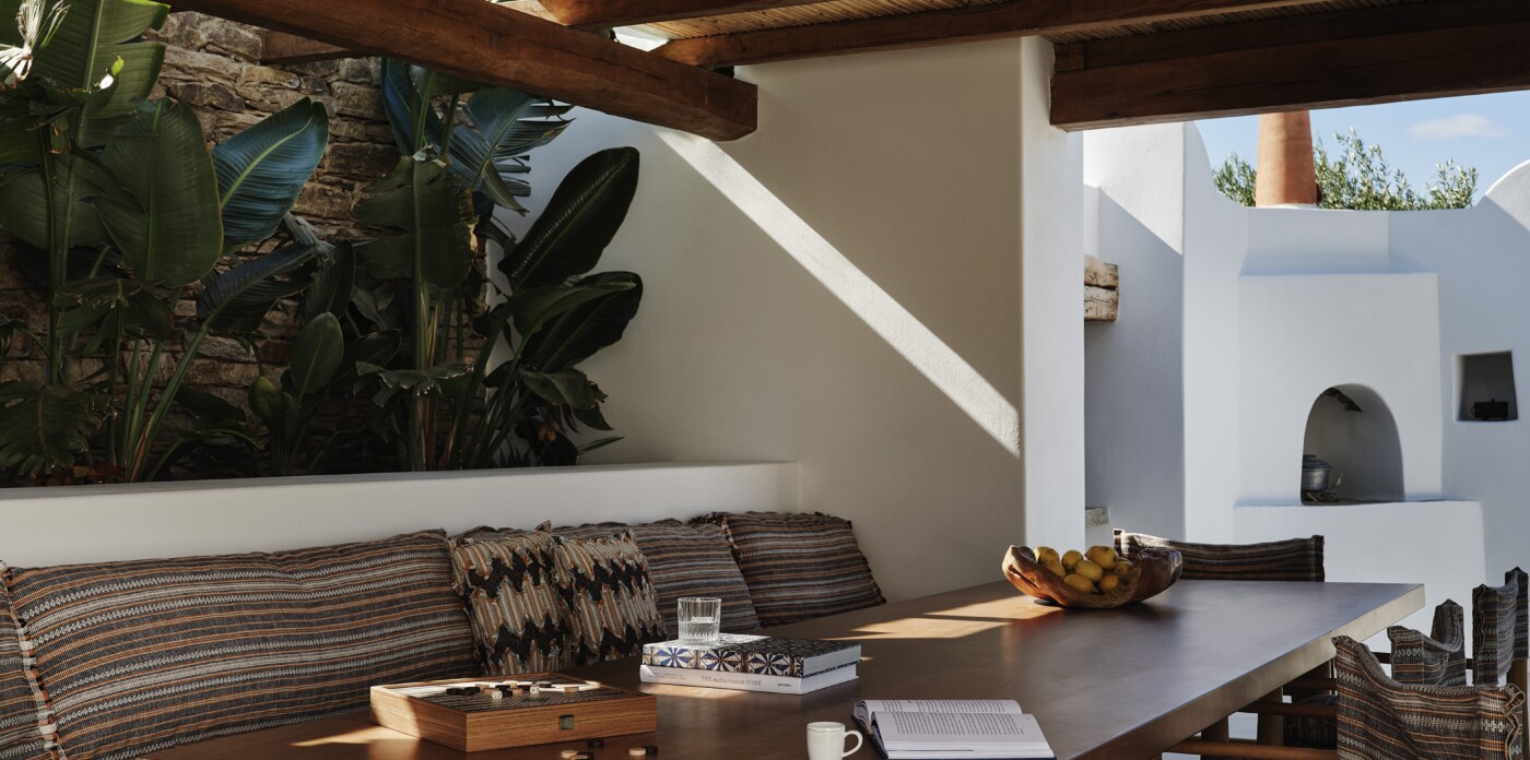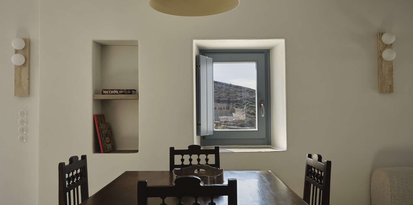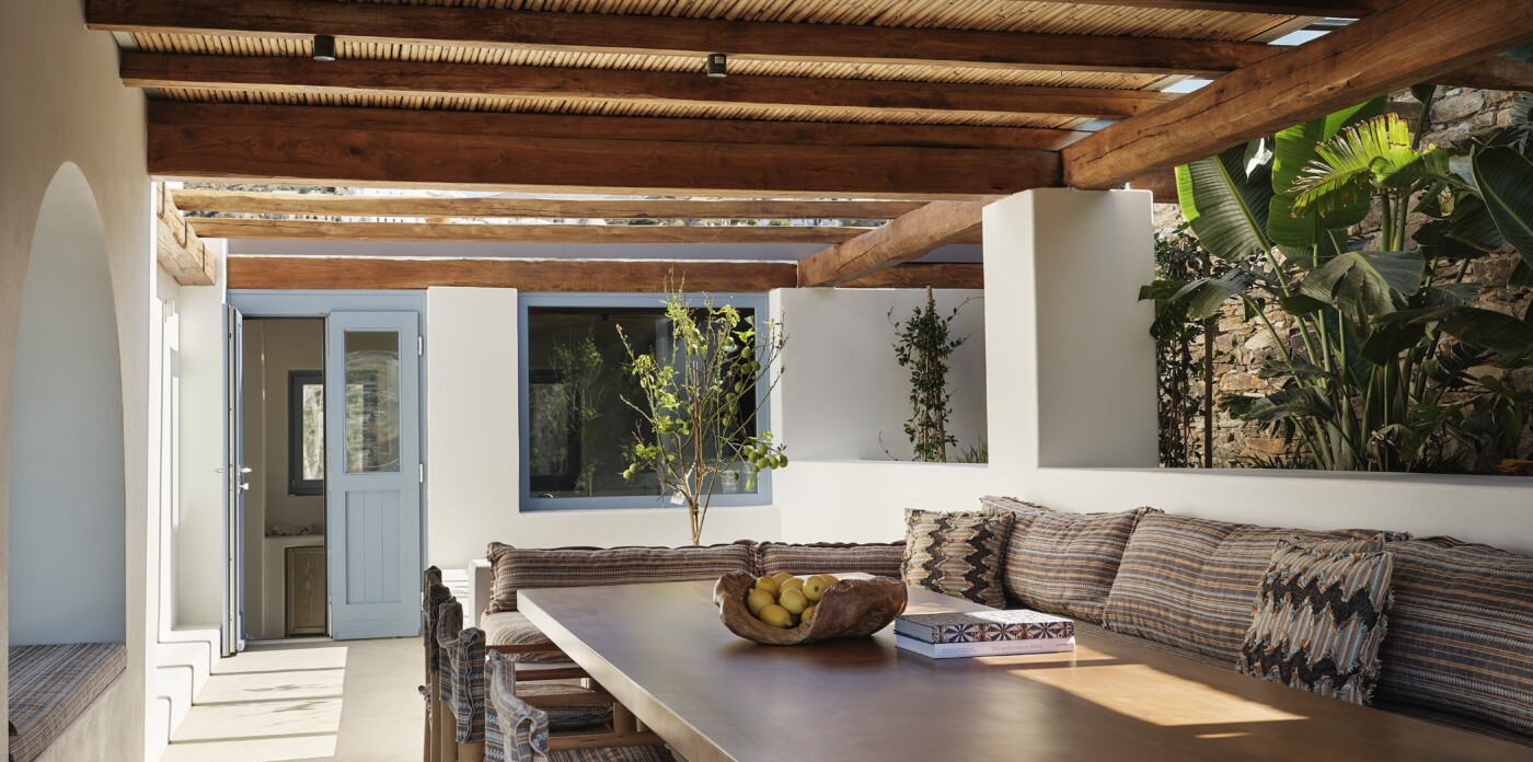 Μια πλήρως εξοπλισμένη κουζίνα, που συμπληρώνεται από ενιαίους χώρους διαβίωσης, όπου οι ζεστοί φυσικοί τόνοι και η εκλεπτυσμένη διακόσμηση ενσαρκώνουν το εκλεπτυσμένο κυκλαδίτικο στιλ.