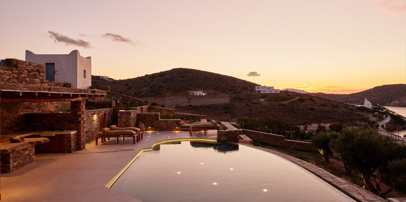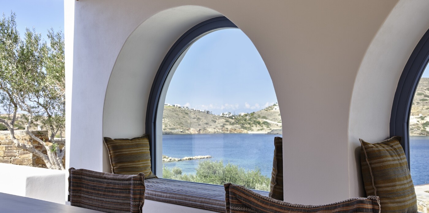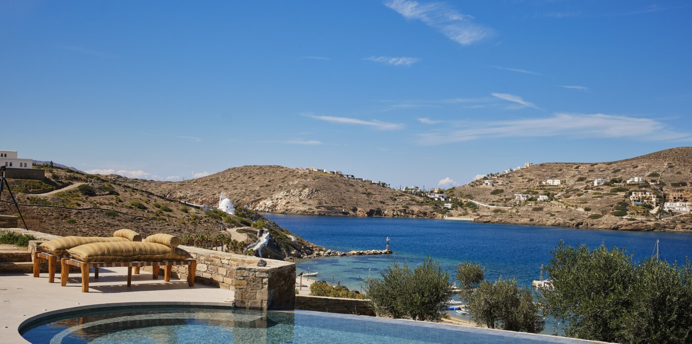 Η βίλα έχει θέα στο λαμπερό Αιγαίο, όπου η απέραντη θέα στη θάλασσα και τα εντυπωσιακά ηλιοβασιλέματα φωτίζουν τον ορίζοντα — ένα συνεχώς μεταβαλλόμενο θέαμα που θυμίζει τη χρυσή λάμψη του ίδιου του Ήλιου.