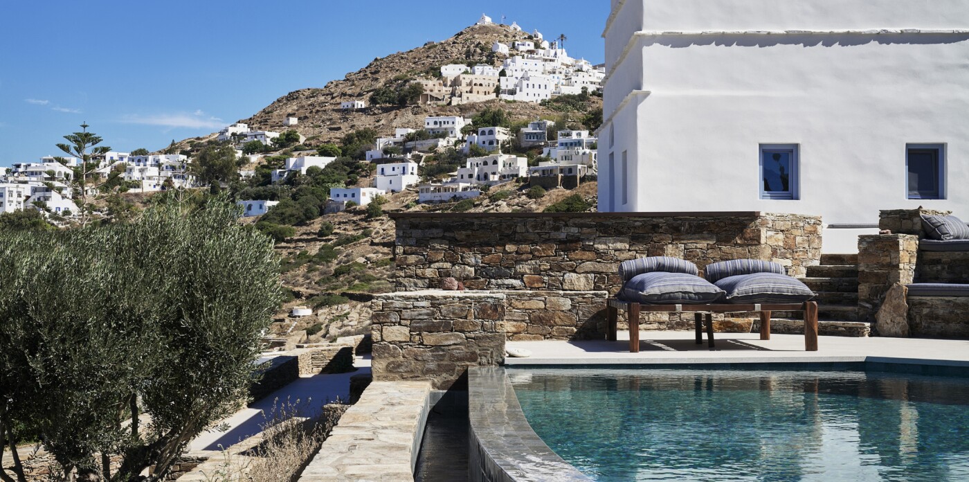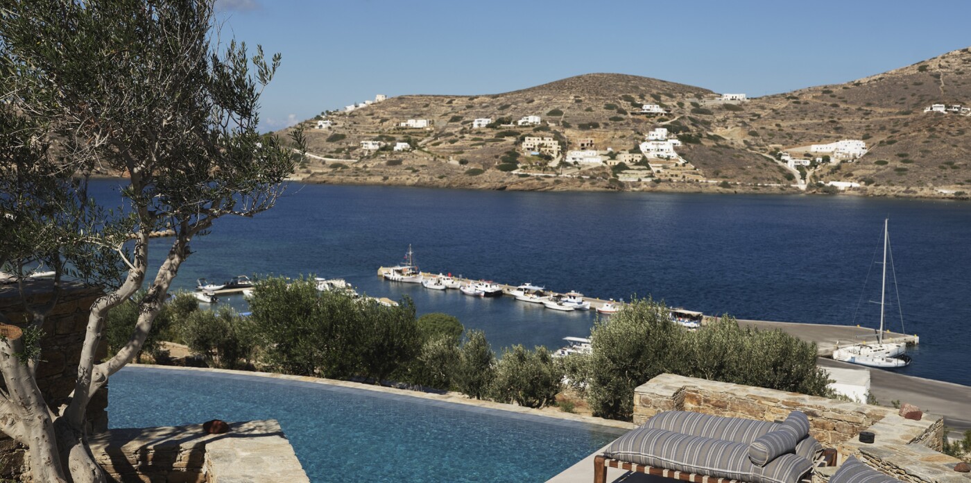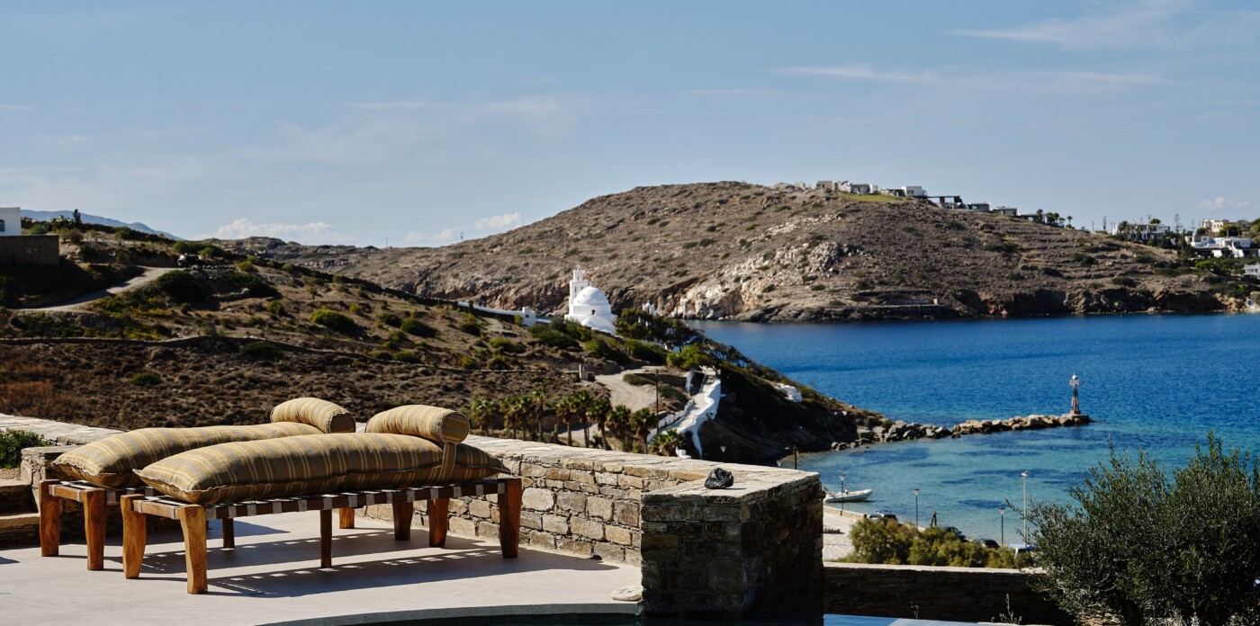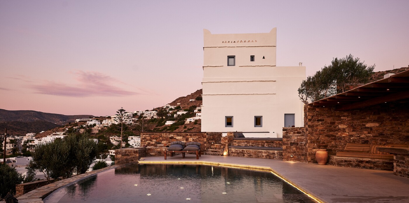 Η βίλα έχει θέα στο λαμπερό Αιγαίο, όπου η απέραντη θέα στη θάλασσα και τα εντυπωσιακά ηλιοβασιλέματα φωτίζουν τον ορίζοντα — ένα συνεχώς μεταβαλλόμενο θέαμα που θυμίζει τη χρυσή λάμψη του ίδιου του Ήλιου.