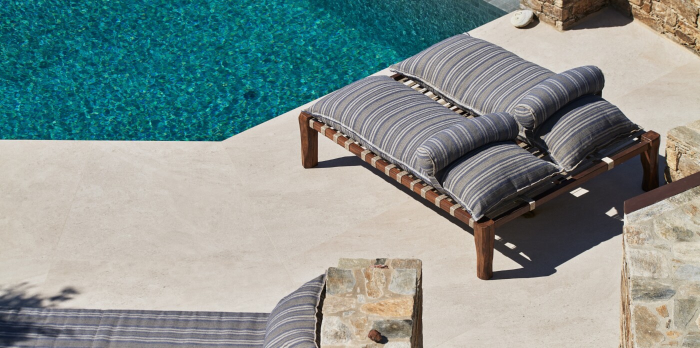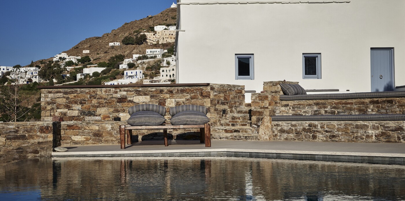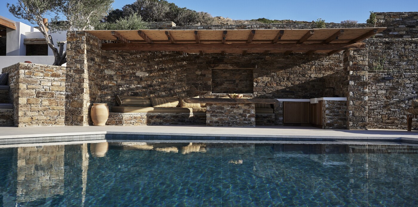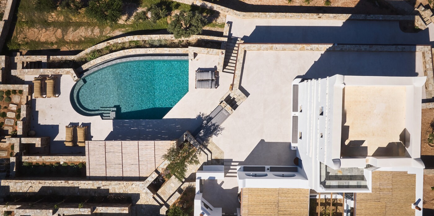 Στον εξωτερικό χώρο, μια ιδιωτική πισίνα λάμπει κάτω από τον μεσογειακό ήλιο, πλαισιωμένη από βεράντες και ξαπλώστρες, όπου οι επισκέπτες μπορούν να απολαύσουν τη θέα ή να χαρούν στιγμές ήρεμης περισυλλογής, σαν οι Νηρηίδες να είχαν τιμηθεί με την παρουσία τους στα νερά. Οι πολυάριθμοι εξωτερικοί χώροι καθιστικού, οι σκιερές γωνιές και οι υπαίθριοι χώροι τραπεζαρίας δημιουργούν το ιδανικό σκηνικό για κοκτέιλ στο ηλιοβασίλεμα, χαλαρά πρωινά ή βραδινές συγκεντρώσεις κάτω από τον έναστρο ουρανό.