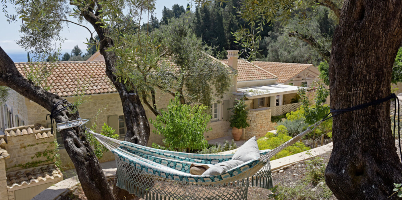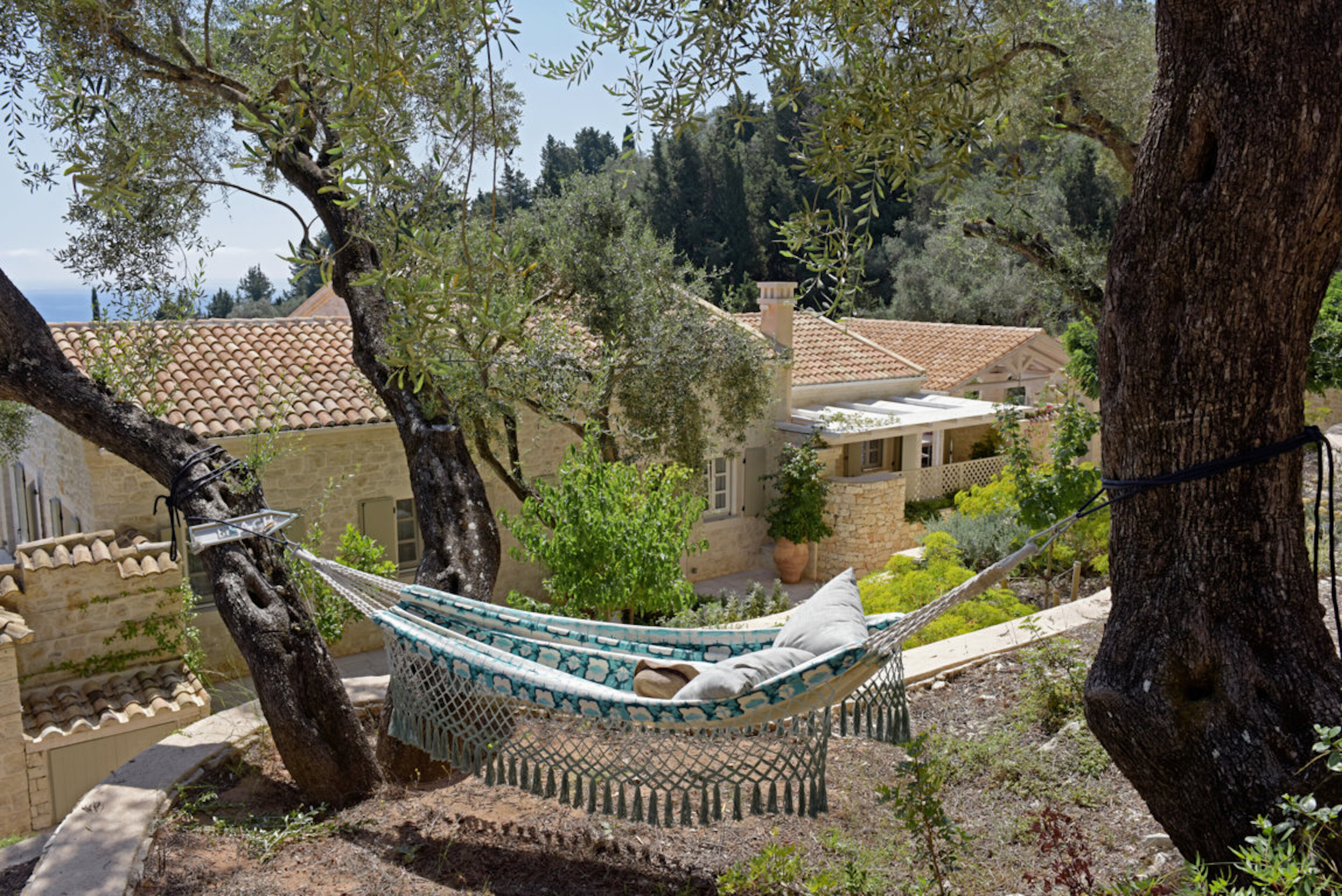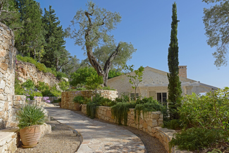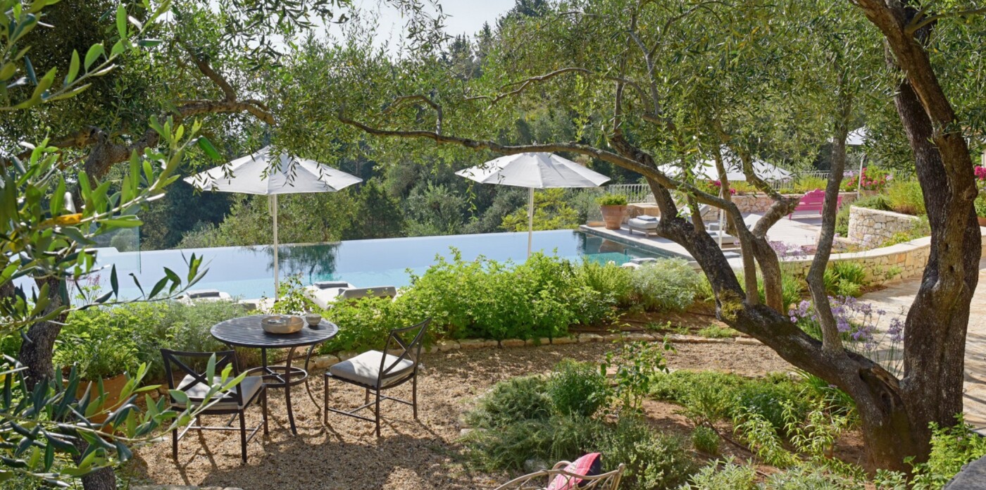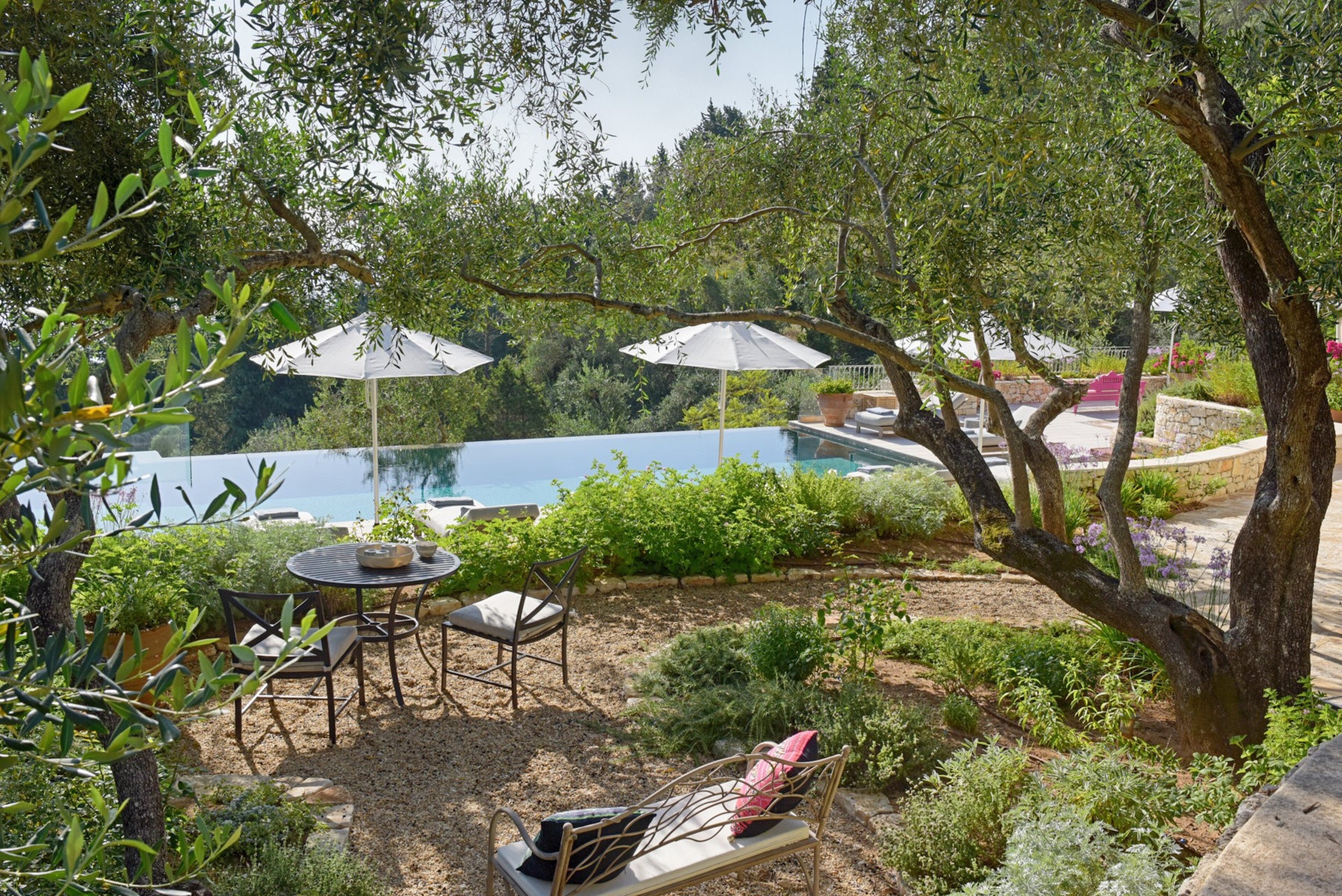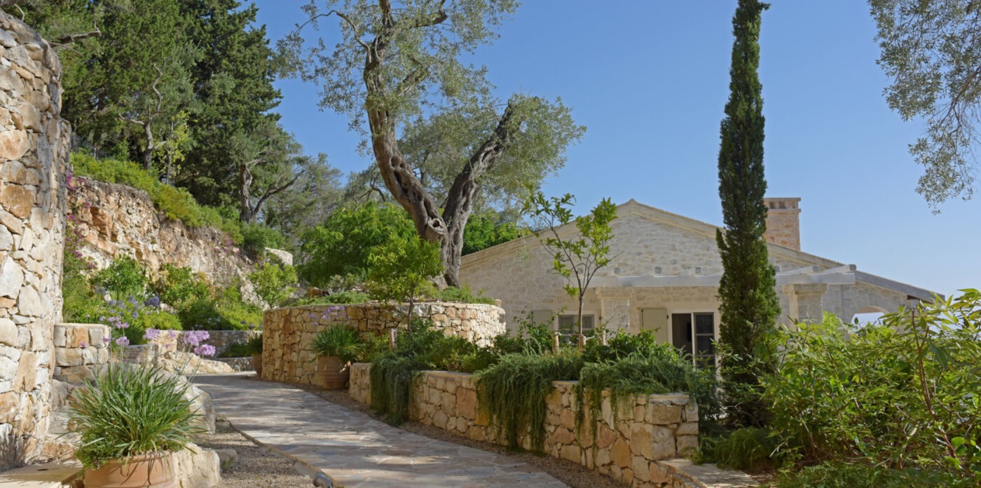 Τα ελικοειδή μονοπάτια του κήπου, που ευωδιάζουν με ένα μείγμα βοτάνων και λουλουδιών, σας οδηγούν στη δροσερή σκιά των αρχαίων ελαιόδεντρων.