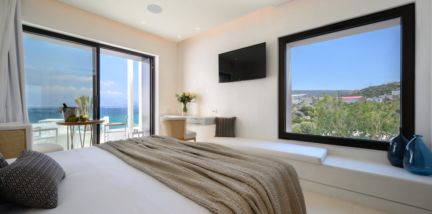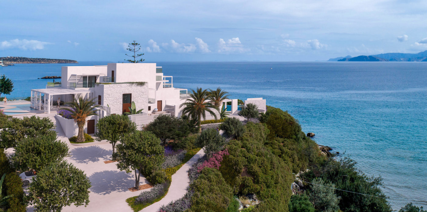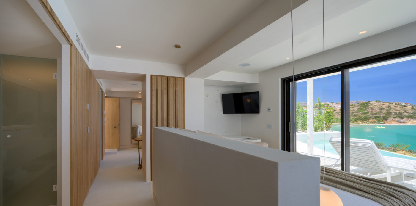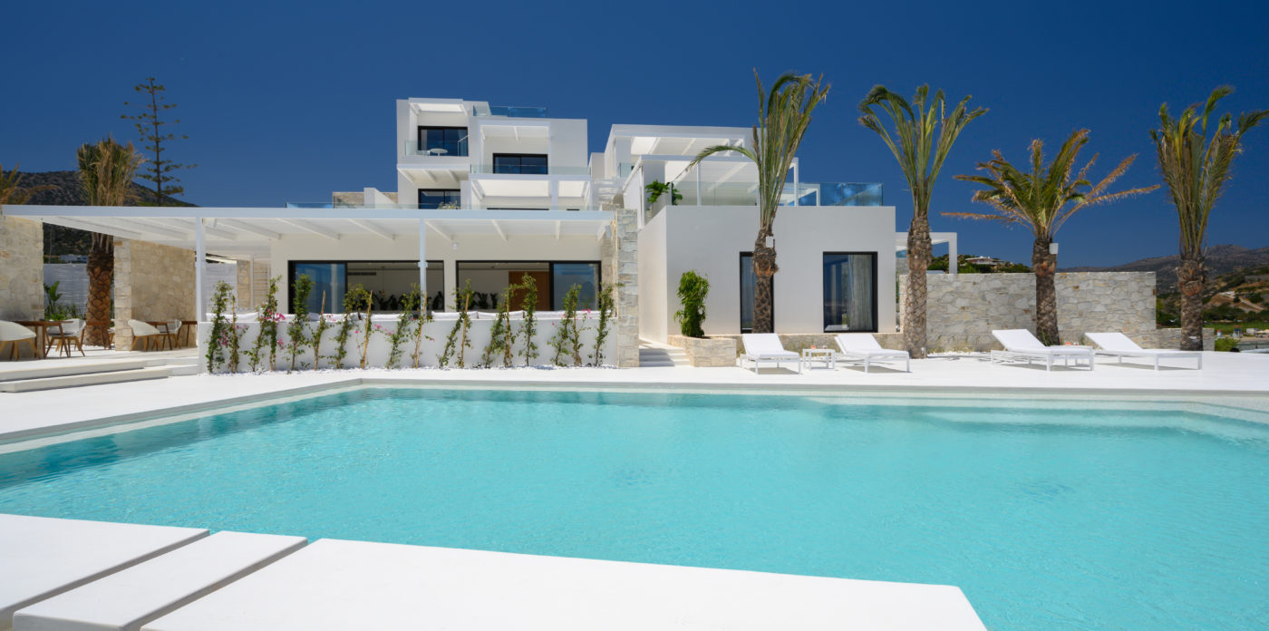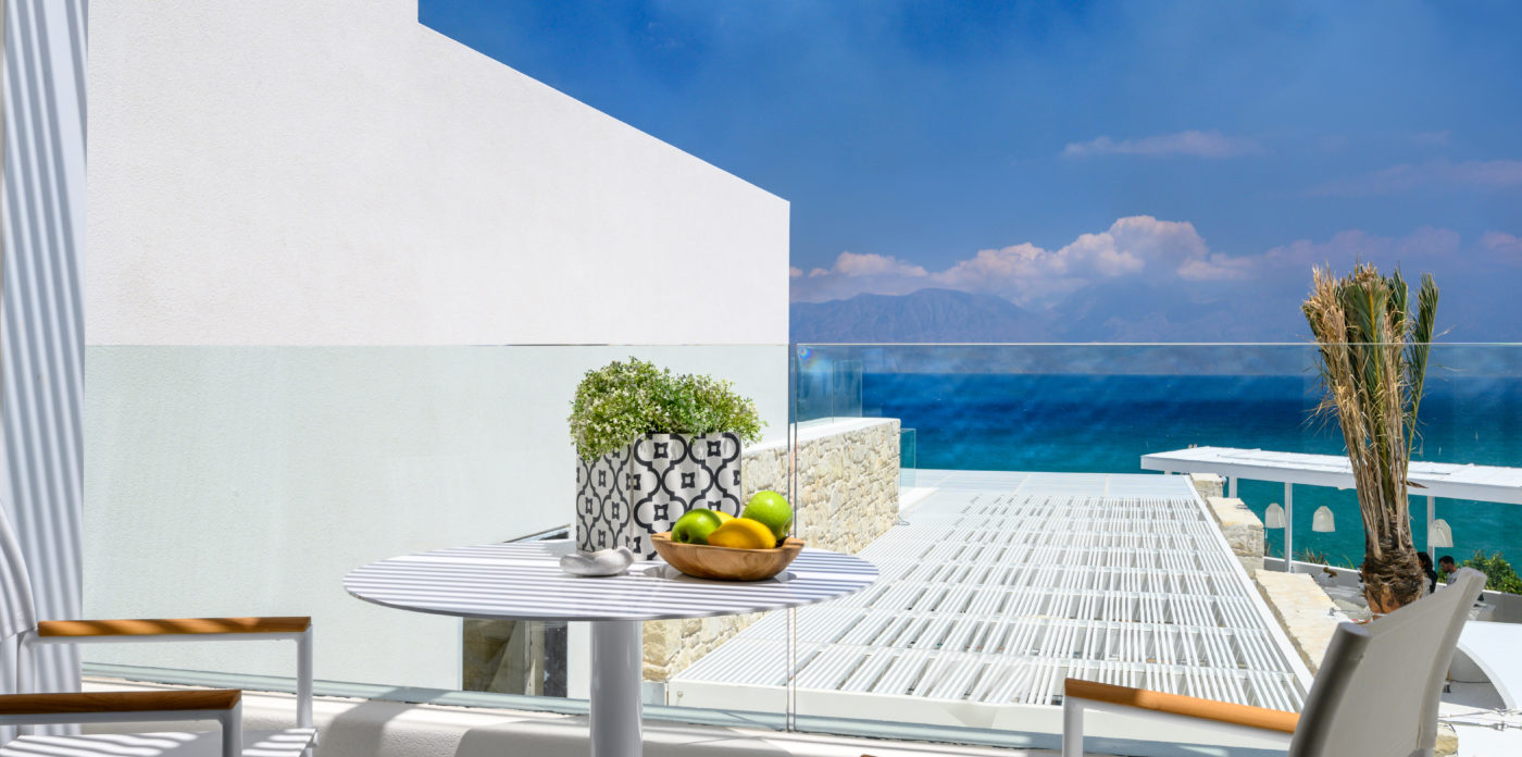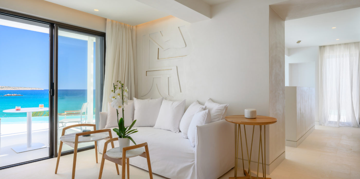 Το ασβεστωμένο παραθαλάσσιο θέρετρο διαθέτει μινιμαλιστικό σχεδιασμό που σέβεται τη σύγχρονη αρχιτεκτονική των ελληνικών νησιών και προσφέρει μια αυθεντική, αλλά σύγχρονη εμπειρία, συνδυάζοντας πολυτελή διαμονή με την εμβληματική κρητική φιλοξενία. Όλοι οι χώροι είναι ευρύχωροι και ευάεροι, γεμάτοι με άπλετο φυσικό φως. Τα μεγάλα κουφώματα ανοίγουν σε ευάερα μπαλκόνια και βεράντες, ξαπλώστρες και ξαπλώστρες ή μεγαλύτερες βεράντες, οι οποίες προσφέρουν εκπληκτική θέα στο Κρητικό Πέλαγος.
