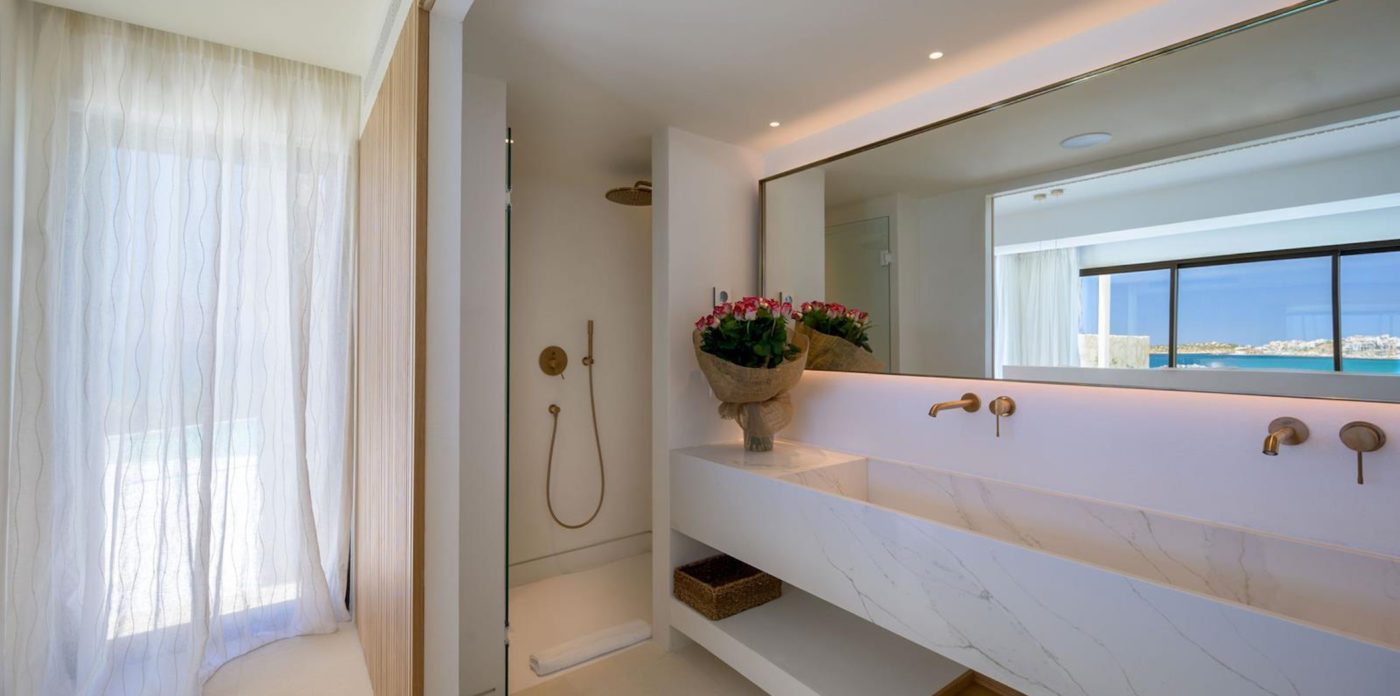 Η βίλα είναι ιδανική για μεγαλύτερες οικογένειες και παρέες, καθώς μπορεί να φιλοξενήσει έως και 30 άτομα στα 15 δωμάτια και σουίτες της που ποικίλλουν σε μέγεθος. Όλα τα καταλύματα υπηρετούν πιστά τη μινιμαλιστική αισθητική της ελληνικής απλότητας. Οι απλές γραμμές, το φωτεινό λευκό, το κεραμιδί μπλε, οι γήινοι τόνοι και τα φυσικά υλικά, μαζί με την εκπληκτική θέα στο Μινωικό Πέλαγος, συνθέτουν μια ηρεμιστική εικόνα που συνάδει με την άνεση και την απόλυτη χαλάρωσή σας.