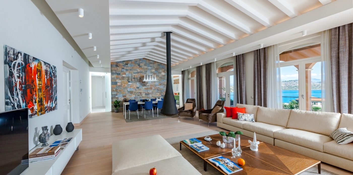 Η κύρια είσοδος ανοίγει στον ενιαίο χώρο του καθιστικού. Οι θολωτές οροφές και το αναρτημένο τζάκι κάνουν μια μεγάλη δήλωση σε αυτόν τον κατά τα άλλα χαλαρωτικό χώρο. Μεγάλες μπαλκονόπορτες επιτρέπουν στην ομορφιά της θέας να πλημμυρίσει, φωτίζοντας το χώρο με ζεστασιά και ηλιοφάνεια.