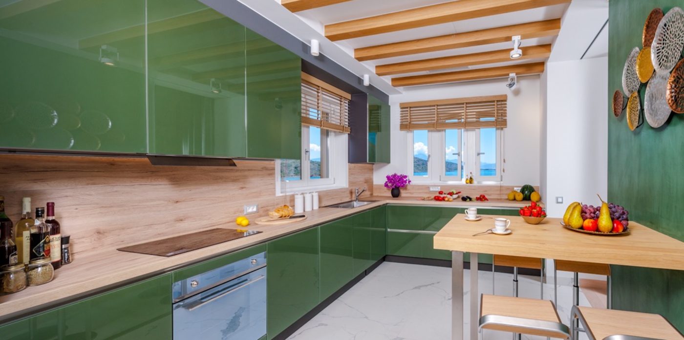 Η κουζίνα είναι εξοπλισμένη με γυαλιστερά ντουλάπια και ξύλινους πάγκους, ενώ τα παράθυρα διπλής όψης έχουν θέα στη θάλασσα.