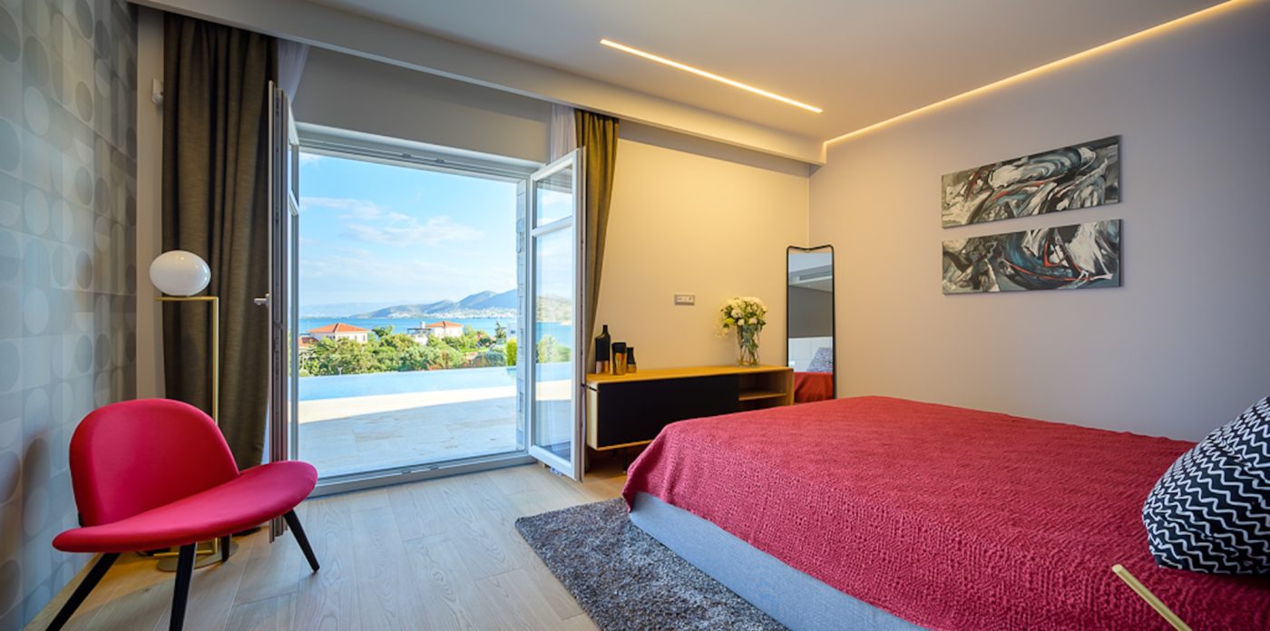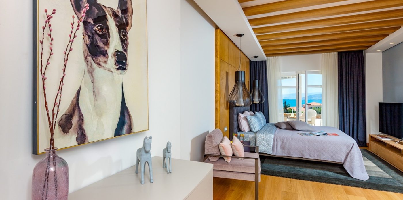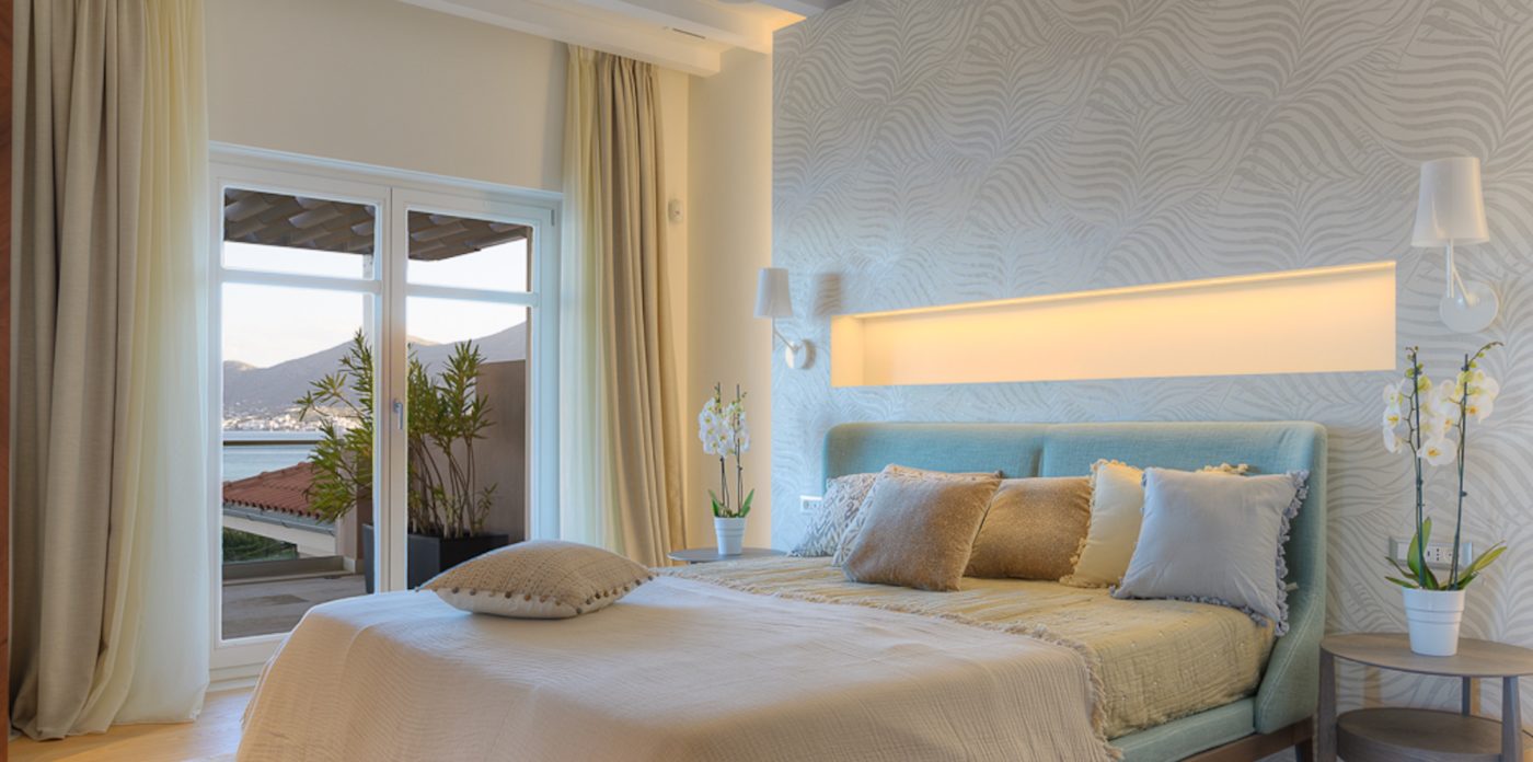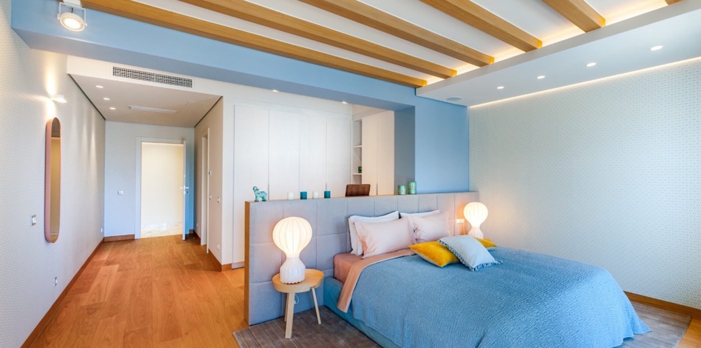 Στο ανώτερο επίπεδο βρίσκεται η σουίτα του κύριου υπνοδωματίου. Εκτός από τα πέντε υπνοδωμάτια στο κυρίως σπίτι υπάρχει ένα αυτόνομο διαμέρισμα ιδανικό για επιπλέον διαμονή επισκεπτών. Διαθέτει ενιαίο χώρο καθιστικού, κουζίνα και υπνοδωμάτιο με διπλό κρεβάτι.