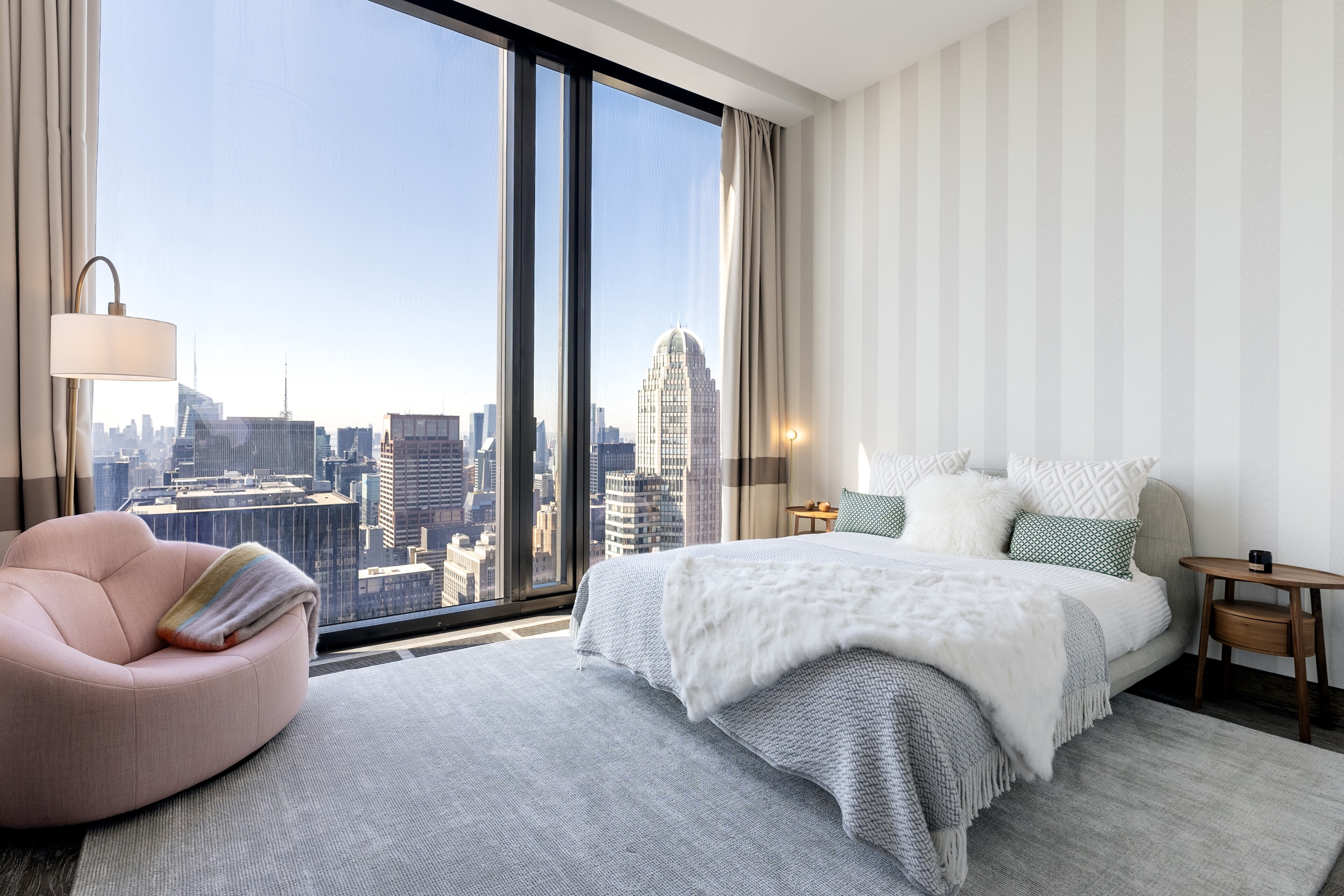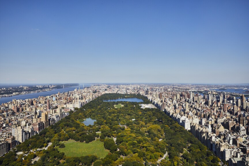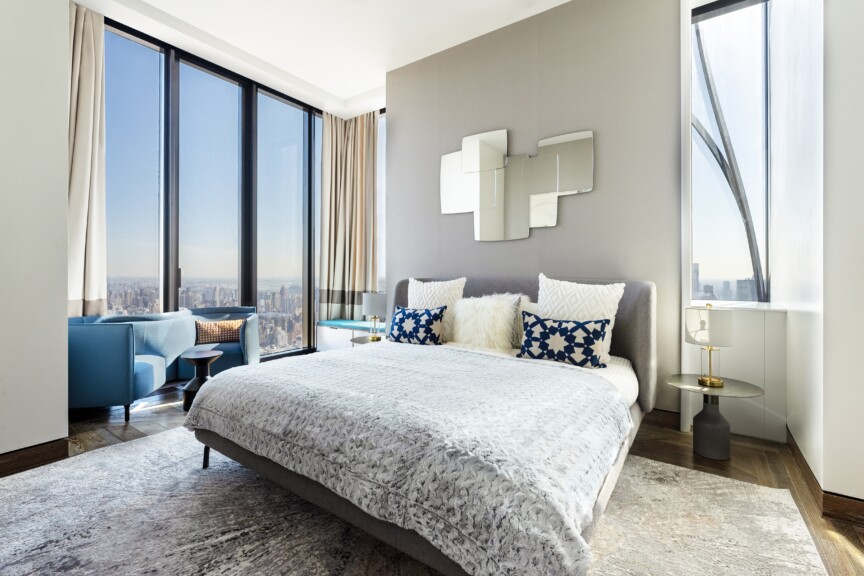 The Secondary Bedrooms, each with striking views, one facing north over Central Park and the other facing south with breathtaking city skyline views. Both are generously proportioned with en-suite bathrooms finished in a distinctive crystallo gold quartzite and custom Studio Sofield designed fixtures.