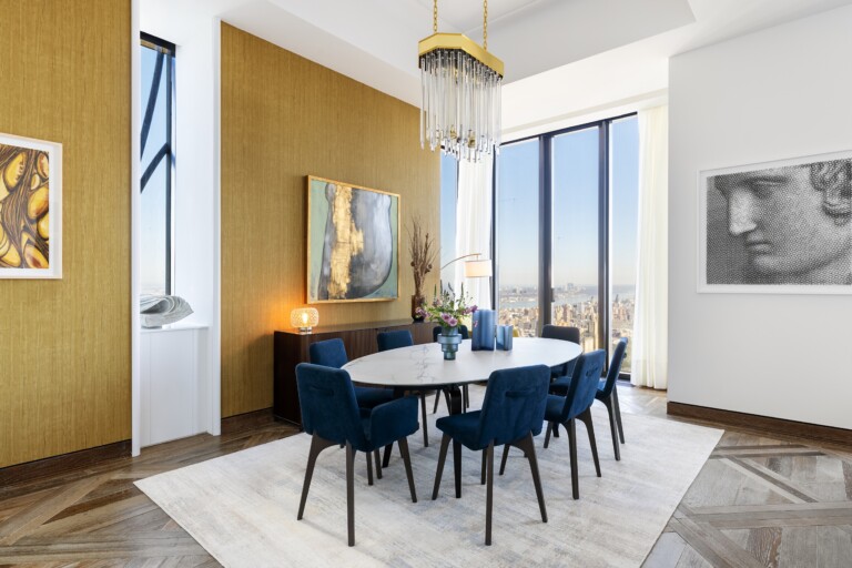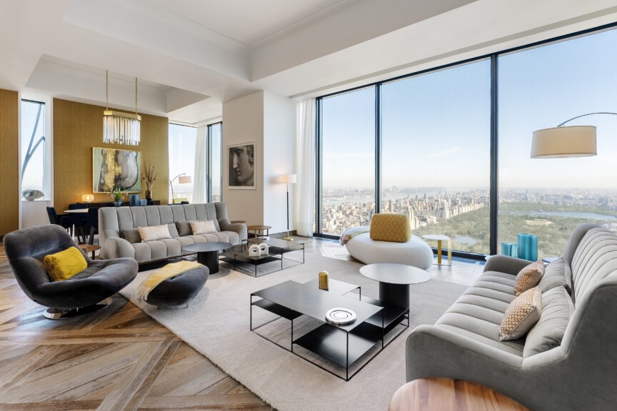 The formal Entry Gallery is finished with white macauba stone floors and offers a dramatic North to South view which opens into the sumptuous Great Room. This incredible space is highlighted by 14-foot ceilings and floor-to-ceiling windows which showcase unrivaled, perfectly centered views over Central Park.