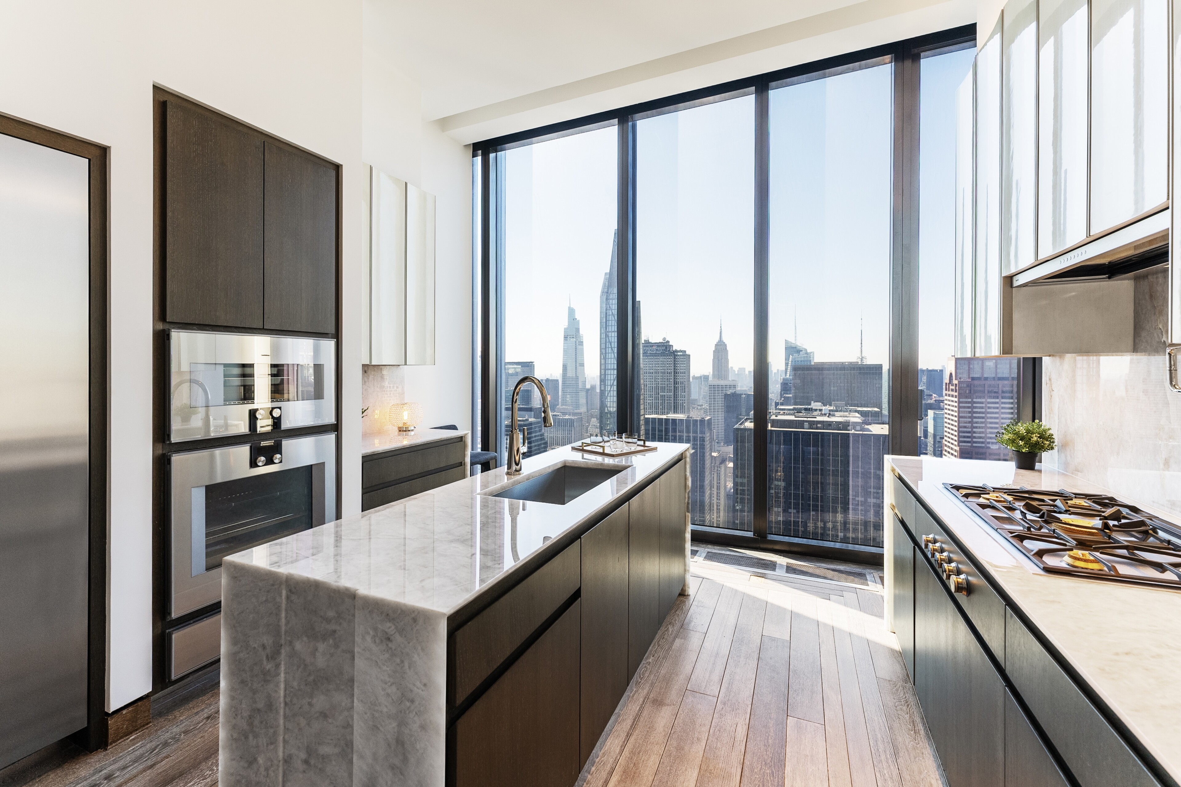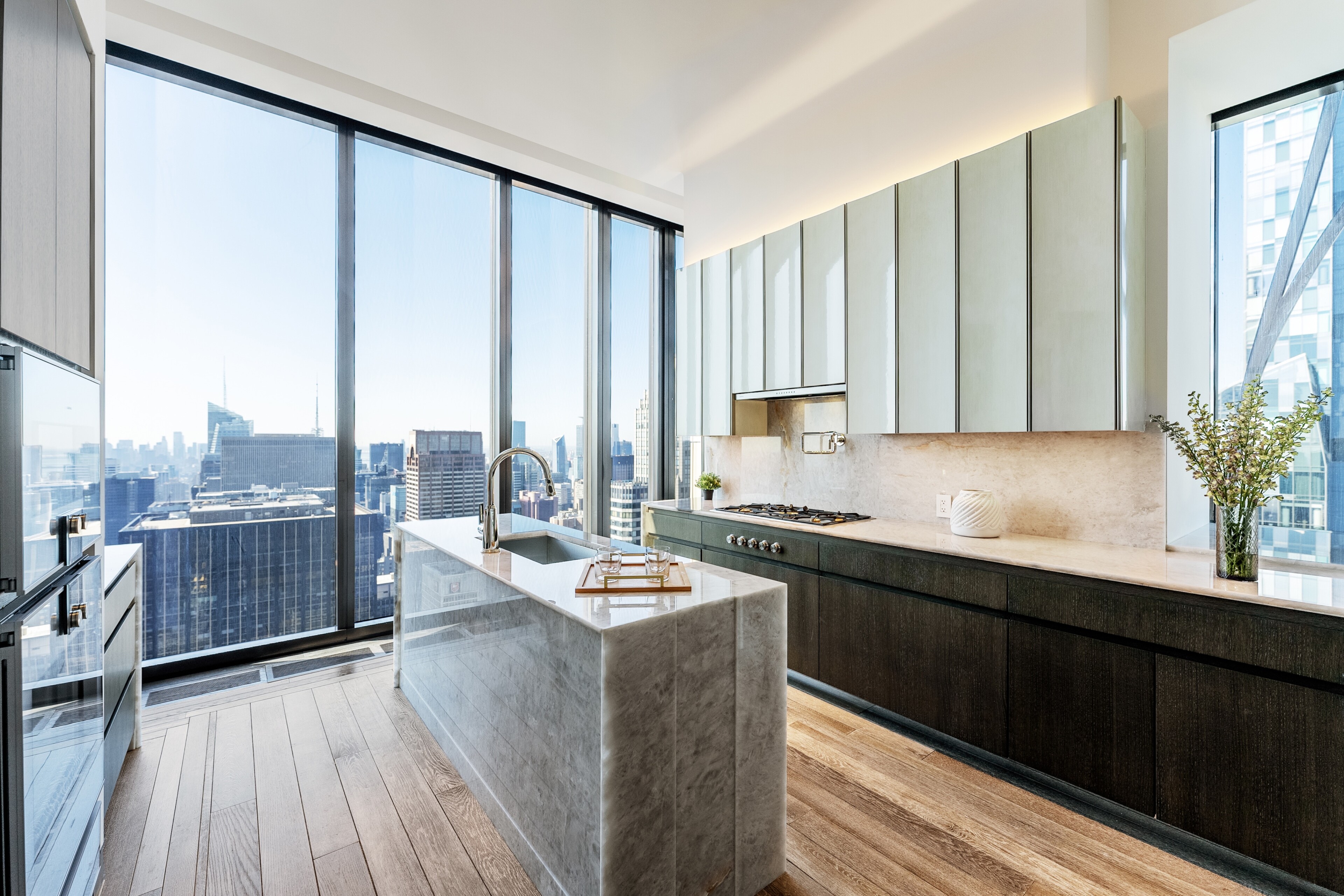 The corner, south-facing Kitchen features custom cabinetry designed by Studio Sofield, crystallo white quartzite countertops and backsplash, and a full suite of Gaggenau appliances, including gas cooktop with fully vented hood, steam oven and wine fridge.