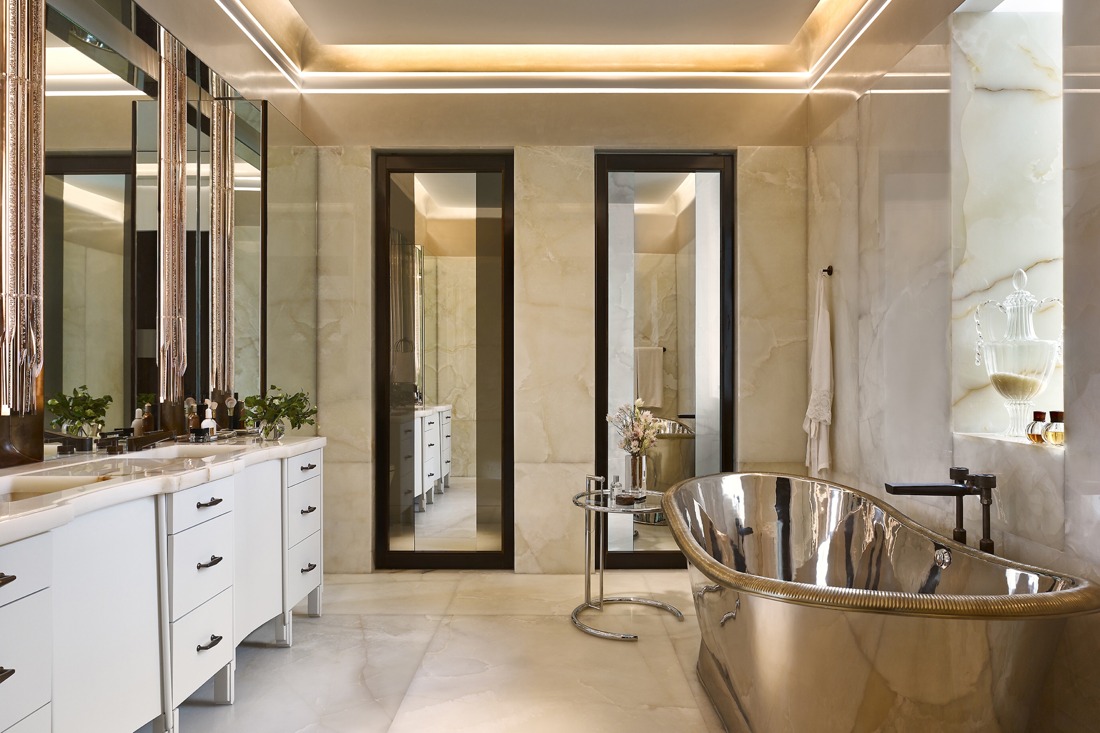The luxuriously appointed Primary Bedroom Suite features southern skyline city views, two walk-in closets and a windowed Bathroom clad in hand selected veined white onyx. The custom freestanding polished nickel bathtub is by William Holland and beautiful, custom-designed fixtures are hand-cast by P.E. Guerin, the only foundry still operating in New York City.