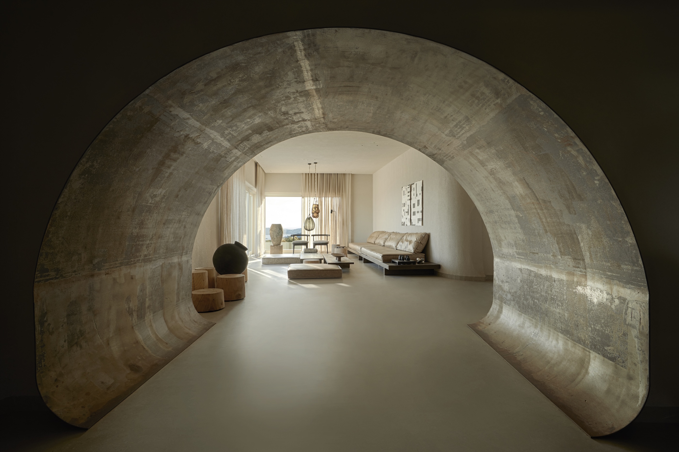 Built across 6.5 acres on a rocky hillside overlooking the Aegean, the eight-bedroom property features king-suite accommodations that open to private terraces or plunge pools, along with a minimal, natural-materials design aesthetic carried through textured stone kitchens, sleek bathrooms, and expansive indoor-outdoor living areas connected by architectural highlights such as a steel tunnel.
