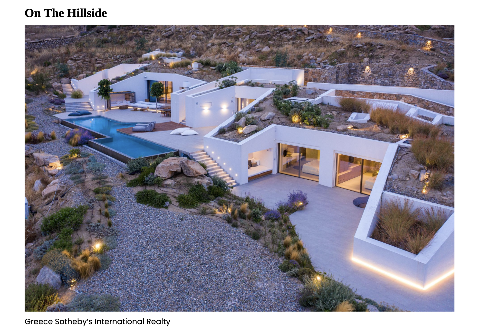 Clambering around the rugged plains of the Mykonos hills, it might be easy to miss that you’ve clambered right onto the roof of a house. Buried deep in the hillside, this property takes the blending of in and out to a whole new level. With views of the Aegean sea, an infinity pool, and some incredibly cool roof gardens, it’s also the perfect place to hide out and camouflage if we’re ever hit by WW3.