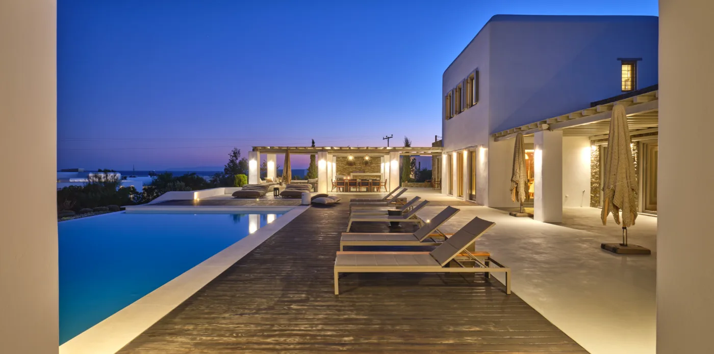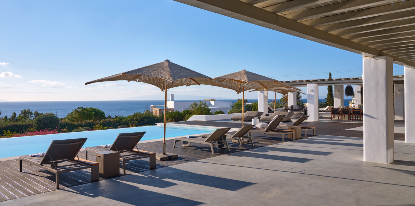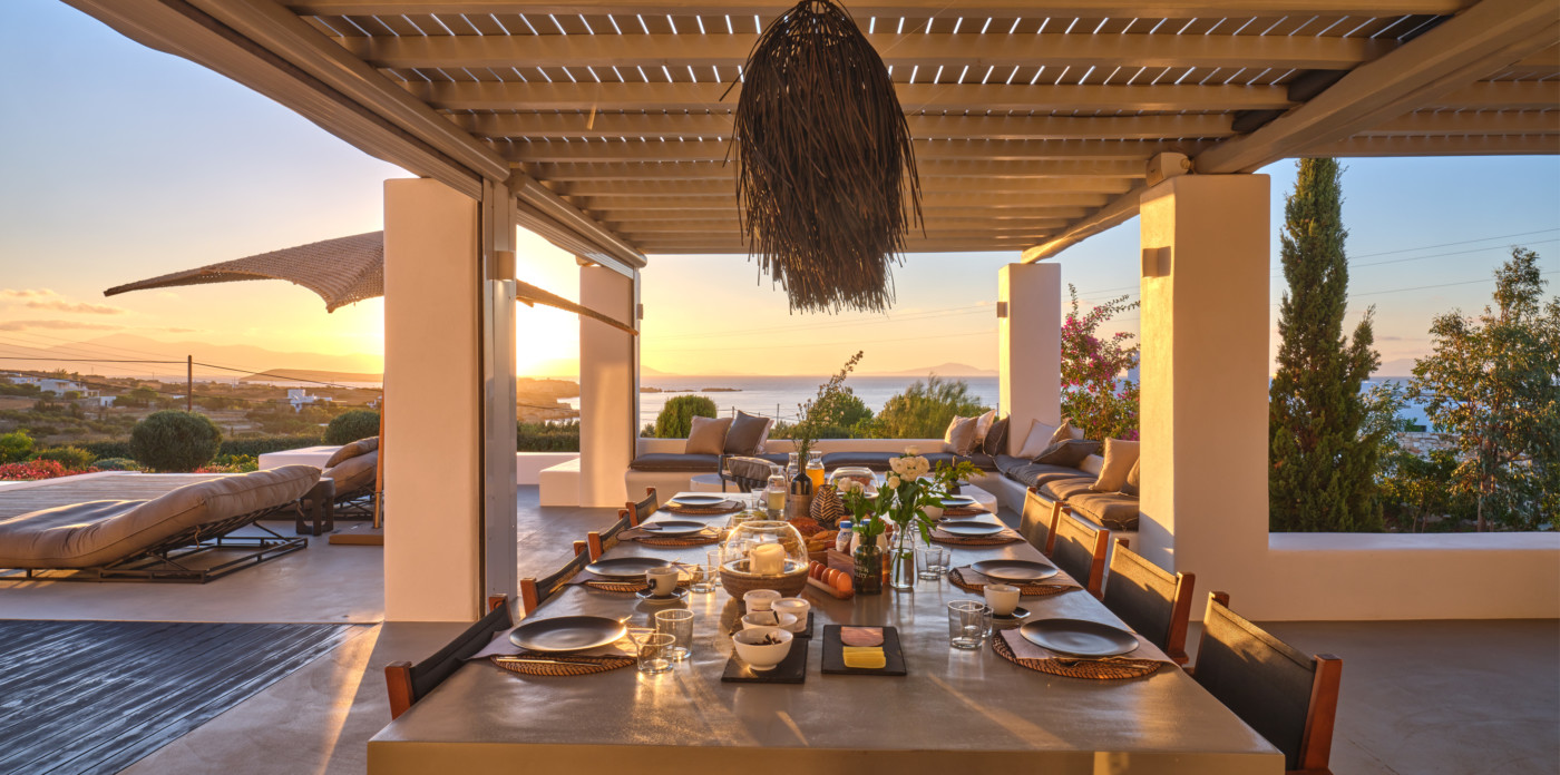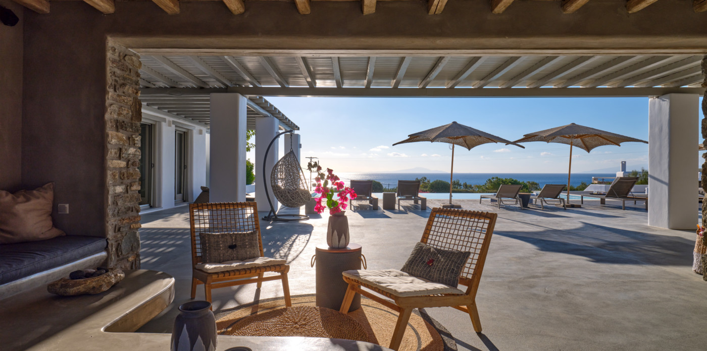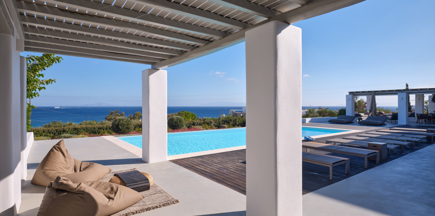 Consisting of a main house and a guesthouse with a total of seven bedrooms, Agape is the ideal property for a multigenerational escape. An inviting terrace at the front offers plenty of outdoor space and includes a lovely pool area, shaded dining, and lounge area. A large ten-seater dining table under a shaded terrace is just the spot to entertain and enjoy a barbeque or cocktails.
