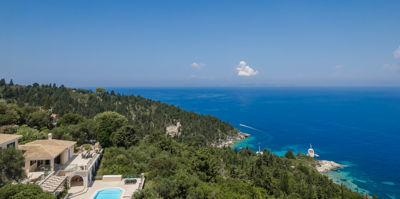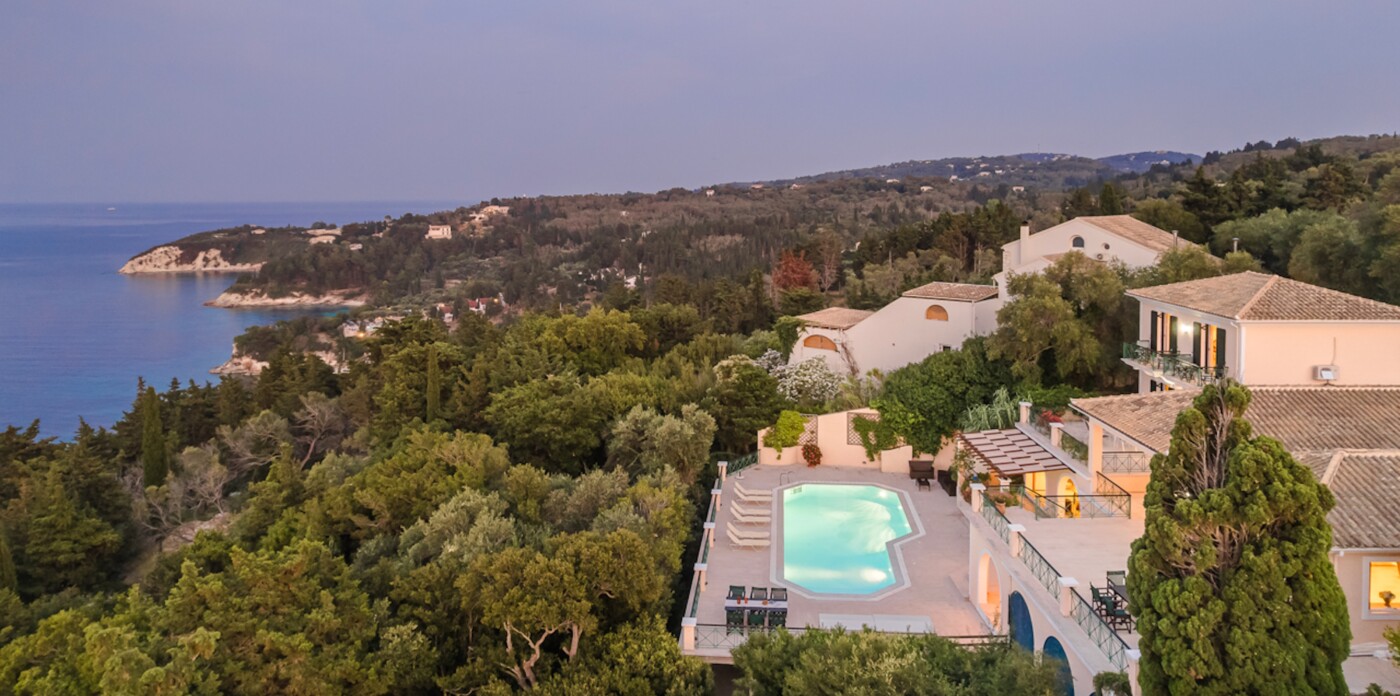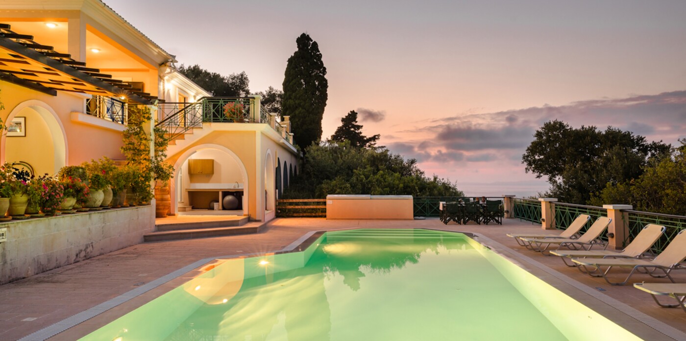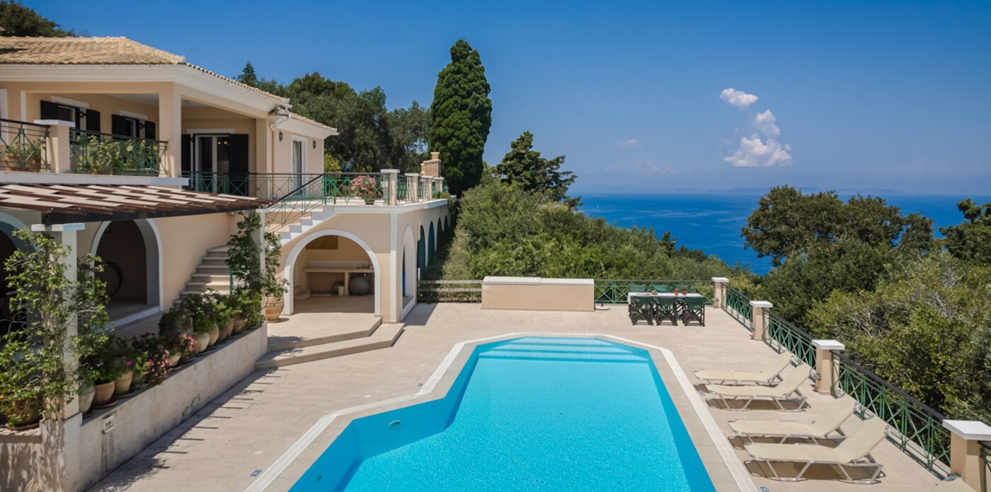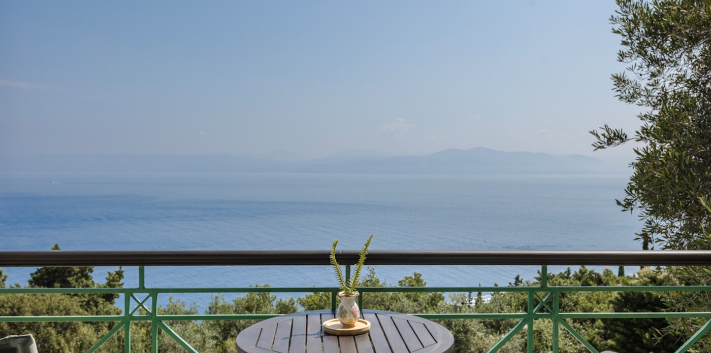 The unrivalled panoramic views span 180 degrees covering the island of Corfu and in the far distance, north the Albanian mountains, directly ahead and to the south of the property is the ever changing vista of the stunning Greek mainland.