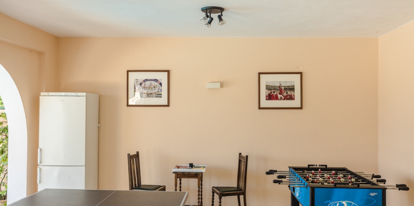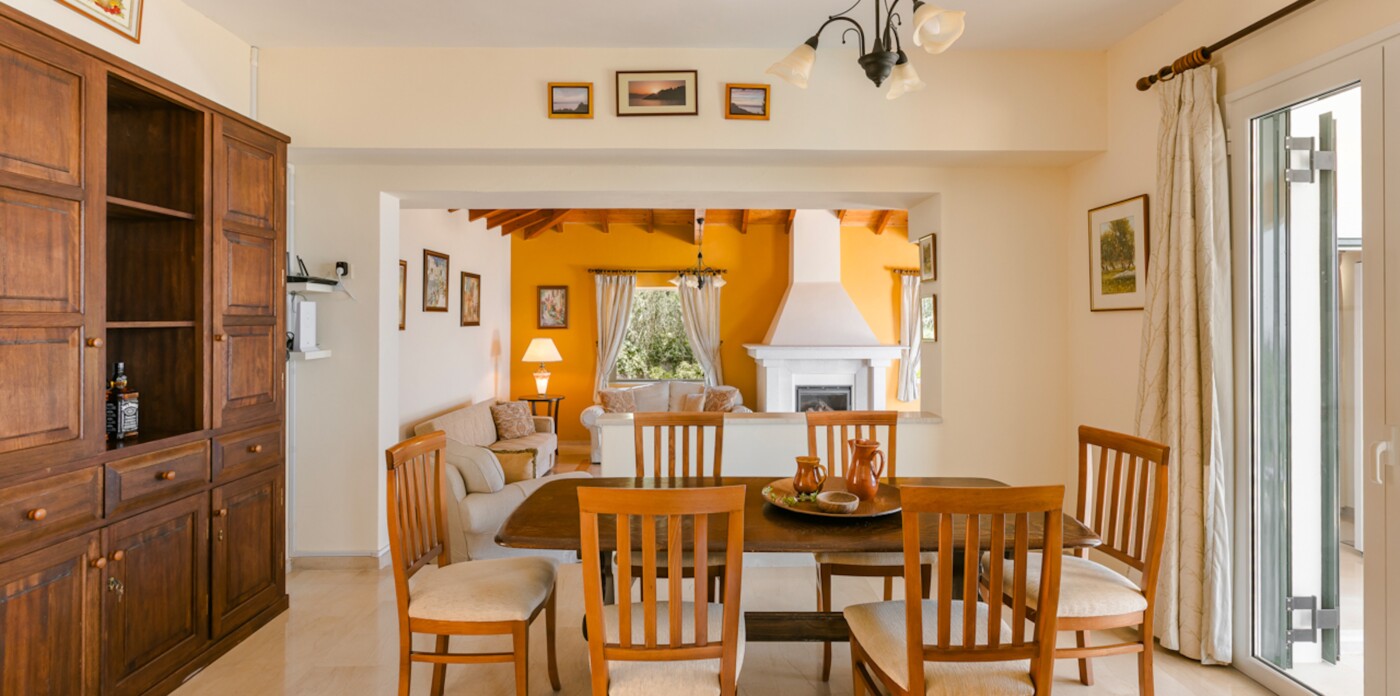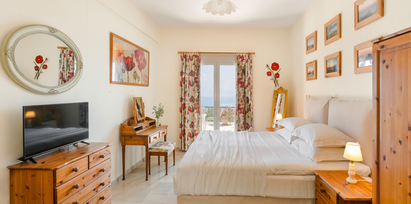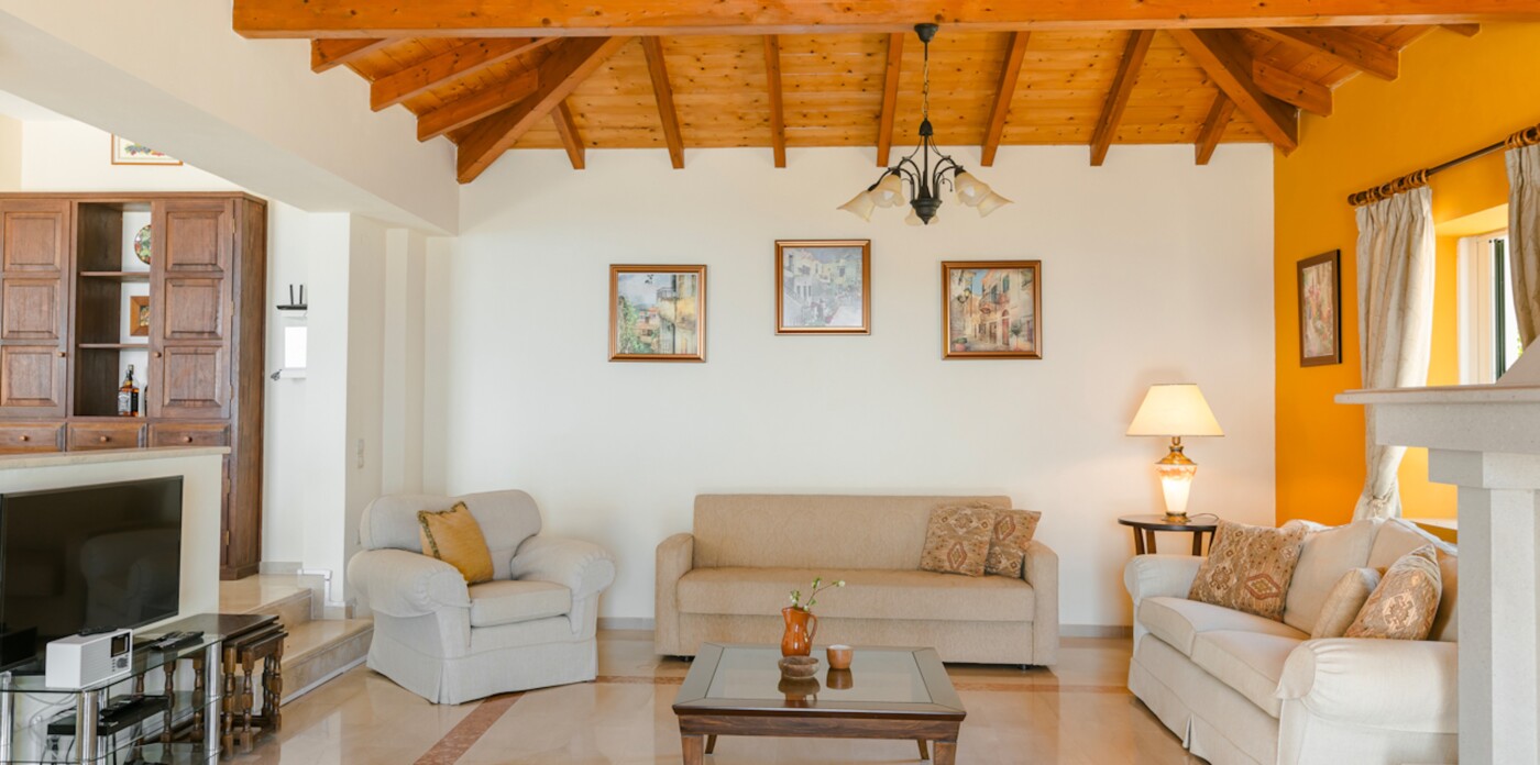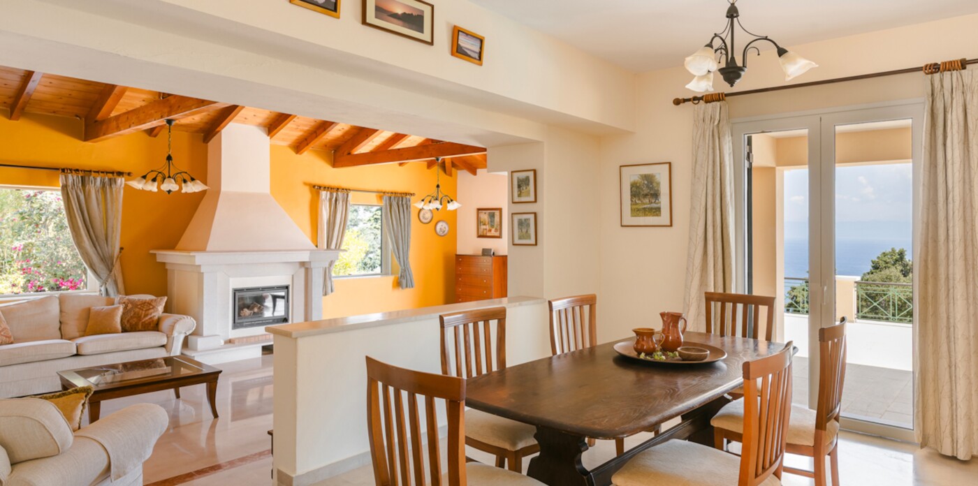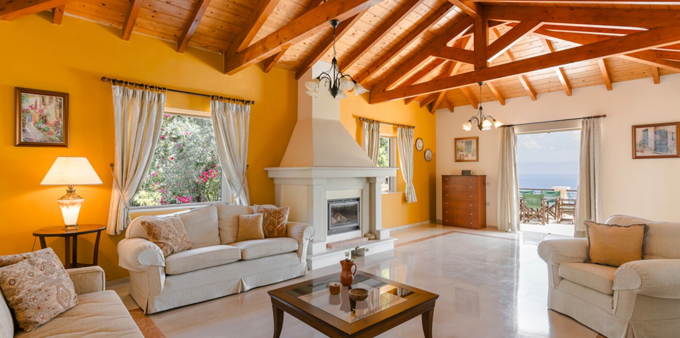 The living room, adorned with vaulted wooden beams and a cosy fireplace, sets the stage for relaxing evenings. Expansive terraces beckon you to unwind and soak up the mesmerizing panorama of the Ionian Sea, a view shared by the living area, kitchen, bedrooms, and even the games room.