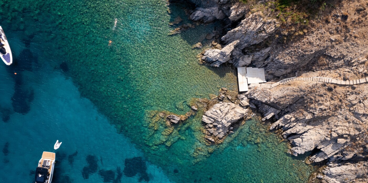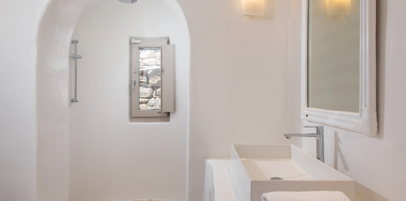 For those seeking moments of solitude, a private path leads down to a secluded cove, where a wooden deck invites you to bask in the sun or simply savor the tranquility of the sea. It’s the perfect escape to recharge and reconnect with nature, surrounded by the beauty of Mykonos.