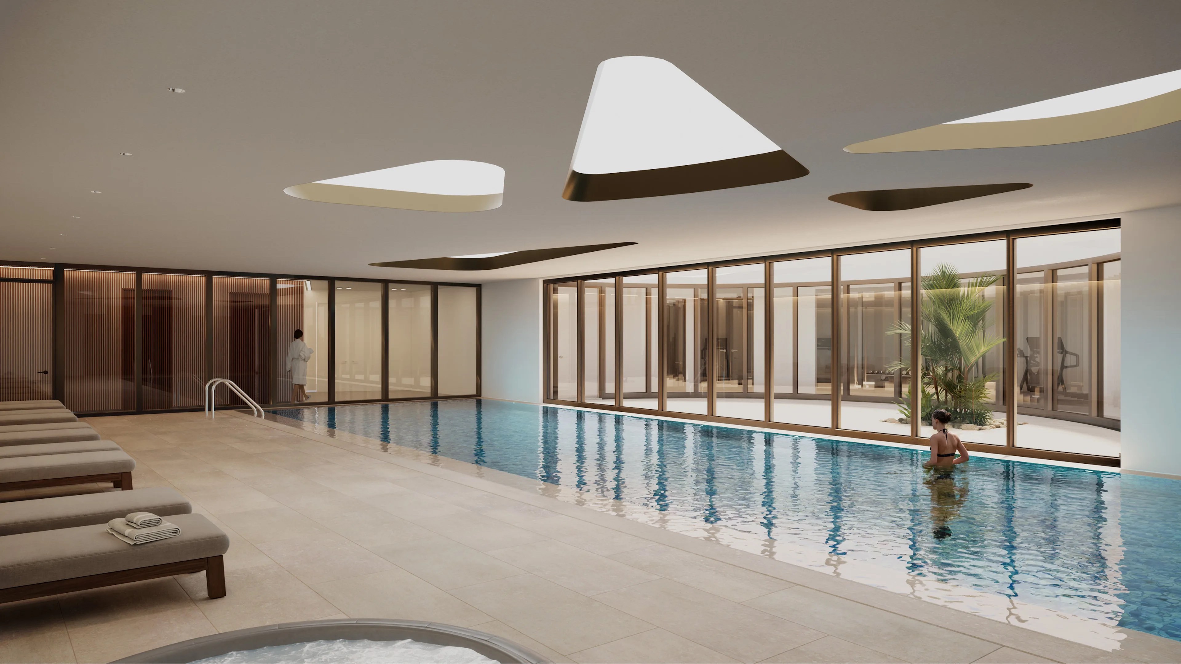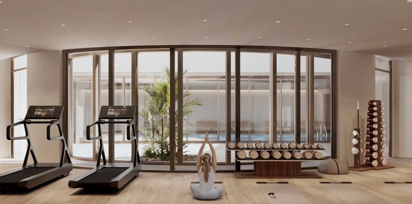 The Building B Residence apartment features 2 bedrooms and 3 bathrooms and has a fitness room and hammam spa, perfect for unwinding after a long day. Complete with an indoor and outdoor pool and pool bar, this smart home offers seamless integration of technology for added convenience, while underfloor heating and cooling ensures comfort throughout.