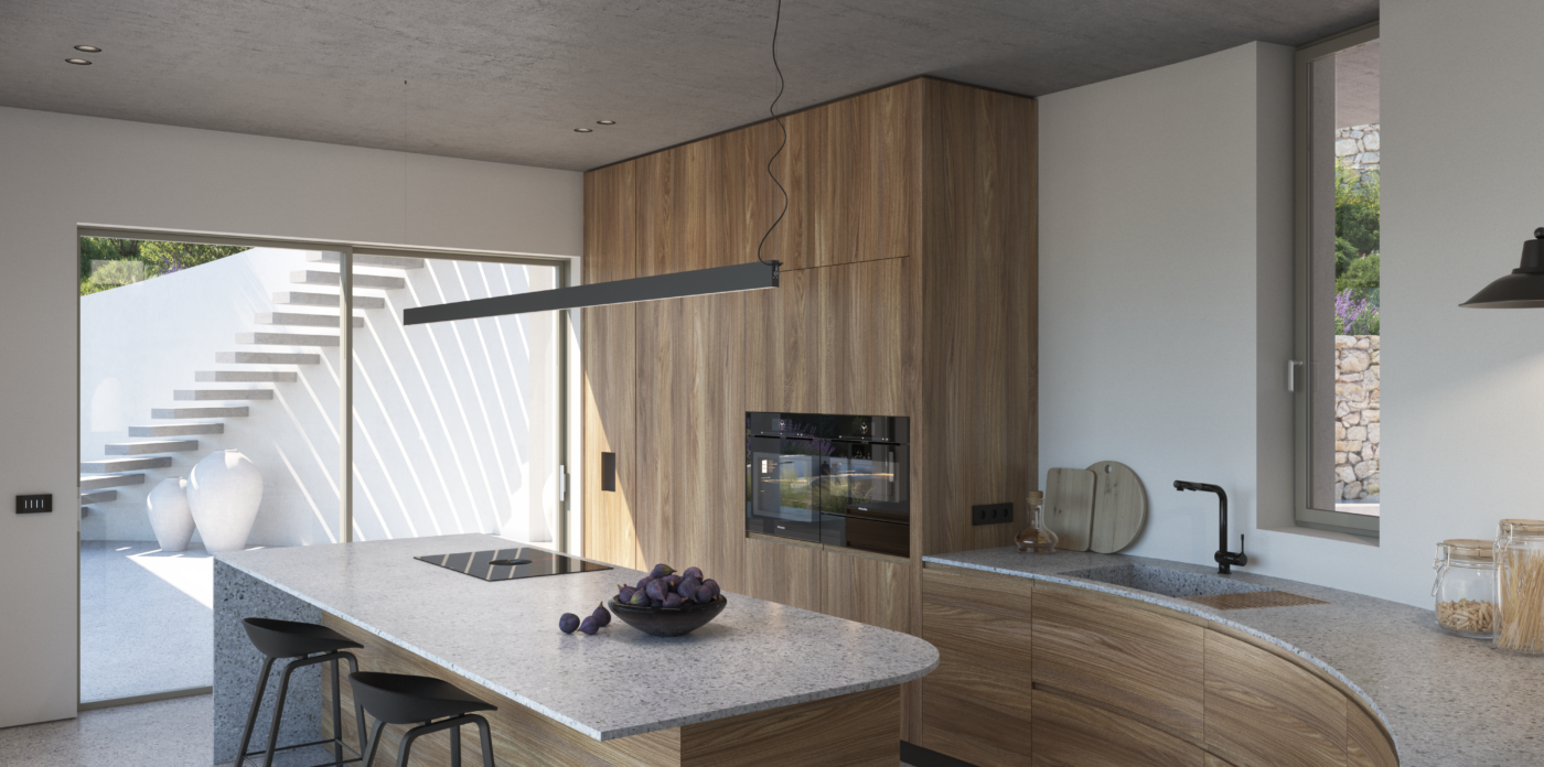 The villa’s location offers unobstructed views from every room and terrace. The ground floor incorporates an open-plan kitchen, dining, and living area with full height floor-to-ceiling windows. The upper level features three ensuite bedrooms, offering generous space to relax and unwind.