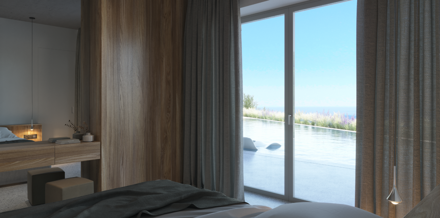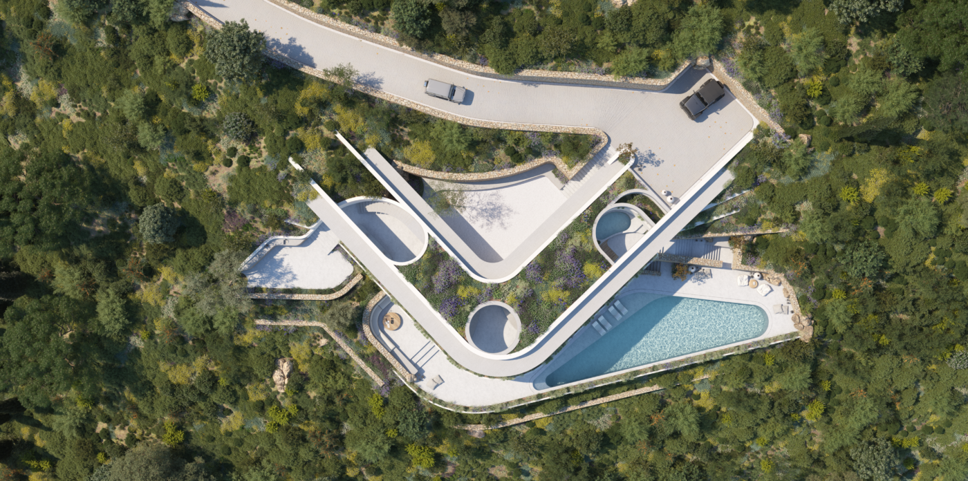 The lower level is dedicated to the master ensuite bedroom and a wellness room, creating a private hub for leisure and rejuvenation. The villa’s wrap-around configuration ensures maximum privacy. A triangular infinity pool overlooks the panoramic scenery, providing an opportunity to bask in the beauty of the surroundings.