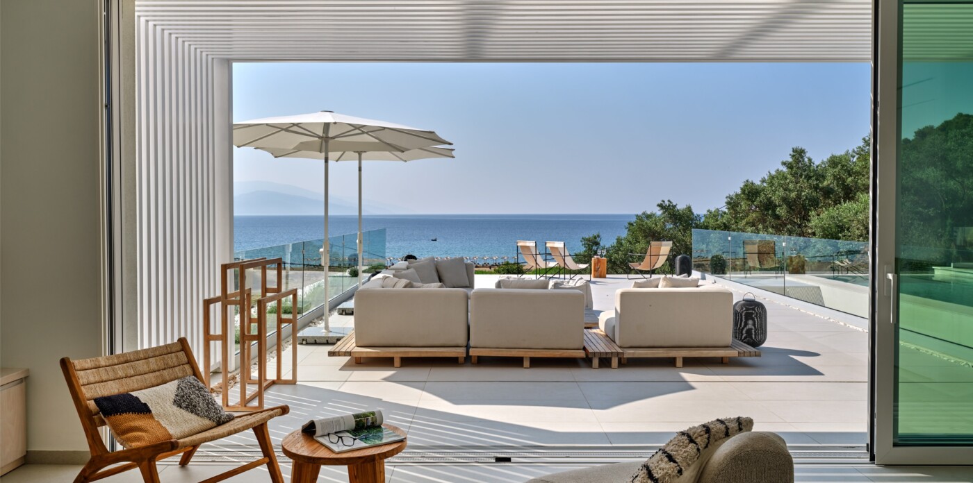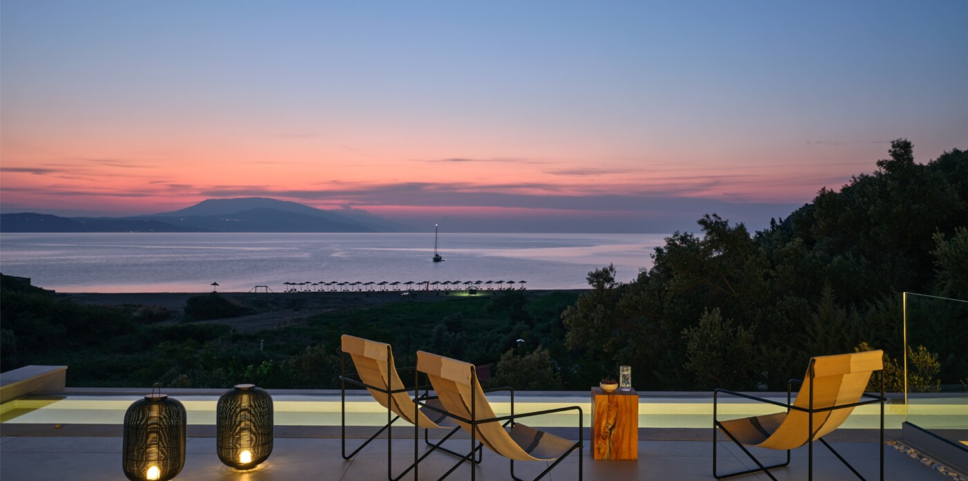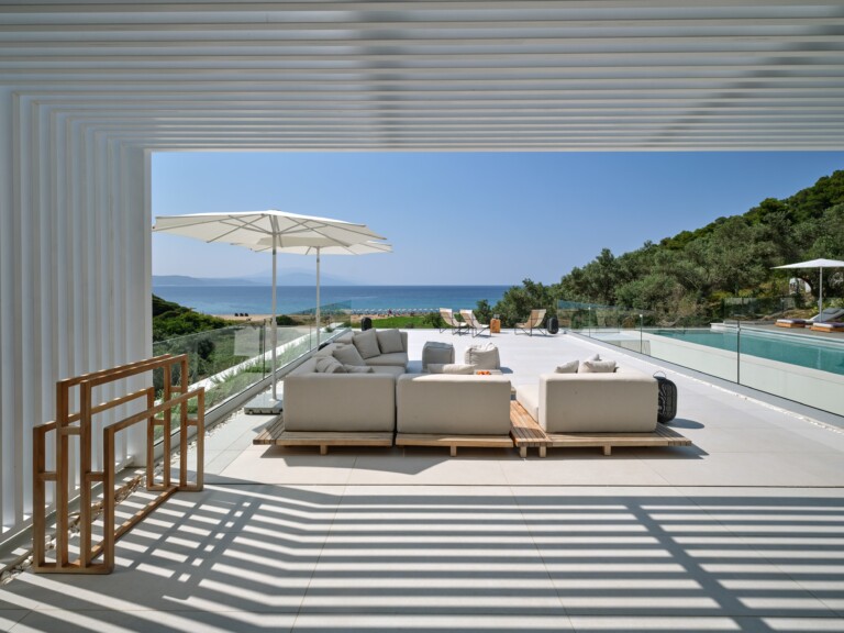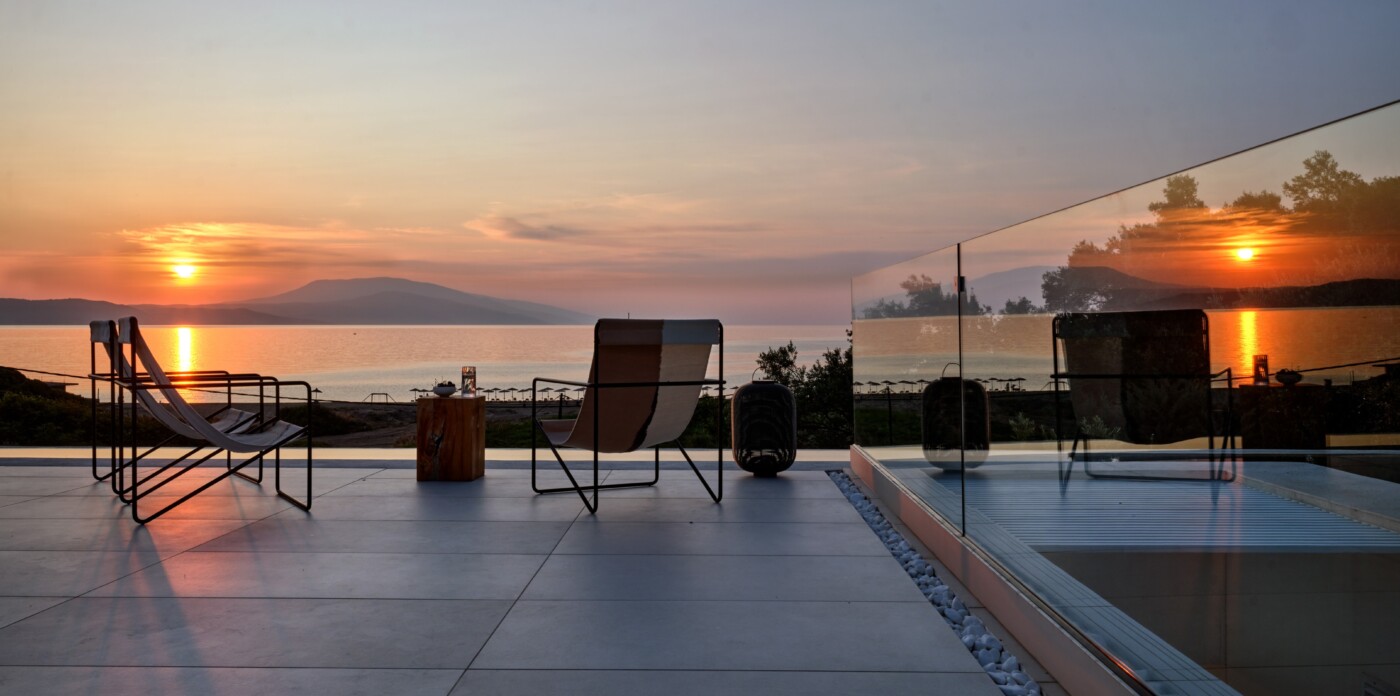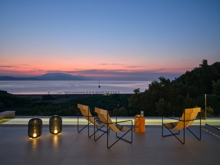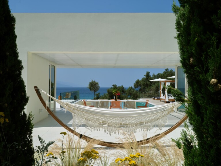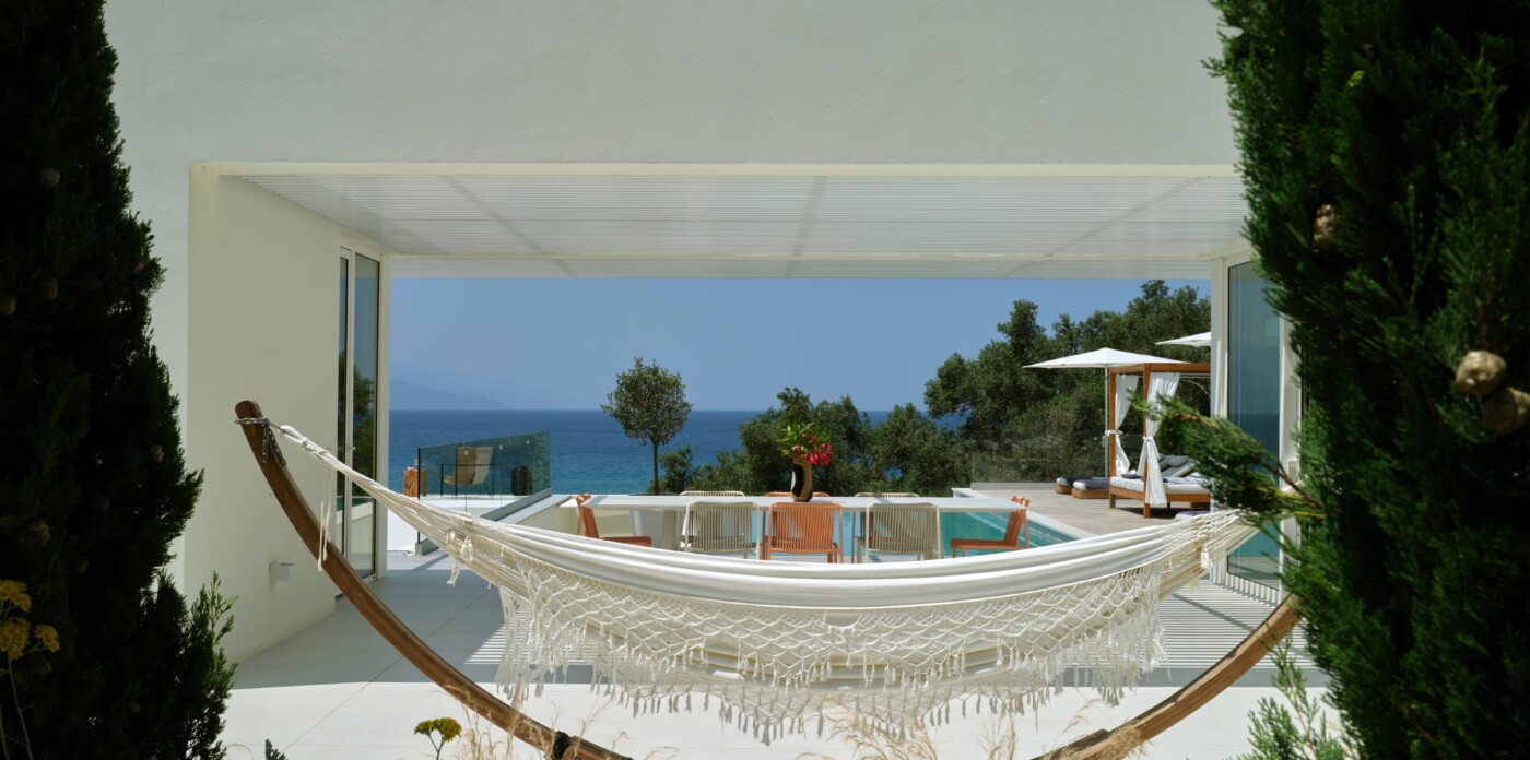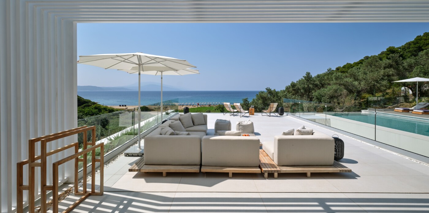 The expansive terrace opens to panoramic sea views, with the distant silhouette of the Pelion Peninsula on the horizon. Outdoor living is a true delight here, with hammocks, sunbeds, and shaded lounges inviting you to relax and unwind.