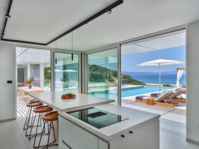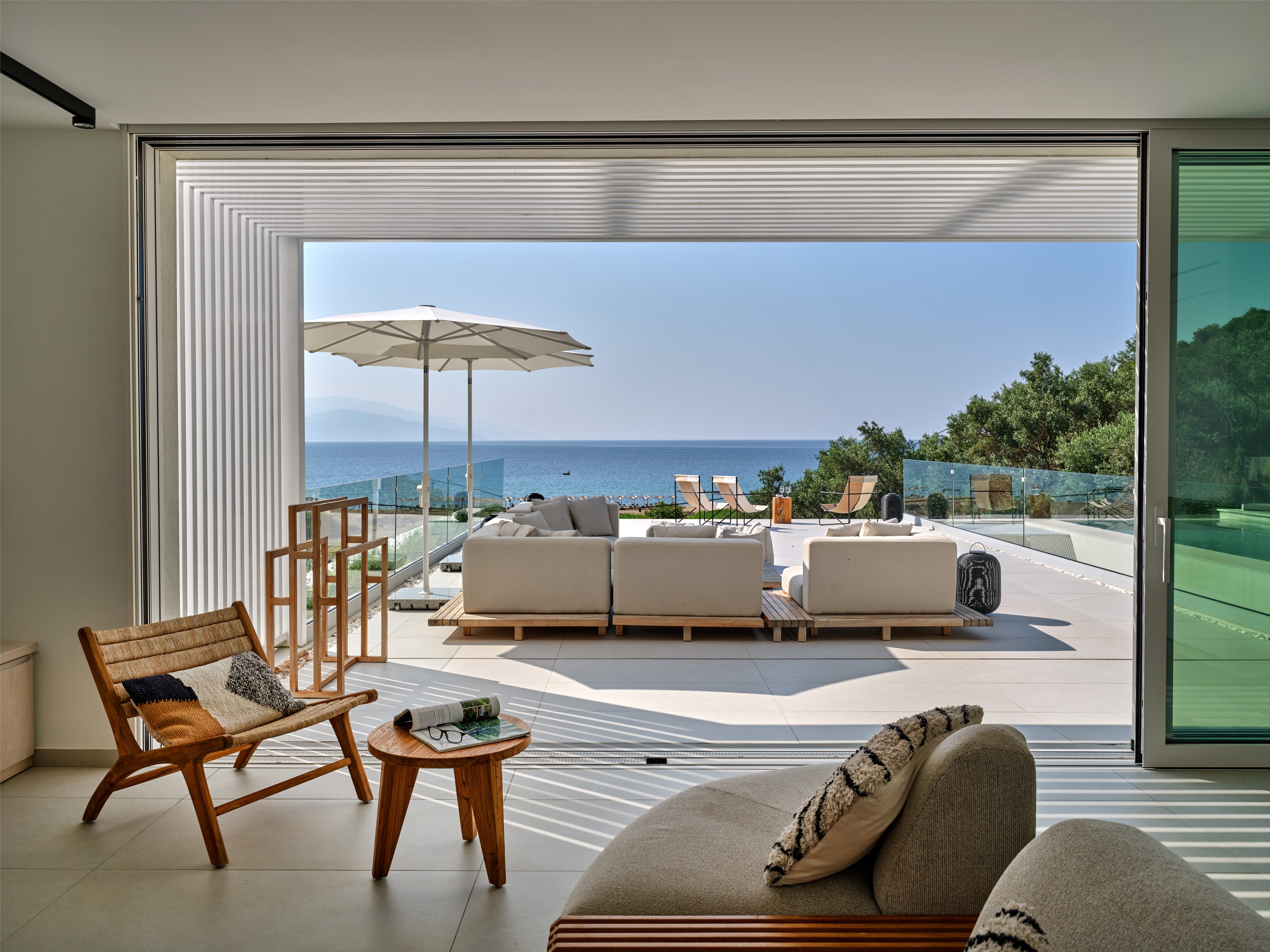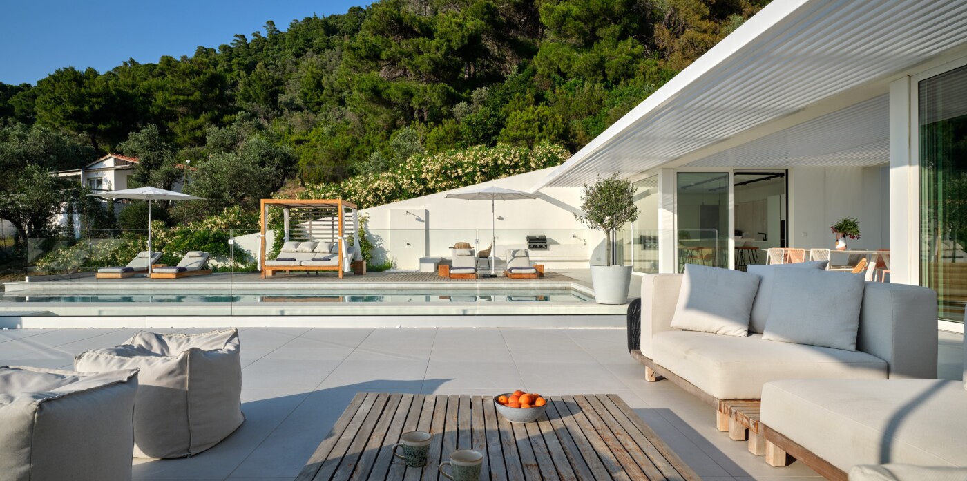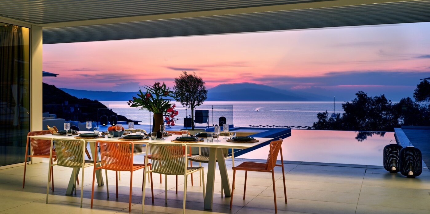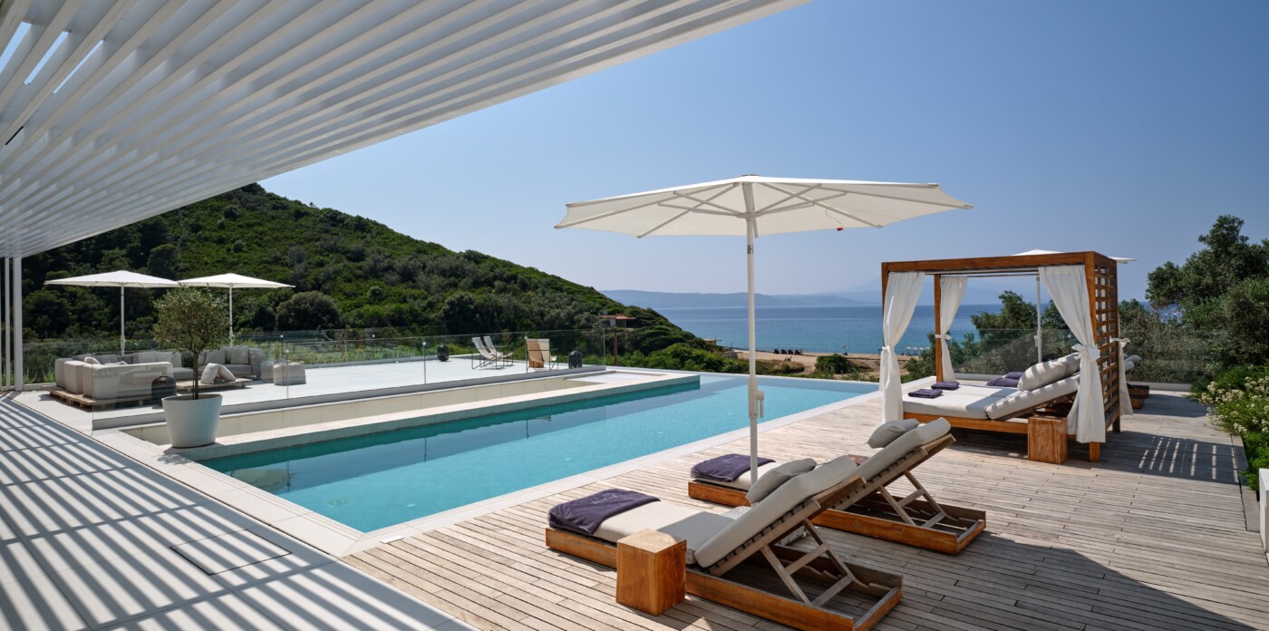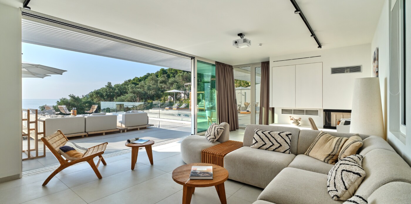 The expansive terrace opens to panoramic sea views, with the distant silhouette of the Pelion Peninsula on the horizon. Outdoor living is a true delight here, with hammocks, sunbeds, and shaded lounges inviting you to relax and unwind.