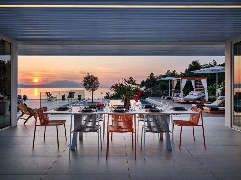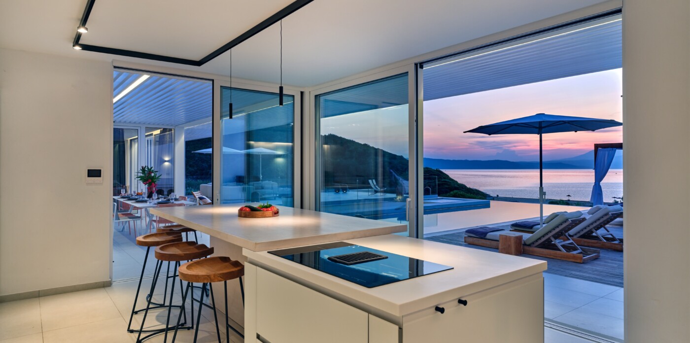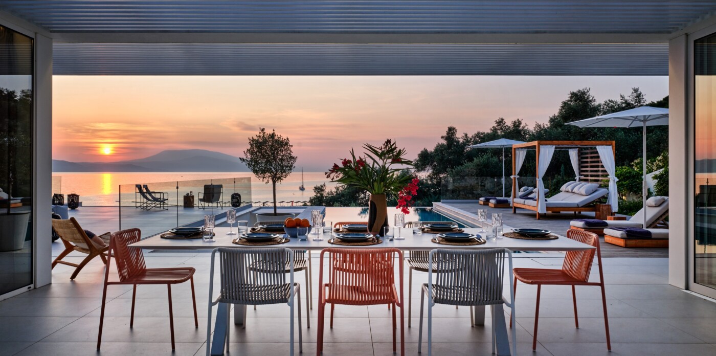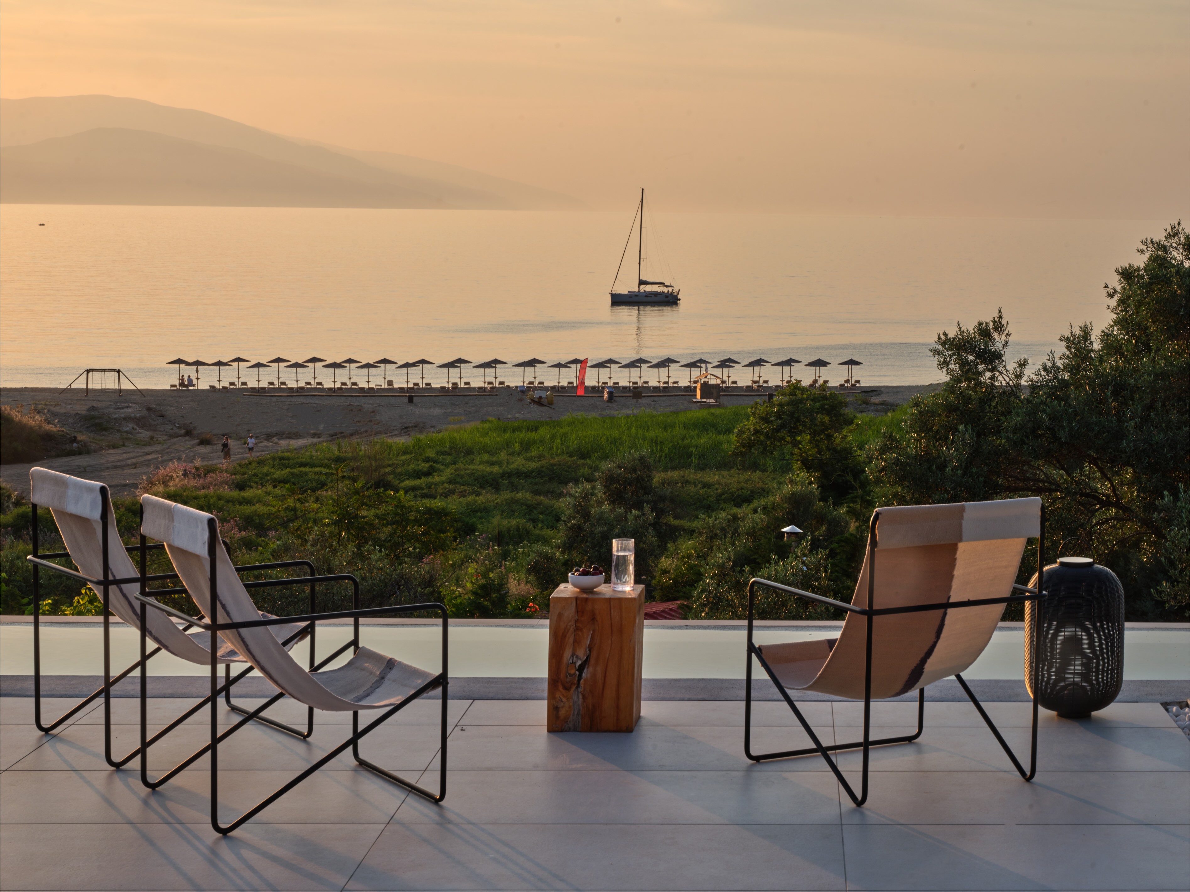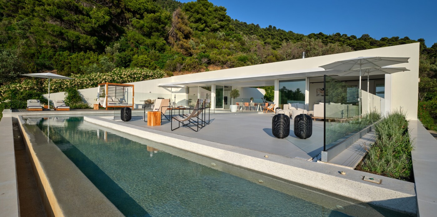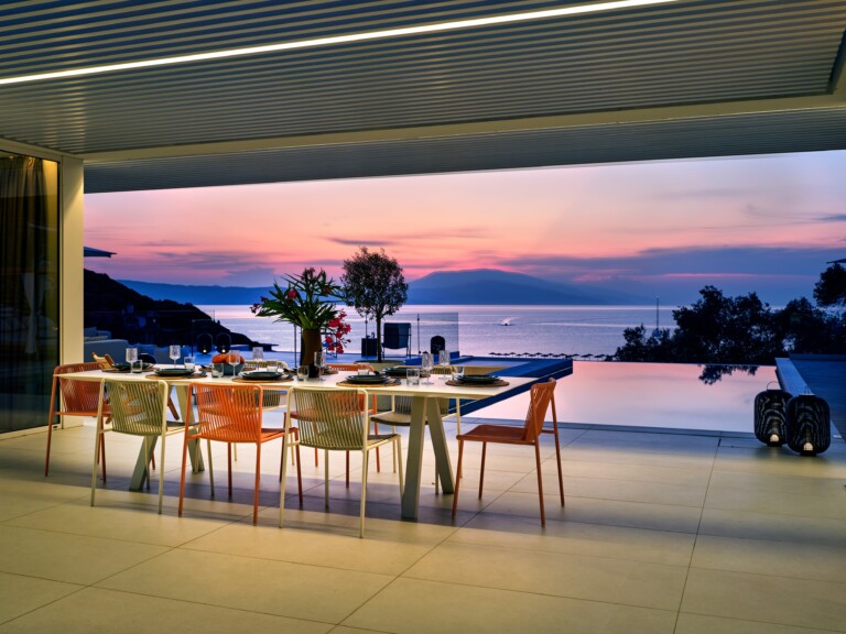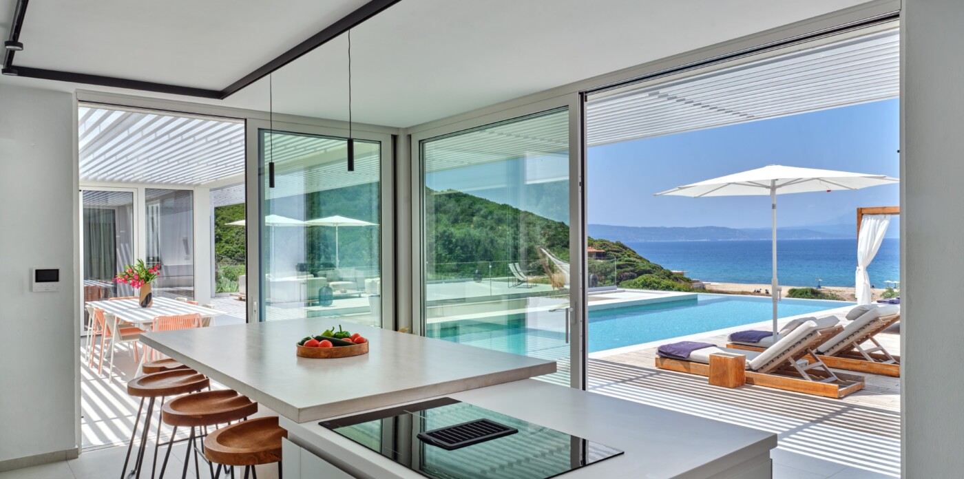 The expansive terrace opens to panoramic sea views, with the distant silhouette of the Pelion Peninsula on the horizon. Outdoor living is a true delight here, with hammocks, sunbeds, and shaded lounges inviting you to relax and unwind.