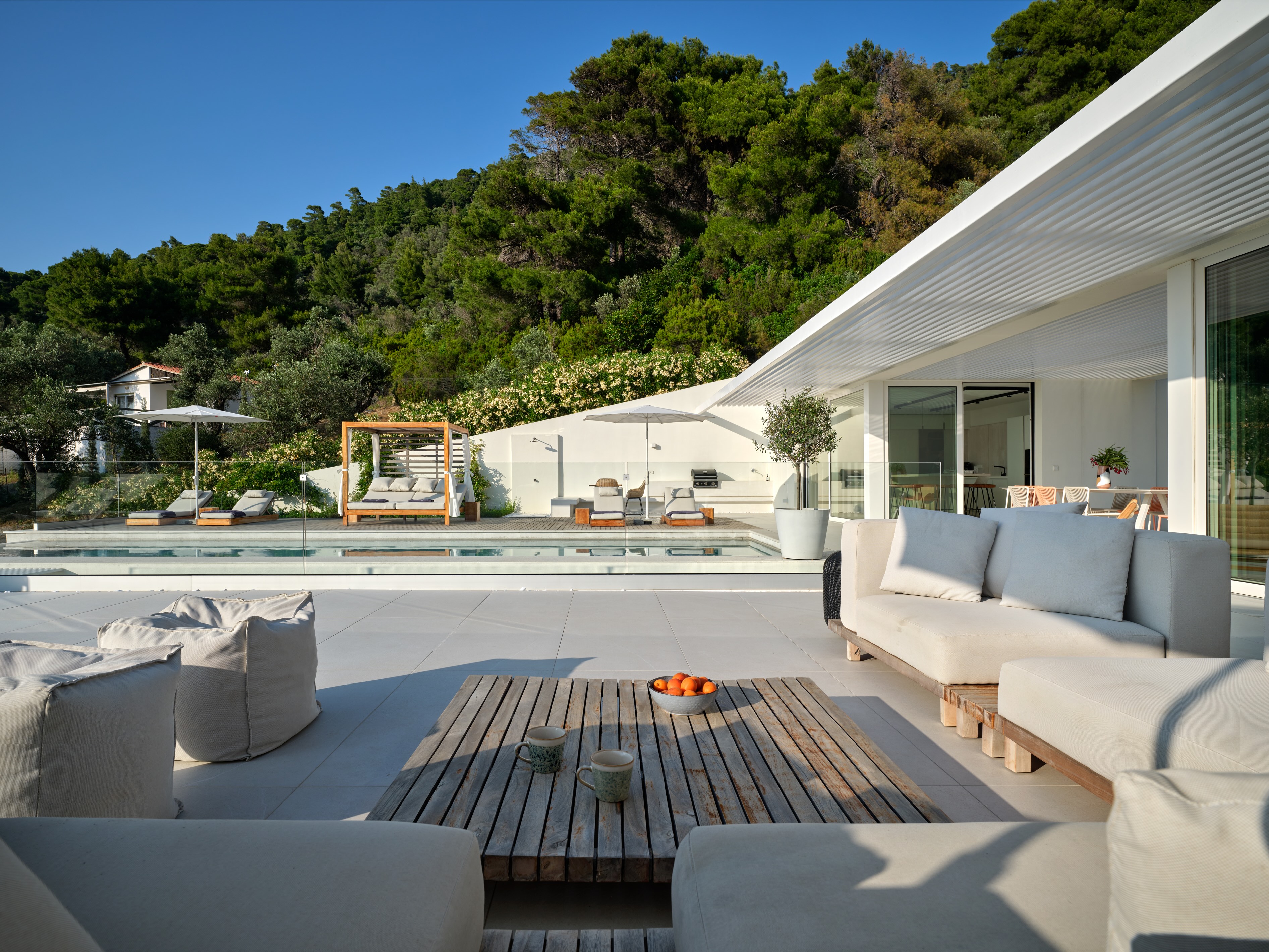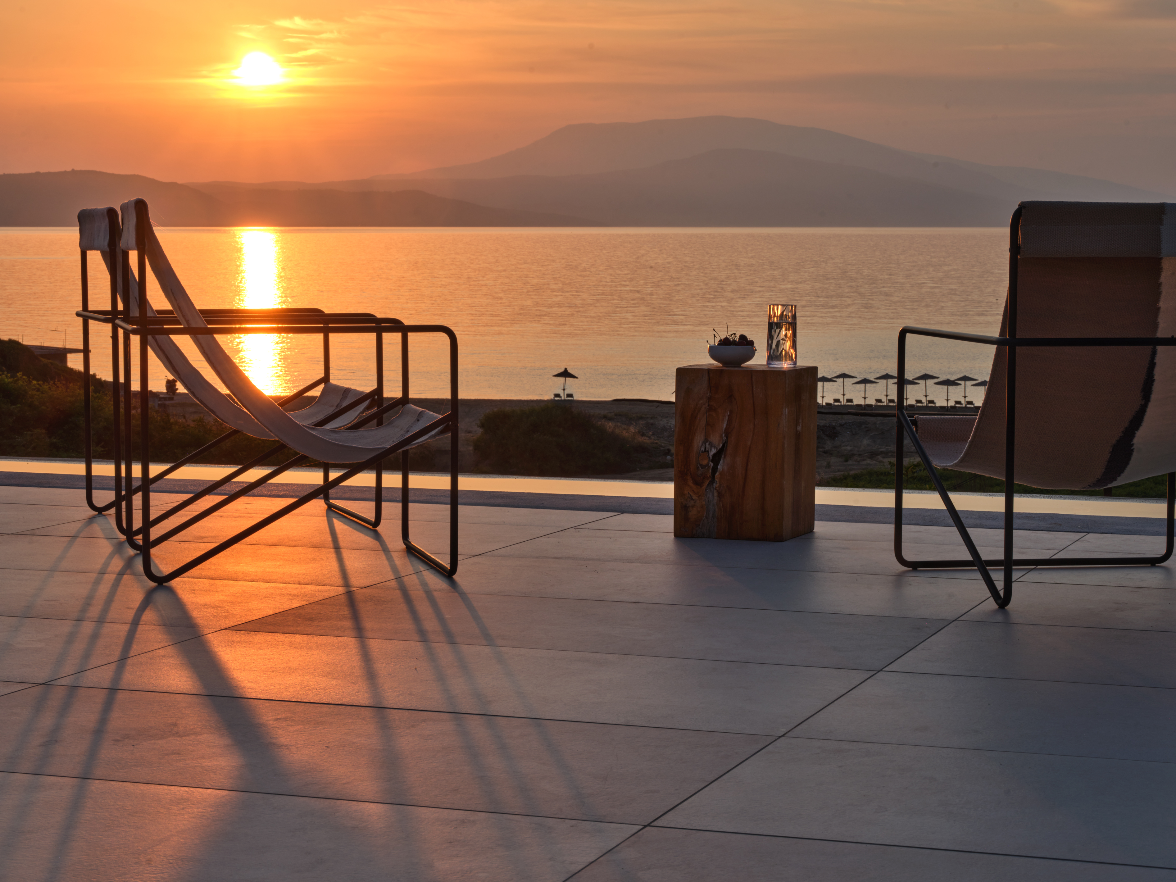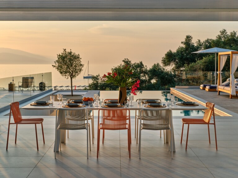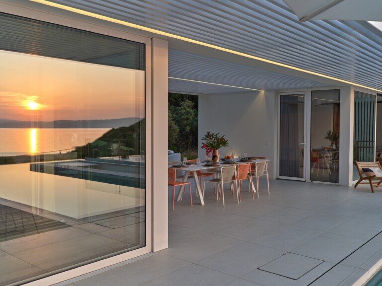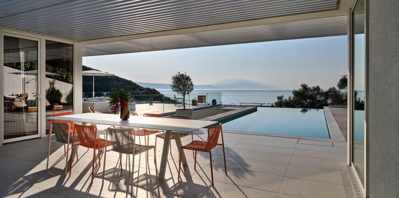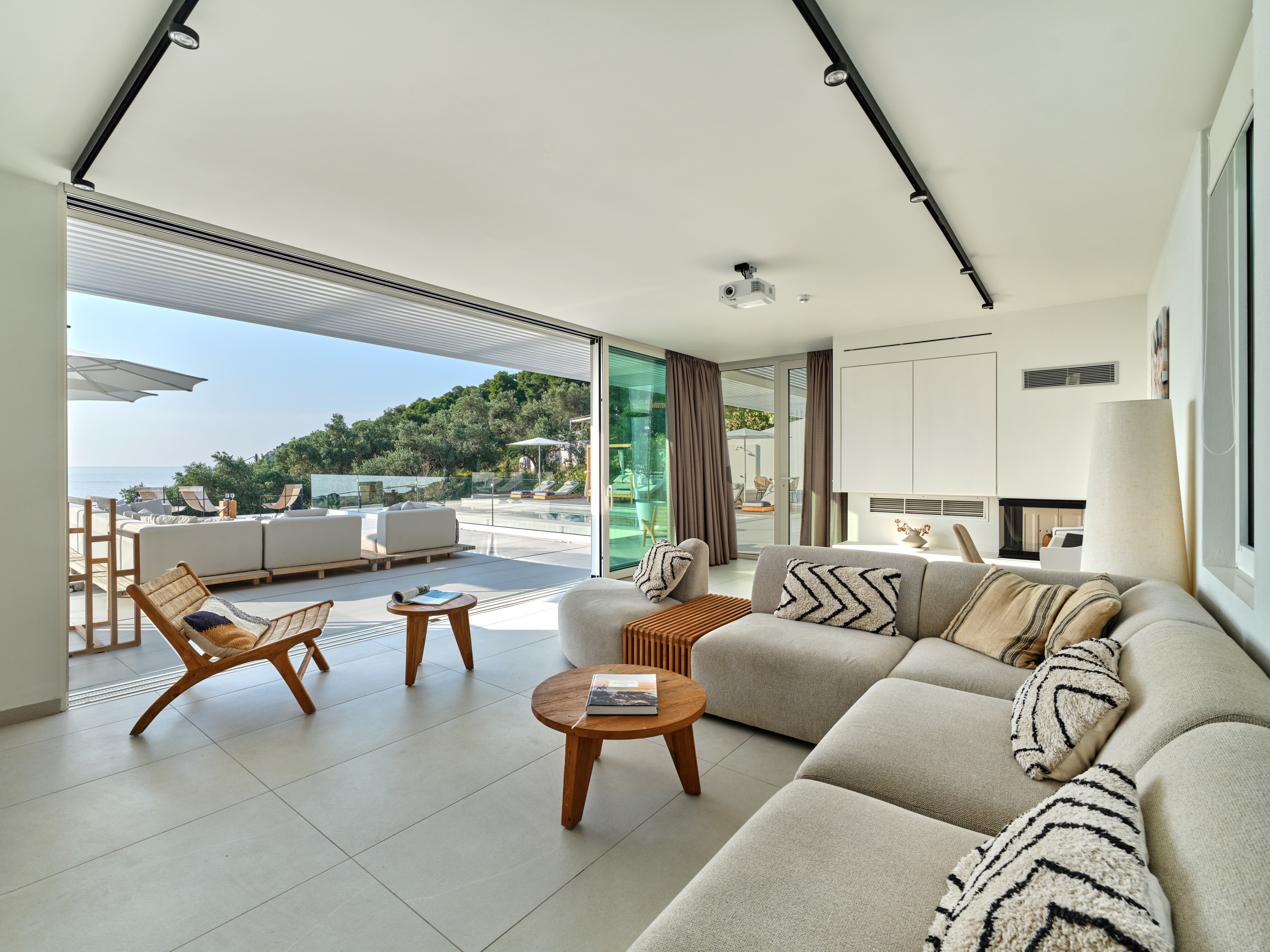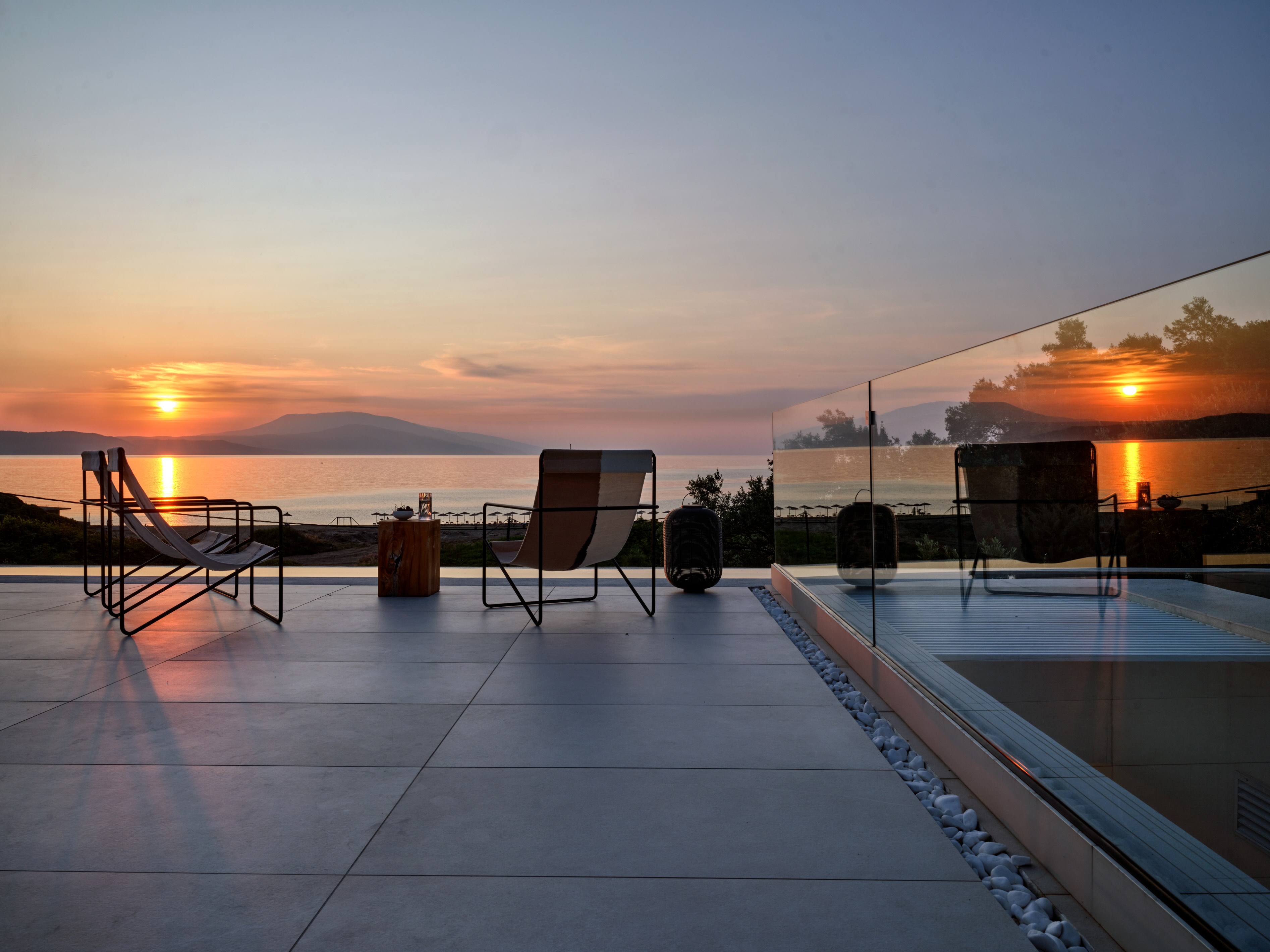 The expansive terrace opens to panoramic sea views, with the distant silhouette of the Pelion Peninsula on the horizon. Outdoor living is a true delight here, with hammocks, sunbeds, and shaded lounges inviting you to relax and unwind.