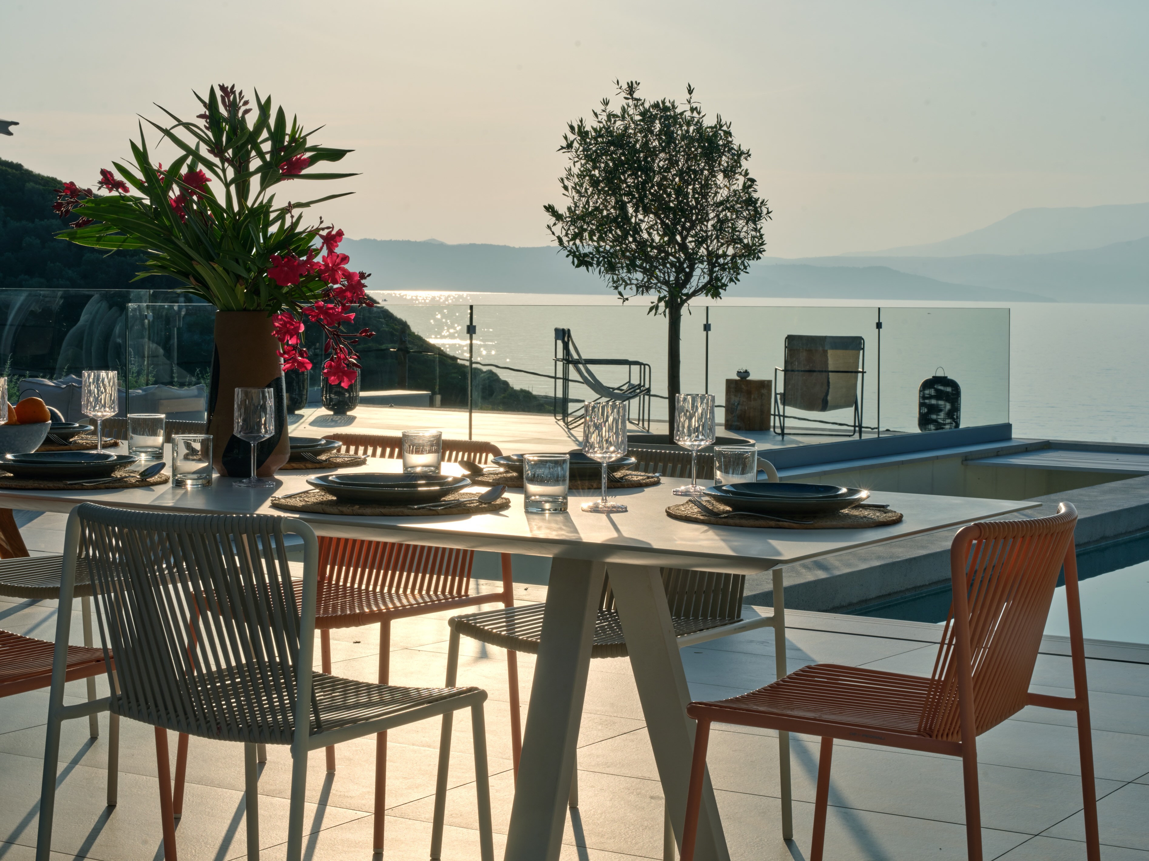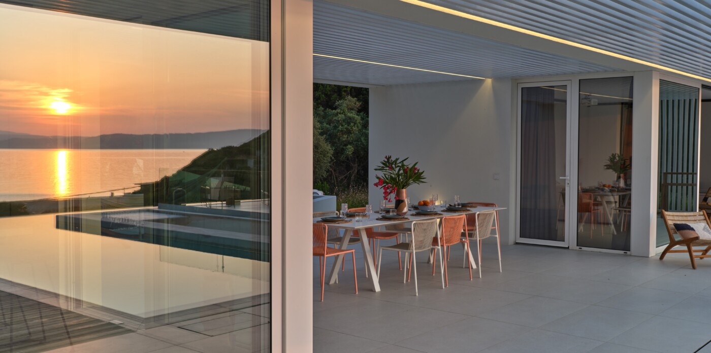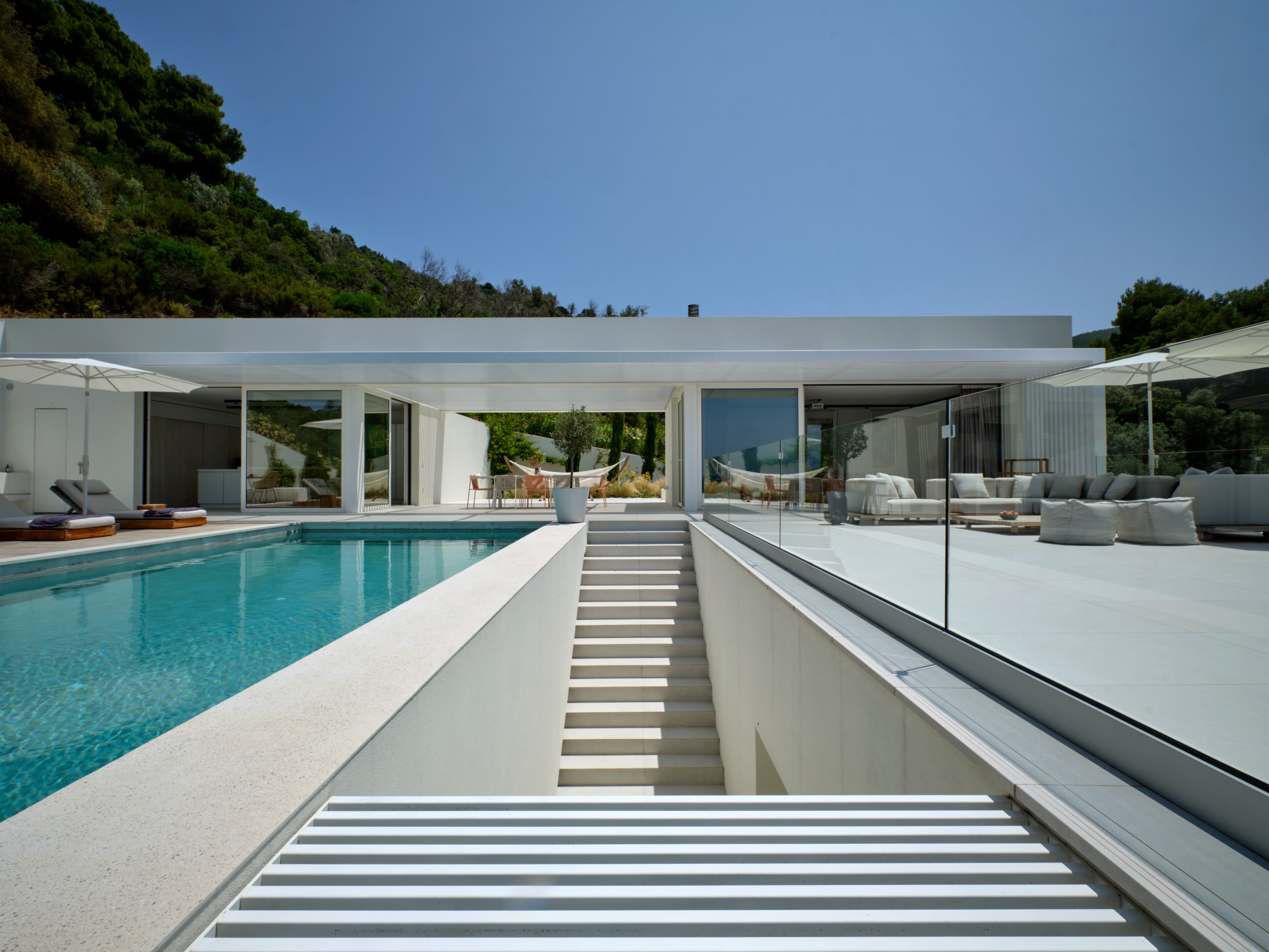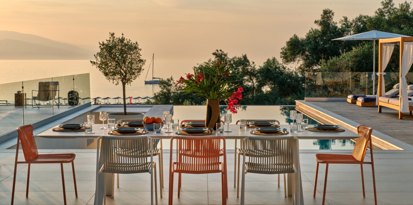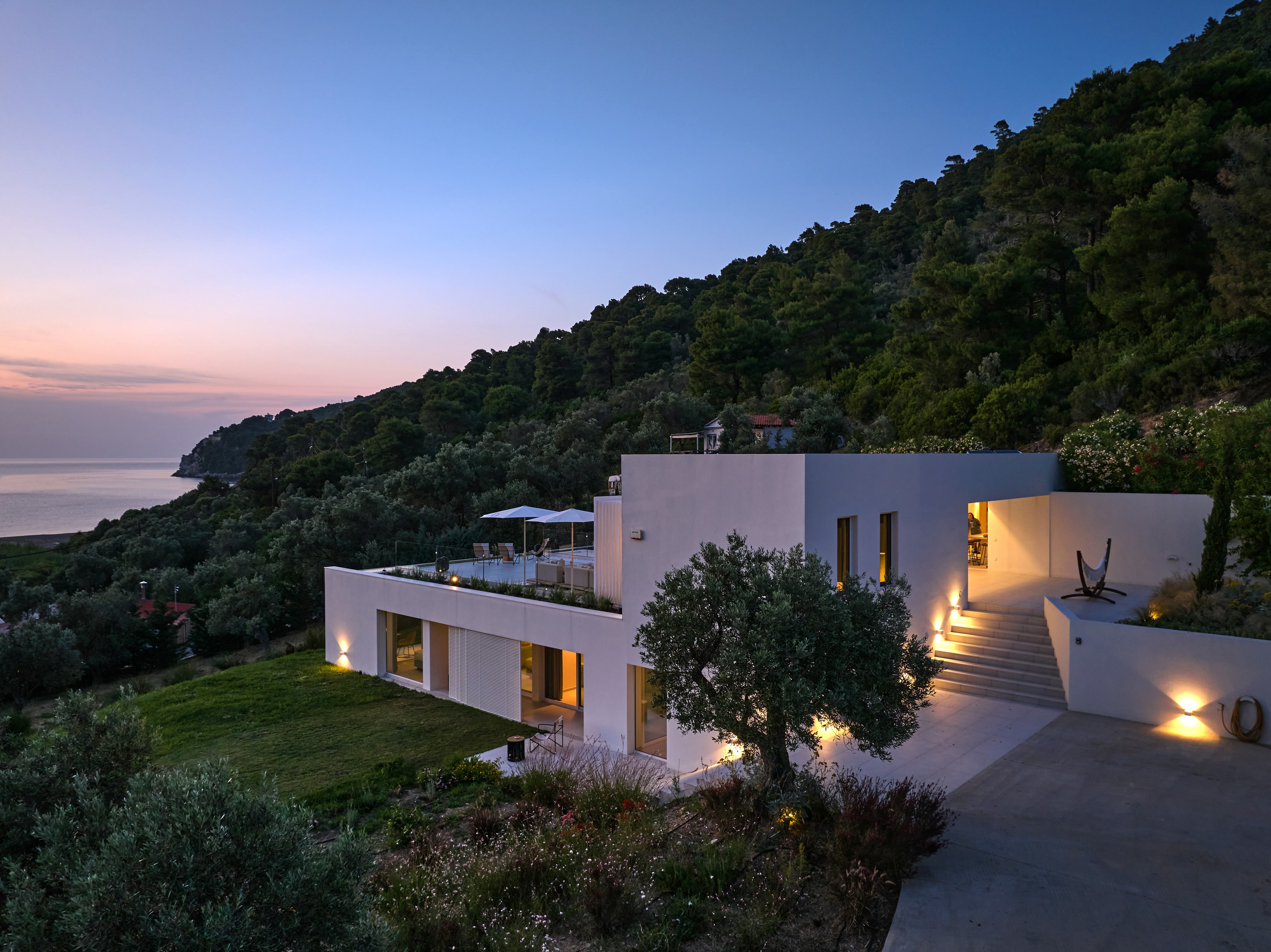 The expansive terrace opens to panoramic sea views, with the distant silhouette of the Pelion Peninsula on the horizon. Outdoor living is a true delight here, with hammocks, sunbeds, and shaded lounges inviting you to relax and unwind.