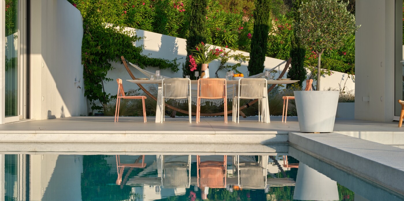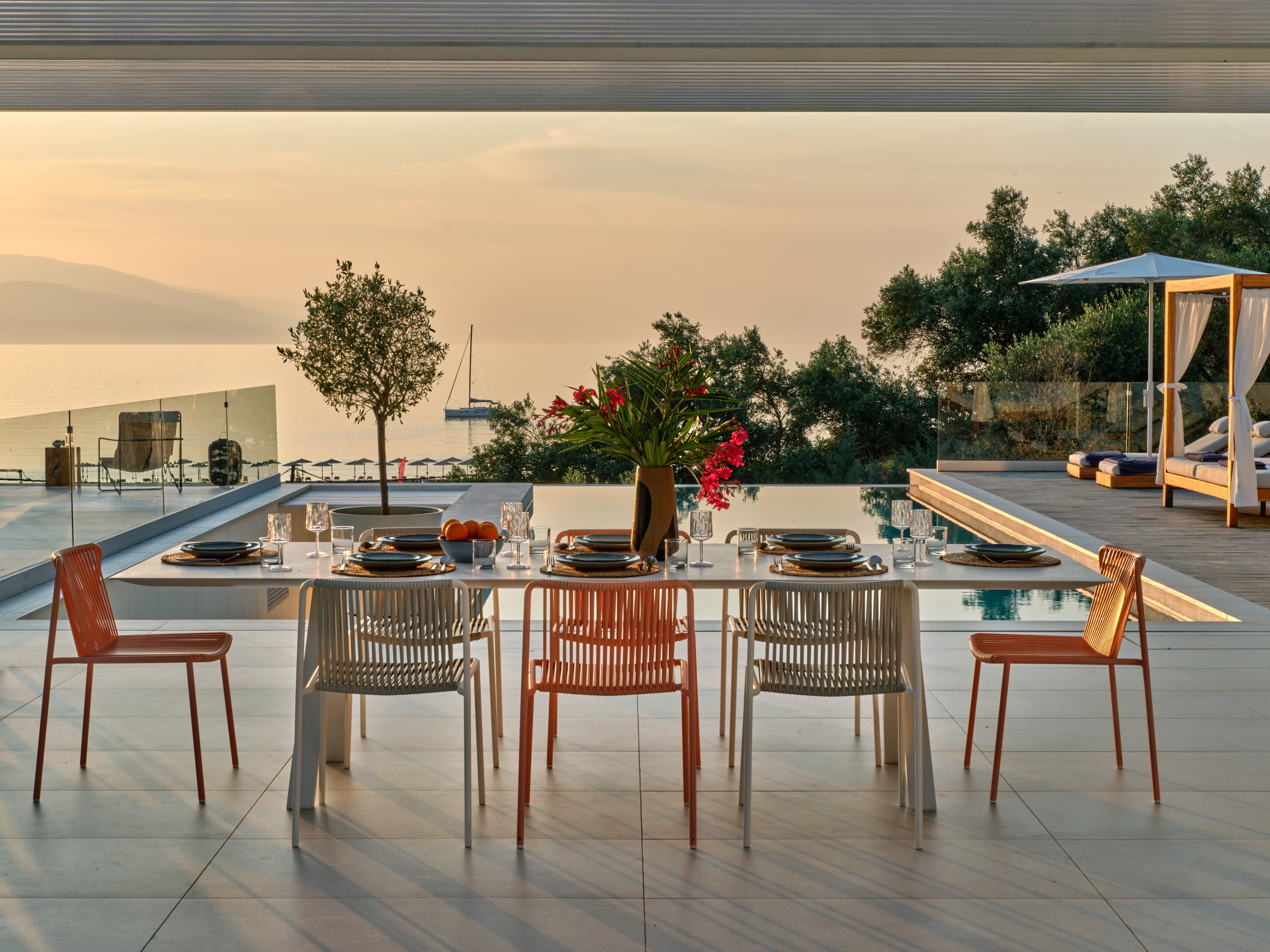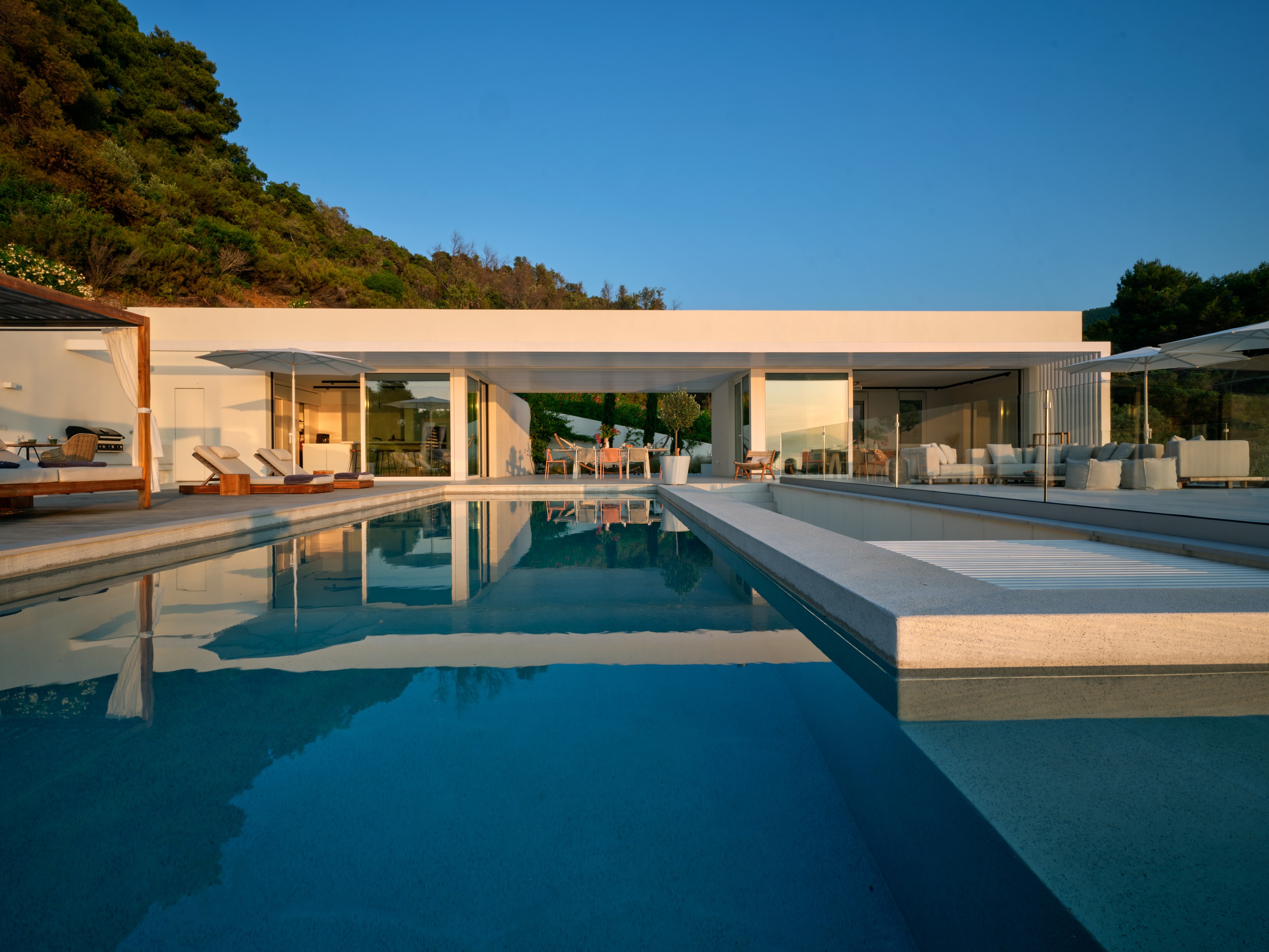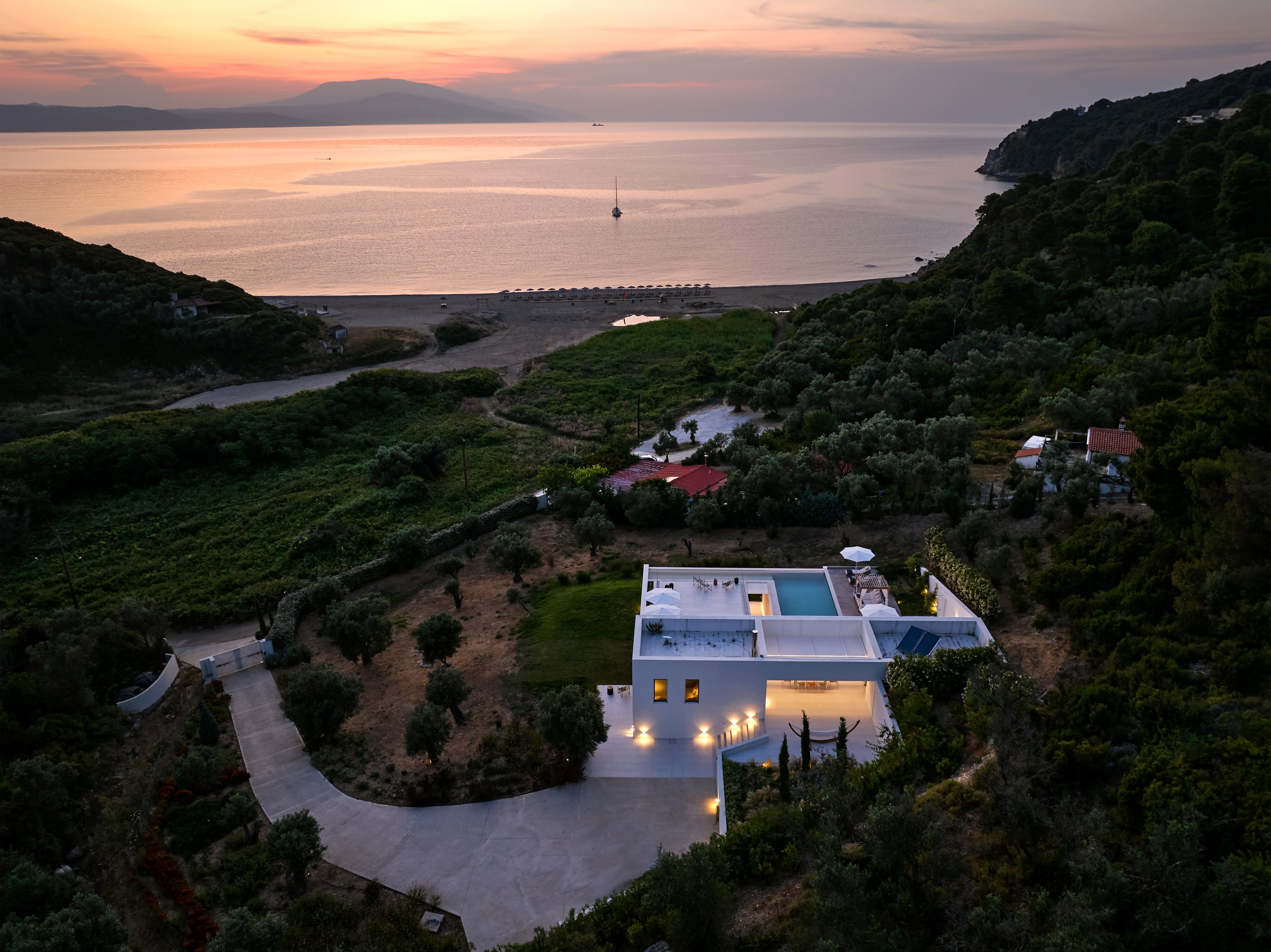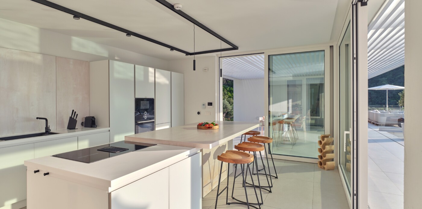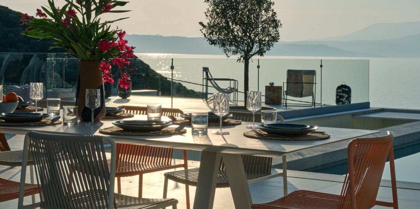 The expansive terrace opens to panoramic sea views, with the distant silhouette of the Pelion Peninsula on the horizon. Outdoor living is a true delight here, with hammocks, sunbeds, and shaded lounges inviting you to relax and unwind.