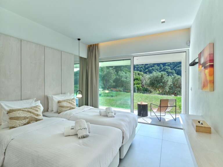 Inside, the villa’s open-plan layout connects a fully equipped kitchen and inviting seating area with a cozy living space, complete with a fireplace and home cinema. Wide stairs lead to the garden level, where four ensuite bedrooms offer comfort and privacy amid the tranquil landscape.