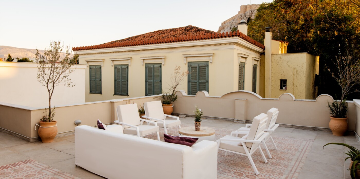 The rooftop terrace commands magnificent views of the Acropolis, its timeless silhouette a captivating sight by day and night.