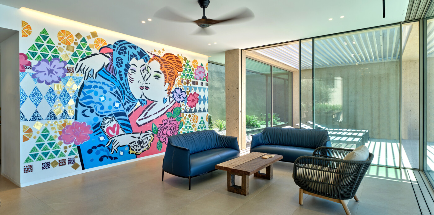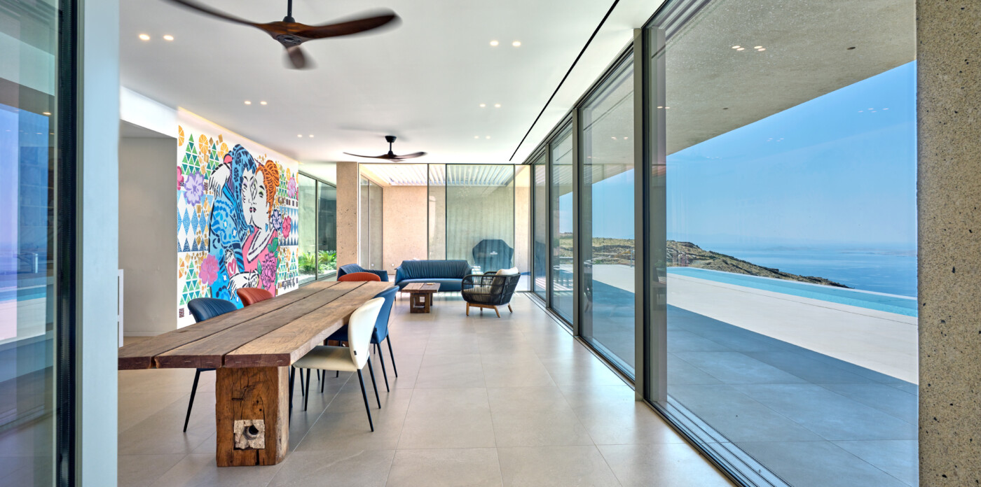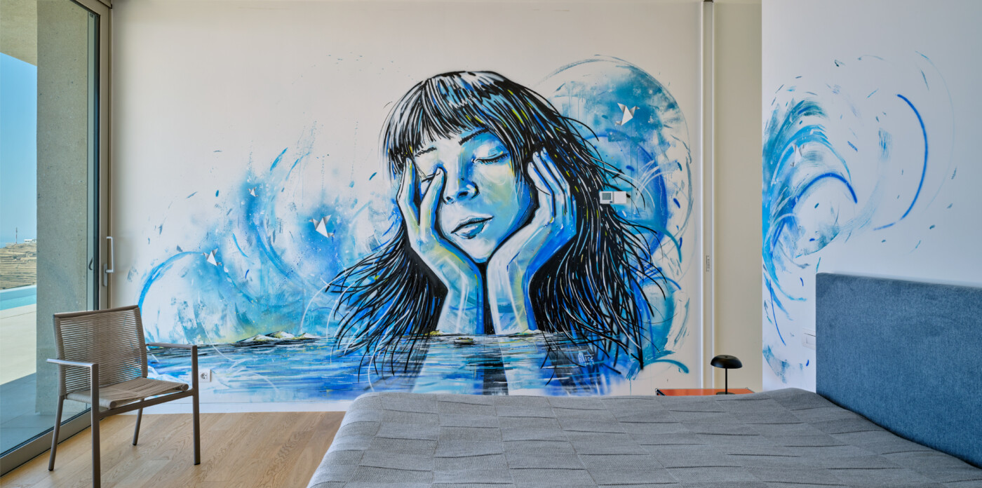 The interiors are adorned with original wall paintings by globally acclaimed street artists, creating a striking contrast between rugged island textures and avant-garde creativity. Each room tells a story, inviting both conversation and contemplation.