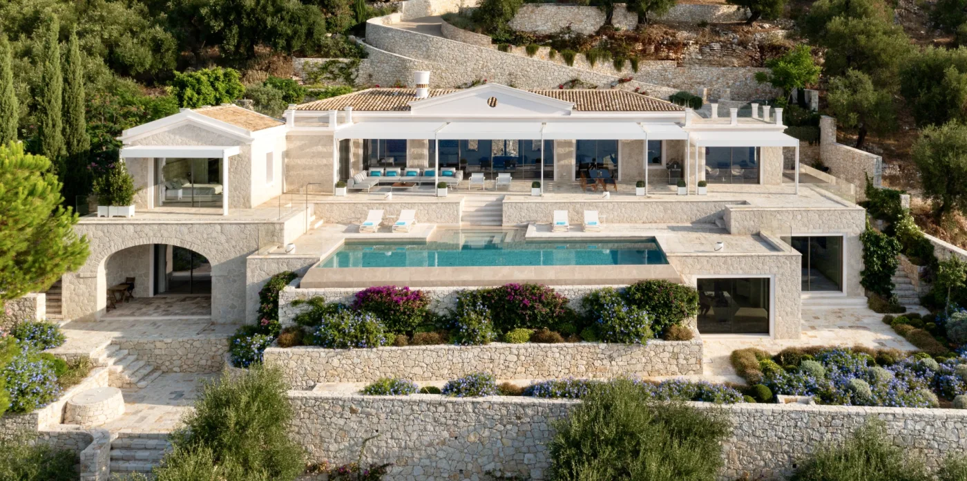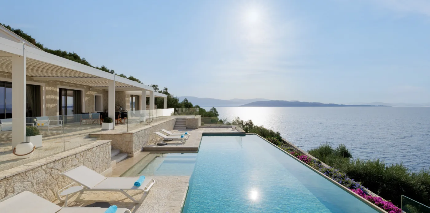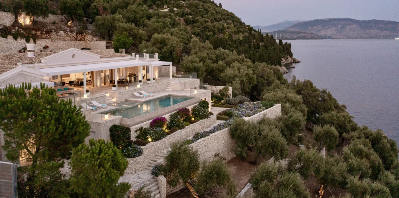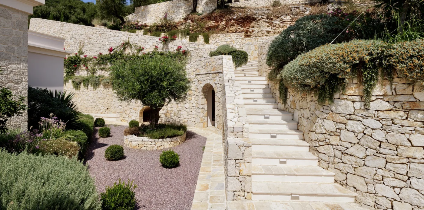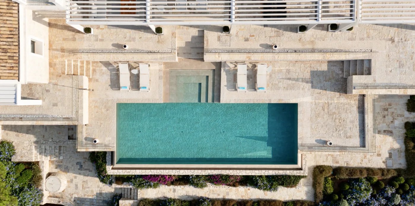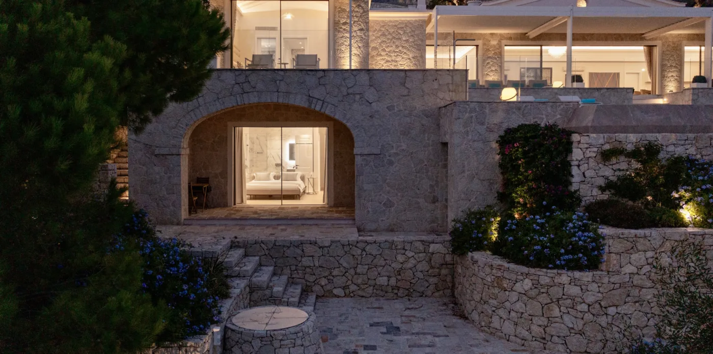Located in Agni, Ayline is situated just a brief stroll from the picturesque bay and its famous beachfront restaurants. The villa showcases a unique blend of Corfiot and Venetian architectural influences fused with modern aesthetics. Two distinctive features are the windows that amplify the panoramic views and the stone used on the façade and exterior walls, which was sourced directly from the property’s grounds. Each stone was meticulously hand-shaped by a skilled craftsman and fitted together like pieces of an intricate puzzle.