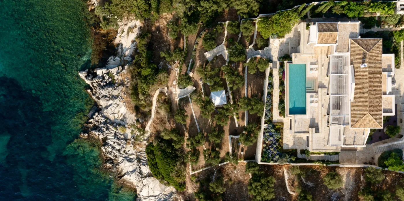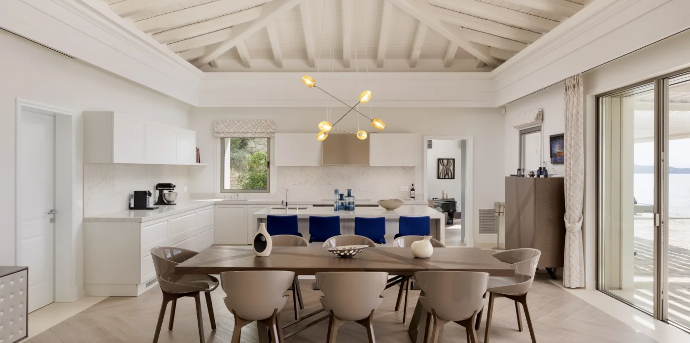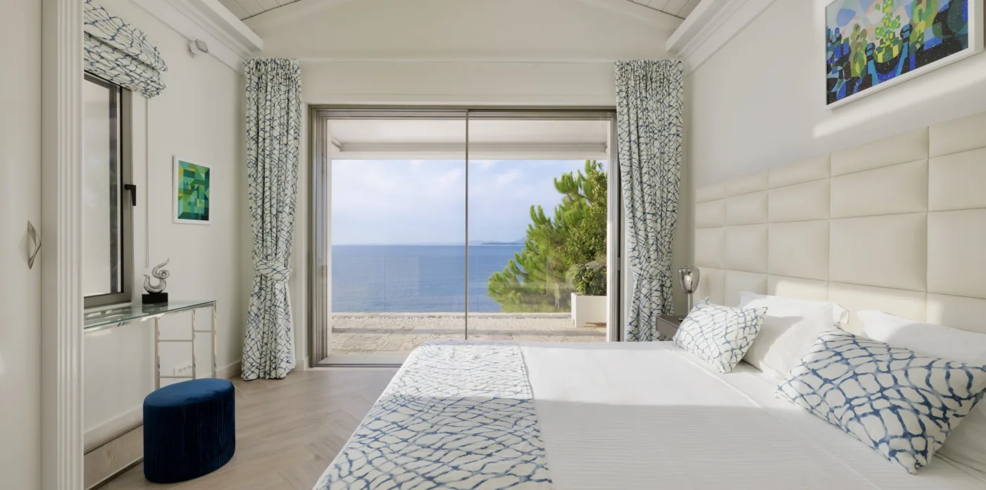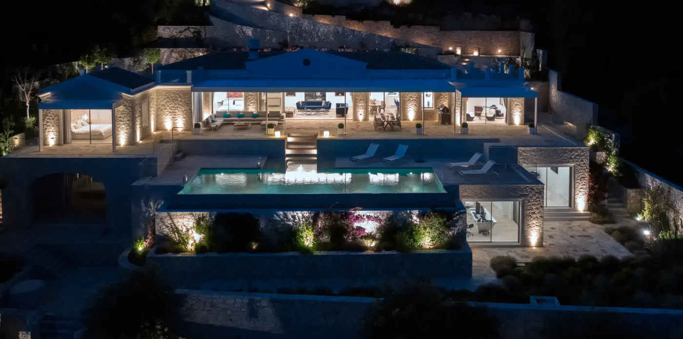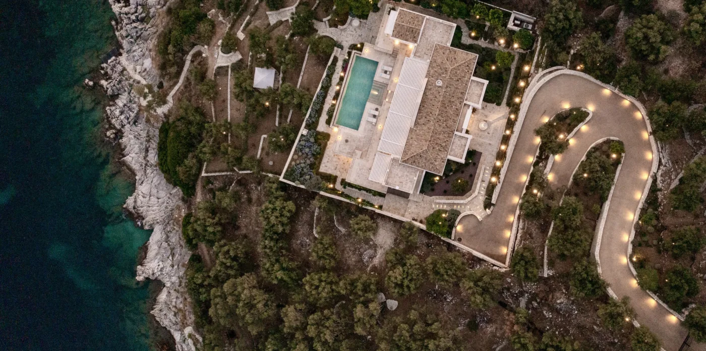 Located in Agni, Ayline is situated just a brief stroll from the picturesque bay and its famous beachfront restaurants. The villa showcases a unique blend of Corfiot and Venetian architectural influences fused with modern aesthetics. Two distinctive features are the windows that amplify the panoramic views and the stone used on the façade and exterior walls, which was sourced directly from the property’s grounds. Each stone was meticulously hand-shaped by a skilled craftsman and fitted together like pieces of an intricate puzzle.