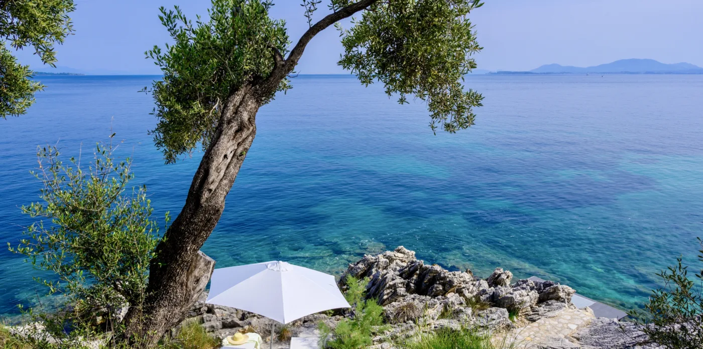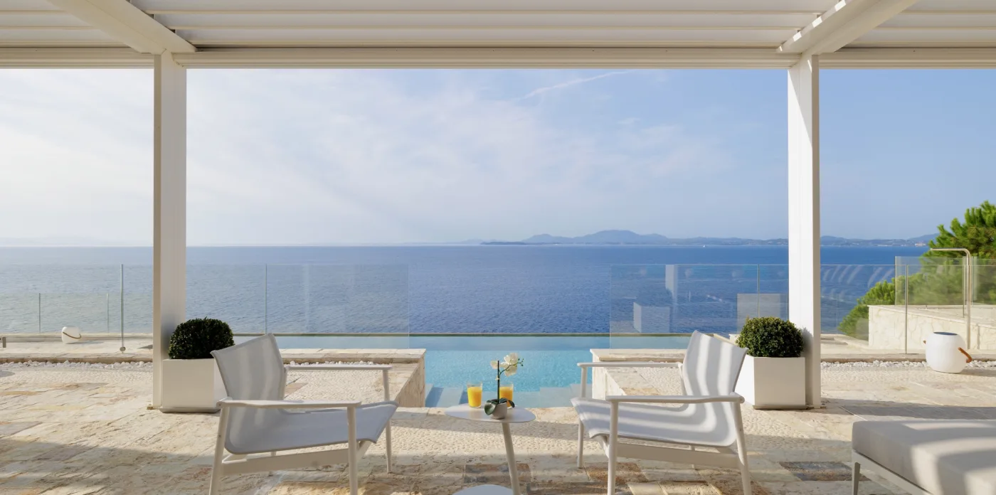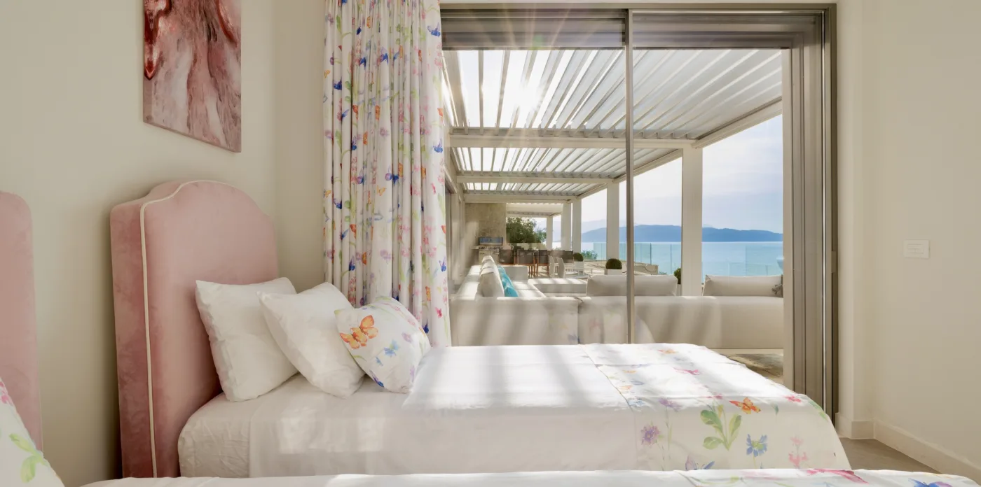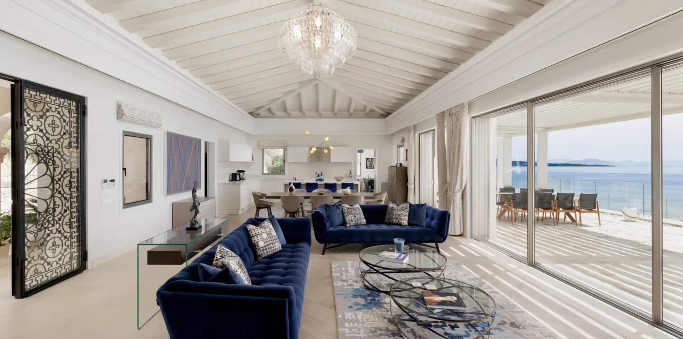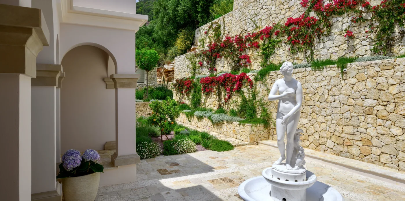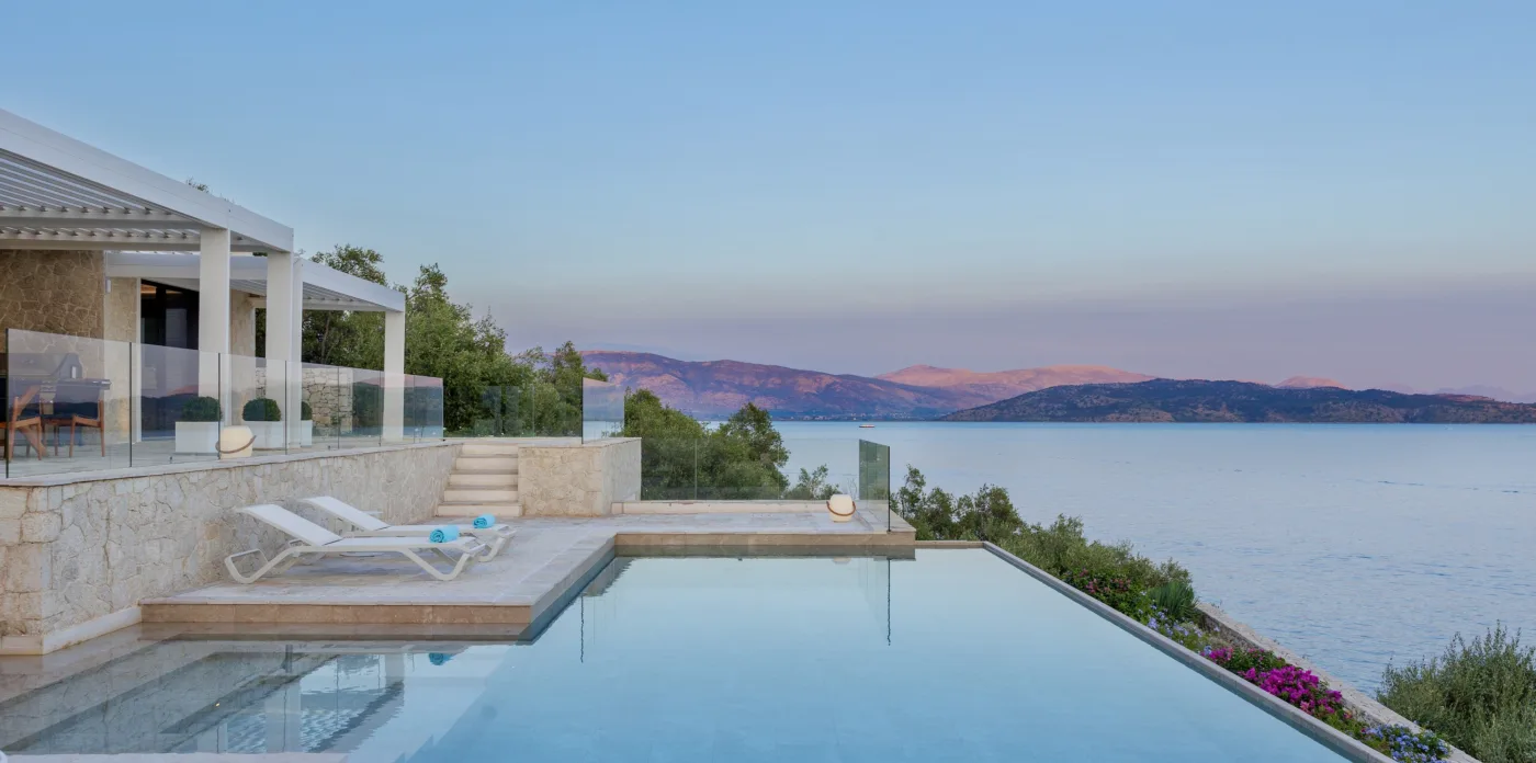 Located in Agni, Ayline is situated just a brief stroll from the picturesque bay and its famous beachfront restaurants. The villa showcases a unique blend of Corfiot and Venetian architectural influences fused with modern aesthetics. Two distinctive features are the windows that amplify the panoramic views and the stone used on the façade and exterior walls, which was sourced directly from the property’s grounds. Each stone was meticulously hand-shaped by a skilled craftsman and fitted together like pieces of an intricate puzzle.