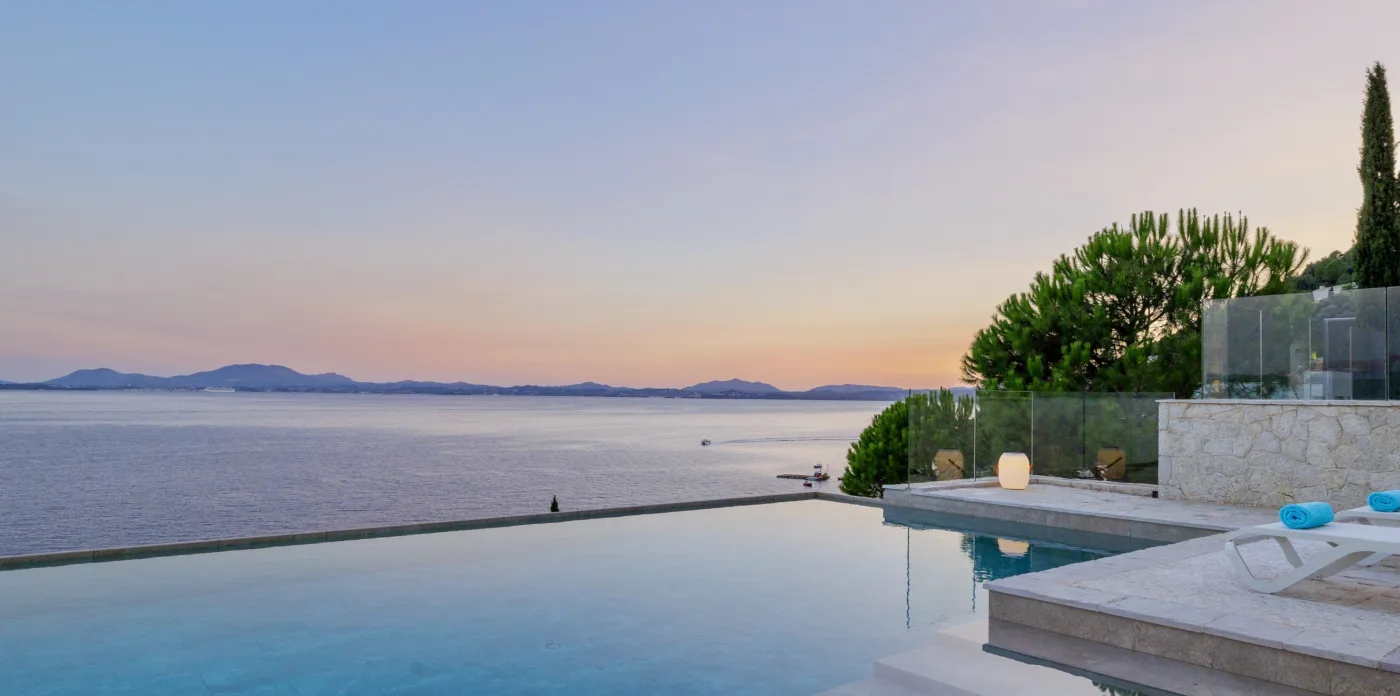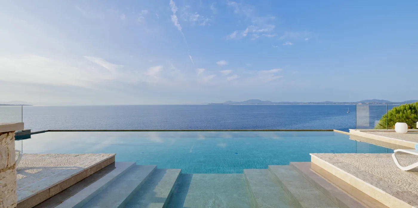 The infinity pool, strategically situated, gives the illusion of merging as one with the sea offering a sense of infinite space. Steps from the pool area lead first to a yoga and meditation spot with a panoramic sea view, followed by a waterside deck designed for sunbeds and access to the boat jetty.