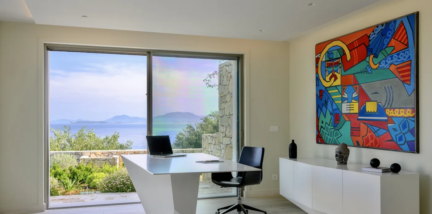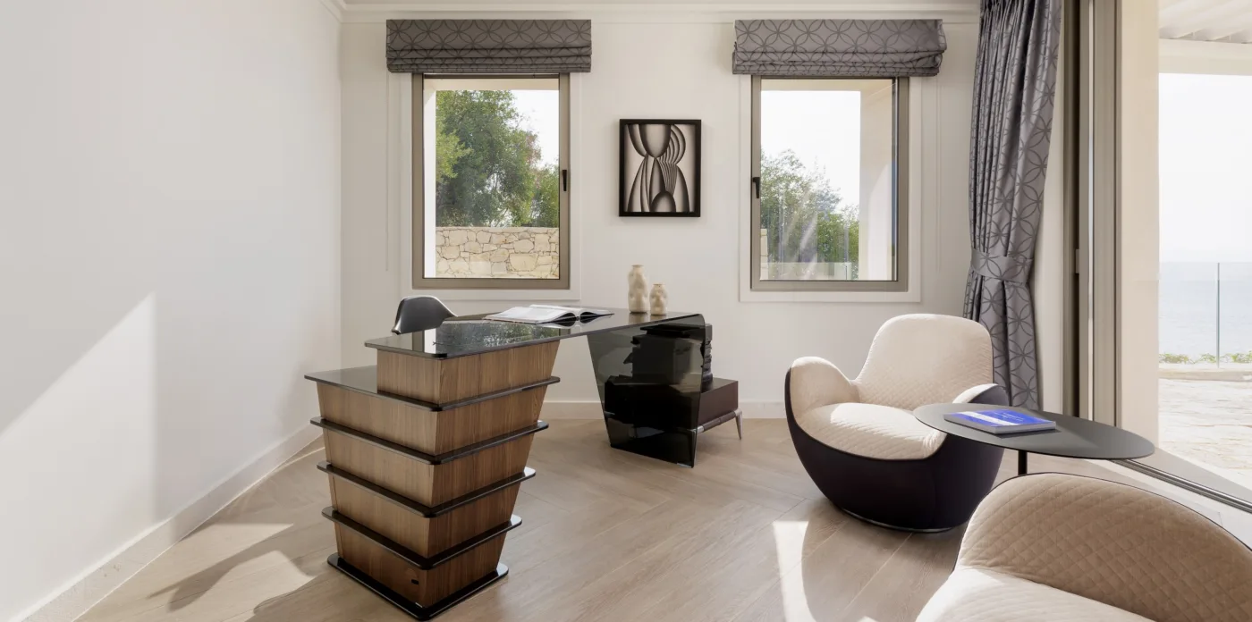 Initially planned for nine bedrooms and seven bathrooms, the property has been modified and currently consists of six exceptionally comfortable and impeccably designed bedrooms. The remaining three rooms have been repurposed to meet various needs. One of the rooms now serves as a spacious office with its own private entrance, offering panoramic views of the surroundings. Another room has been transformed into a gym, with stunning sea vistas and lastly, the third room serves as an additional office or library area.