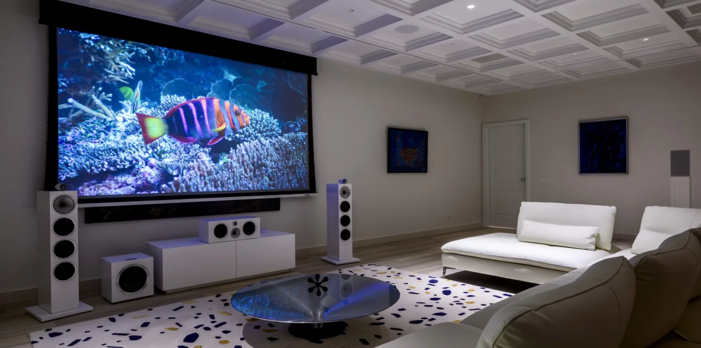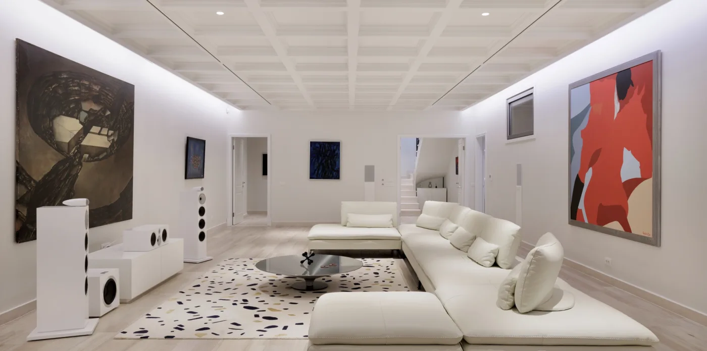 On the lower ground floor, you’ll be captivated by the artistic atmosphere of the dual-purpose space—a dynamic art gallery meticulously designed to replicate a museum ambiance, allowing for the effortless rotation and change of exhibited art. At the push of a button, the room turns into a cutting-edge home cinema featuring state-of-the-art audio-visual systems for a cinematic experience rivaling that of a professional theater.