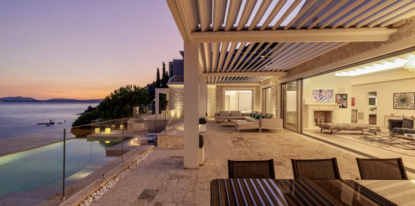 Ayline is surrounded by an expansive Mediterranean garden unveiling a wide variety of flora, including over 50 olive trees and more than 100 diverse species of flowers, shrubs, and trees such as fig, pistachio, pine, pomegranate, jacaranda, lemon, orange, robinia, and kumquat. The abundant stone terracing across the property provides delightful outdoor living spaces. The pool area features 285sqm of terraces, some of which is covered by automatic bioclimatic pergolas. These areas provide an ideal relaxation and open-air dining setting while immersing in the picturesque views.
