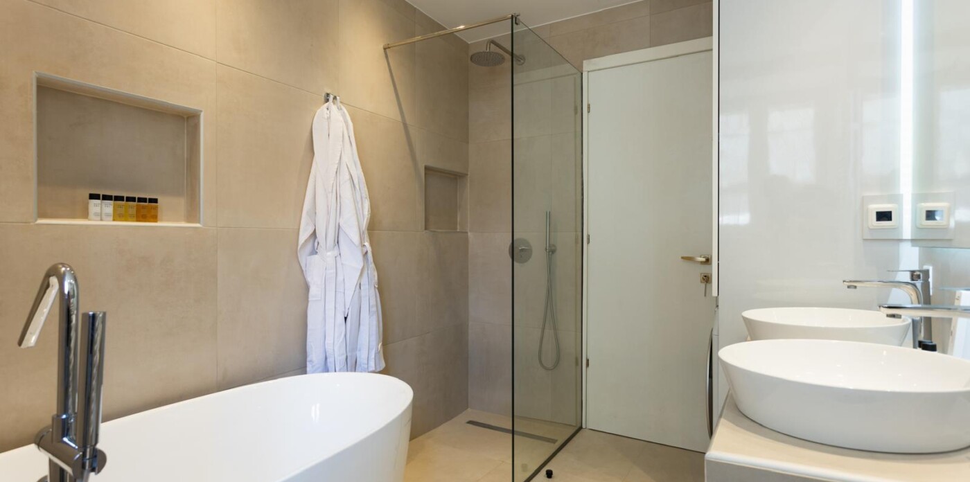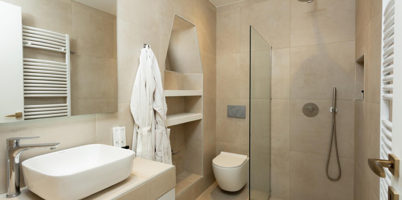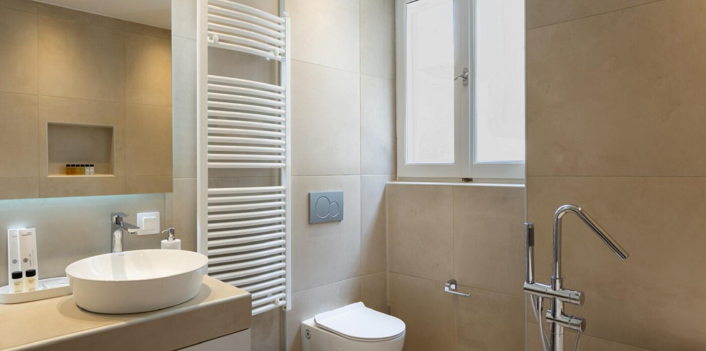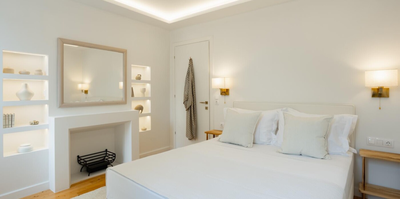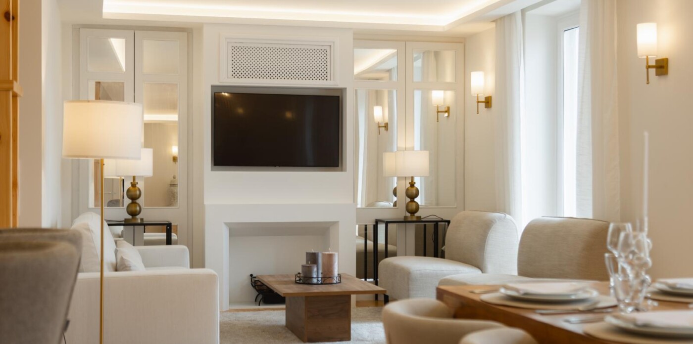 The apartment has three beautifully designed bedrooms, including a master suite with a decorative fireplace that adds a touch of historic charm. Two stylish bathrooms provide modern conveniences; one features his-and-hers sinks, a bathtub, and a walk-in shower, ensuring comfort and ease for families or groups.