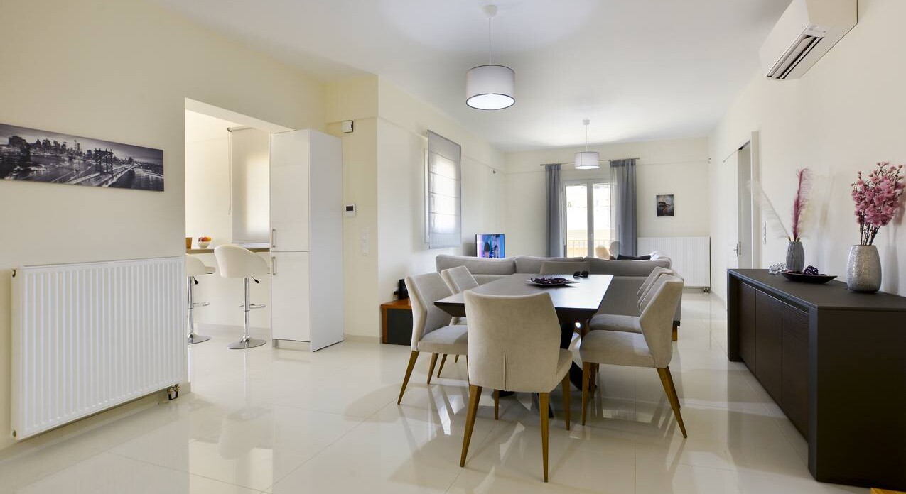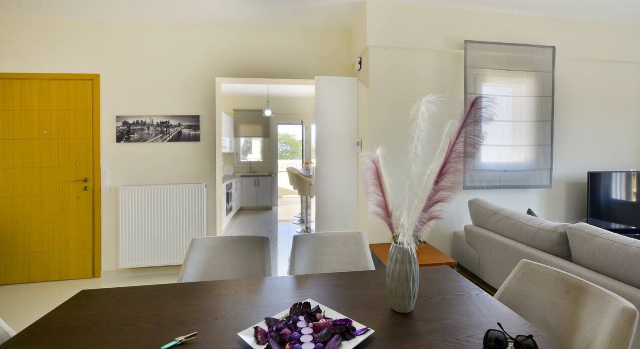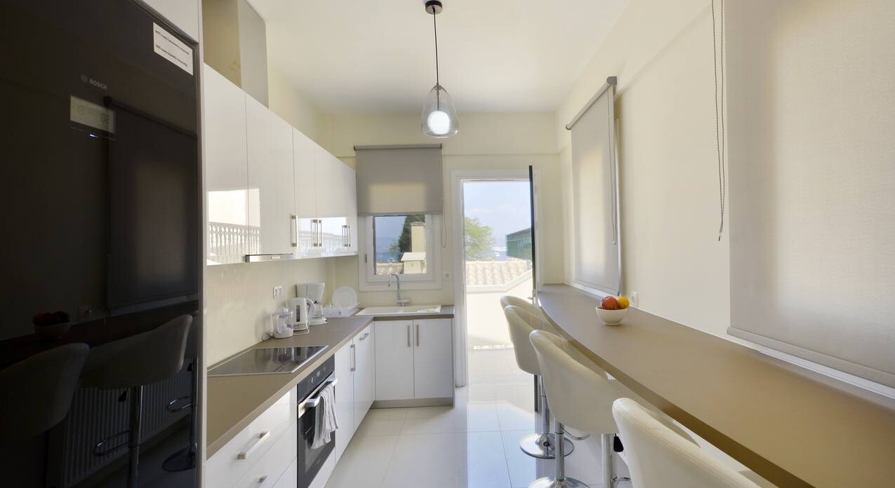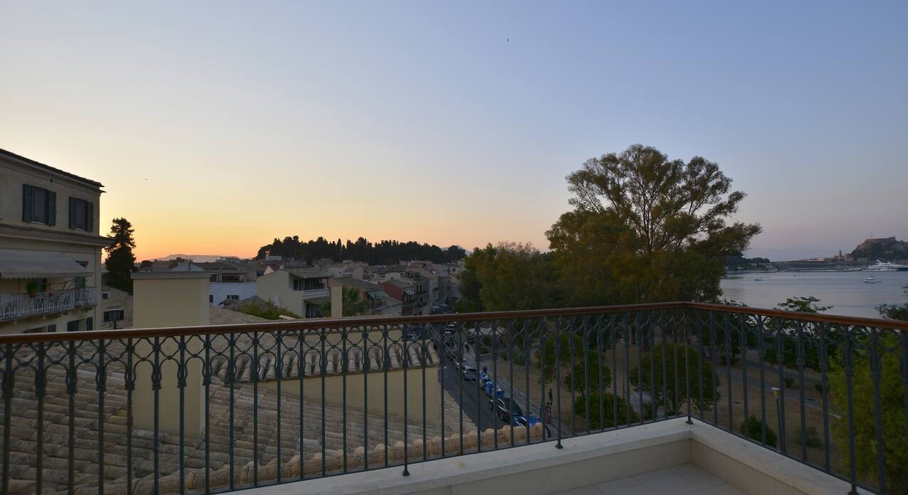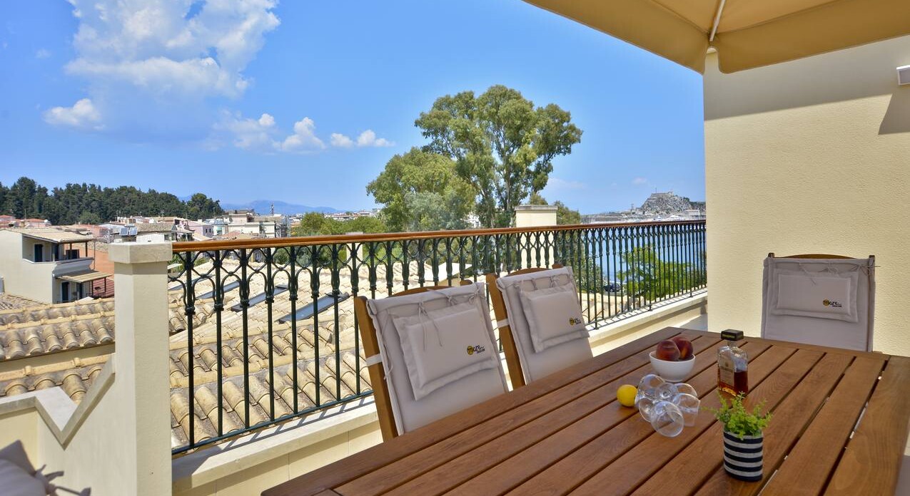 Cassius, accessible by elevator or an elegant marble staircase, unfolds into a generous living and dining space. Expansive balcony doors frame panoramic sea views from private balconies on both sides. The kitchen, adjacent to the dining area, opens onto a wide veranda, offering a sun-drenched 180-degree vista of Garitsa Bay.