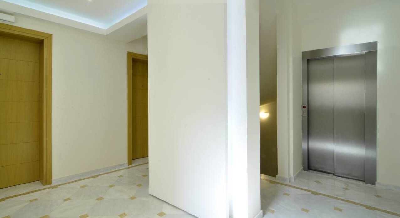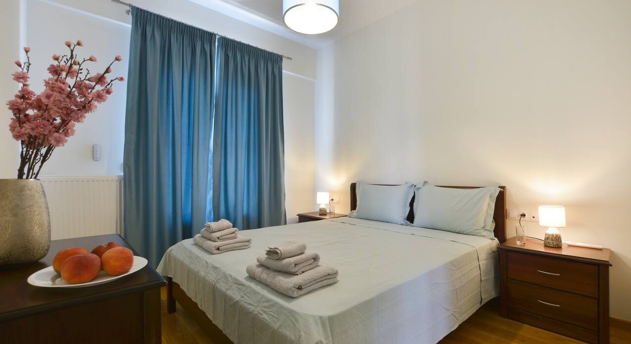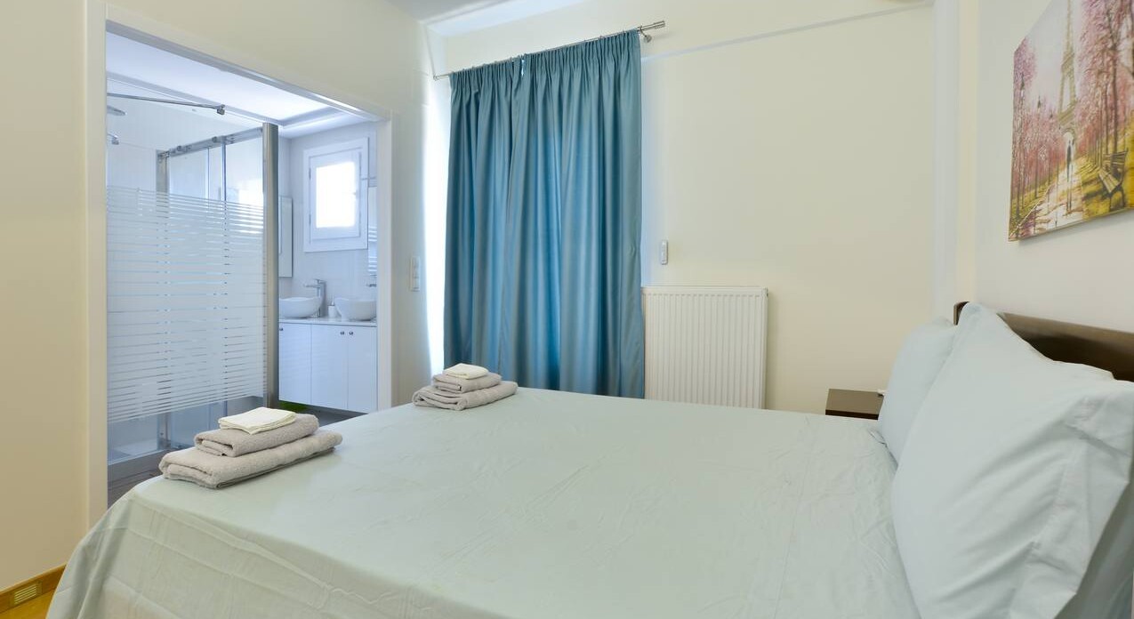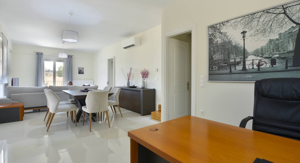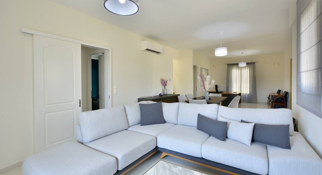 Cassius, accessible by elevator or an elegant marble staircase, unfolds into a generous living and dining space. Expansive balcony doors frame panoramic sea views from private balconies on both sides. The kitchen, adjacent to the dining area, opens onto a wide veranda, offering a sun-drenched 180-degree vista of Garitsa Bay.